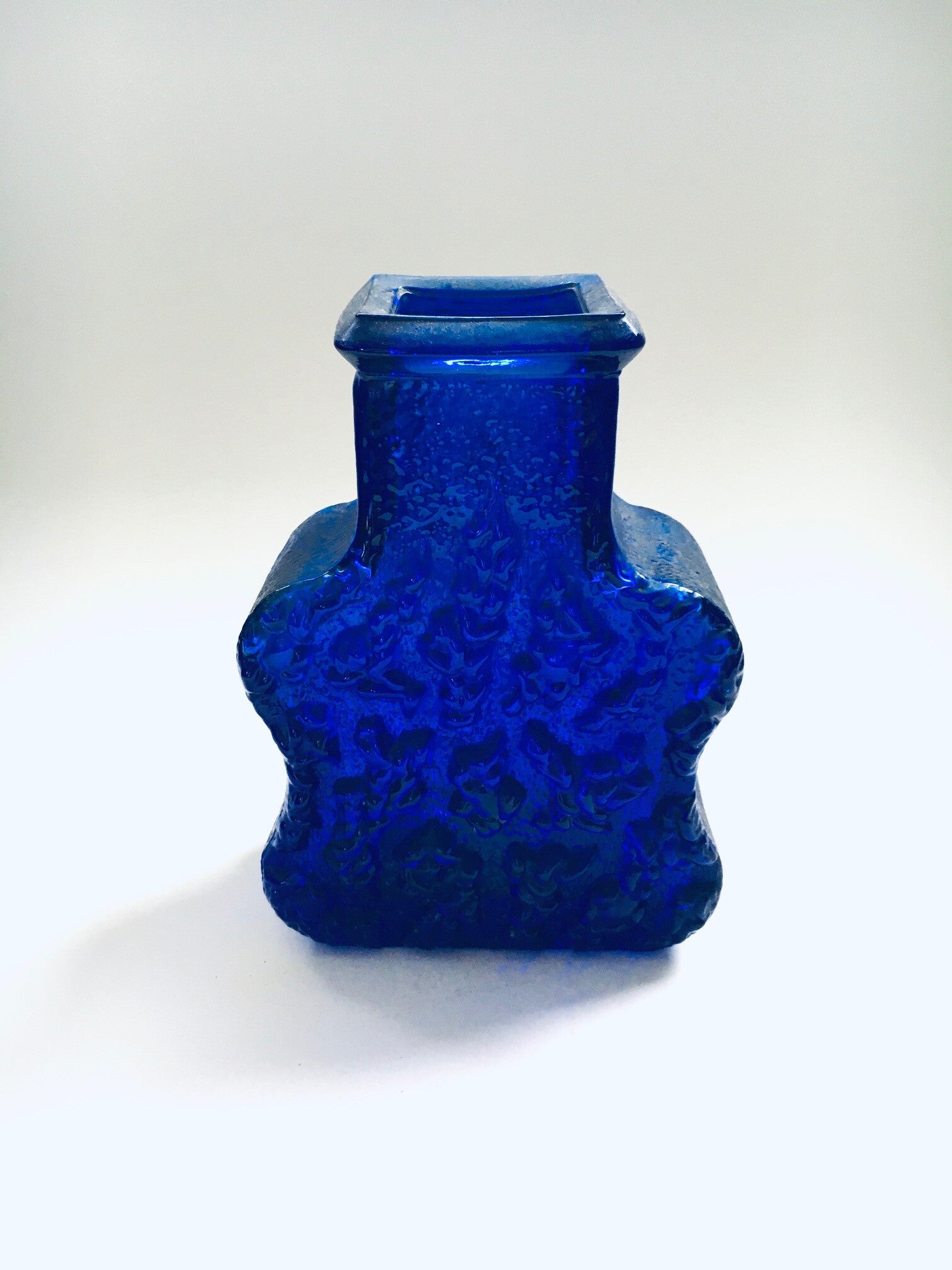 Vintage Midcentury Modern Scandinavian Design Blue Glass Vase, Finland 1960's. Deep blue pressed ice or bark structure glass vase, in very good condition. Measures 17,5cm x 13cm x 7cm.
