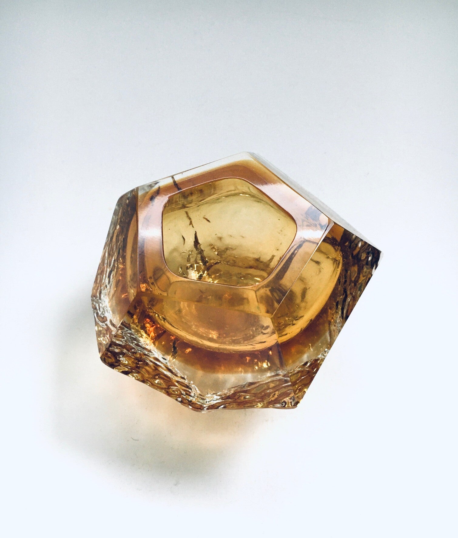 Vintage Midcentury Modern Design Art Glass Bowl Vide-Poche by Mandruzzato, Sommerso, Murano Italy 1960's. In perfect condition. Beautiful amber and yellow layered glass. Facet cut on the top parts. Measures 13cm x 13cm x 8cm.