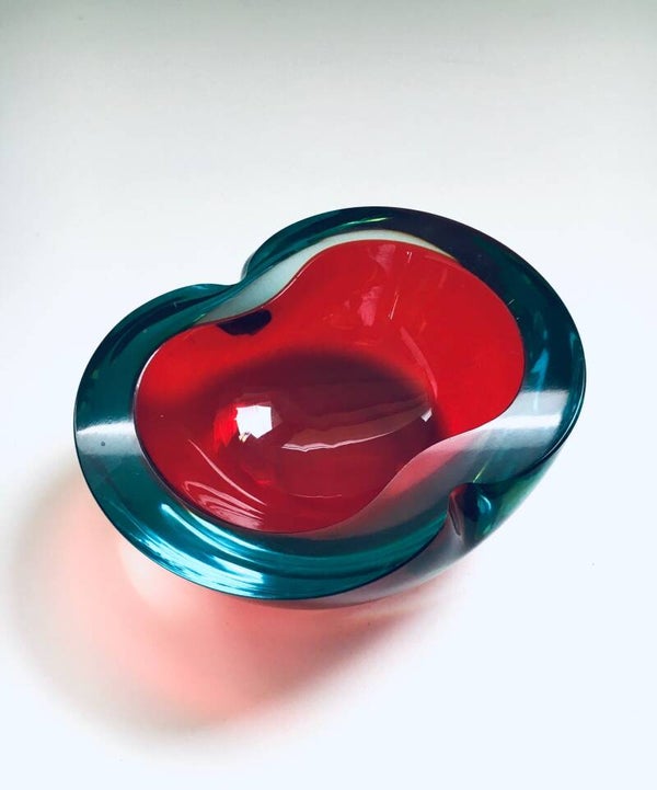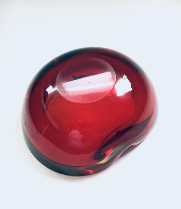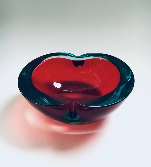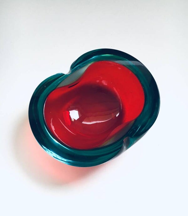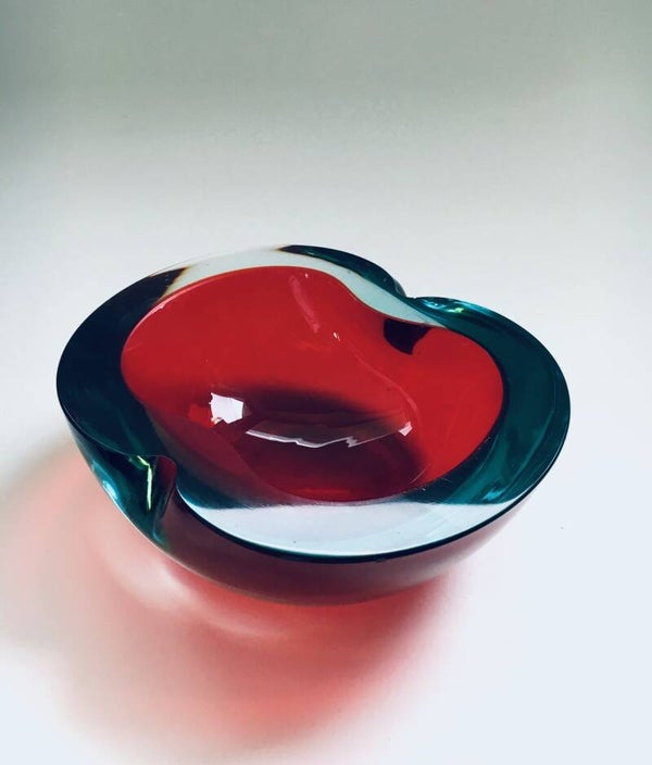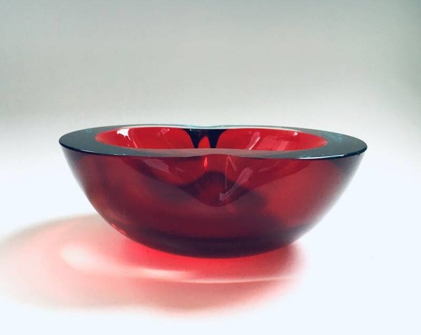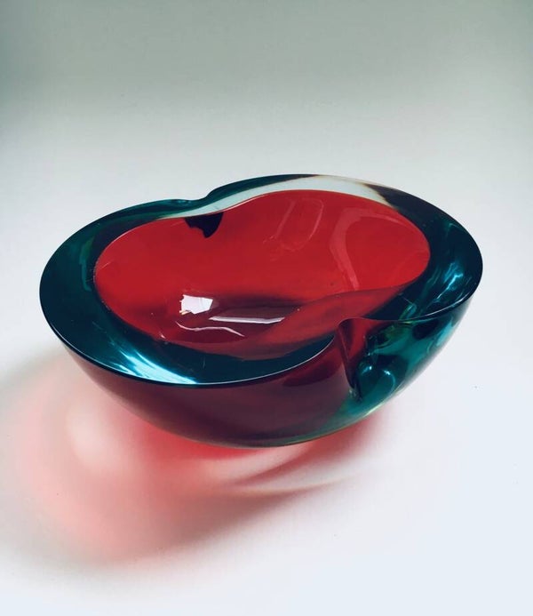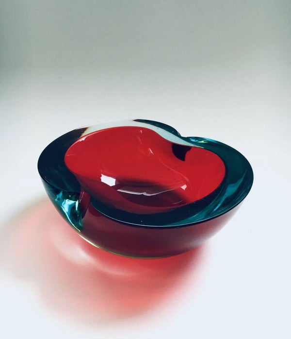 Vintage Midcentury Modern Art Glass vide-poche bowl in Sommerso manner by Flavio Poli, Murano Italy 1960's. Beautiful heavy glass bowl in intense red with green. Flat polished at top. One of a kind art glass. In very good condition. Measures 17,5cm x 14,5cm x 6,5cm.