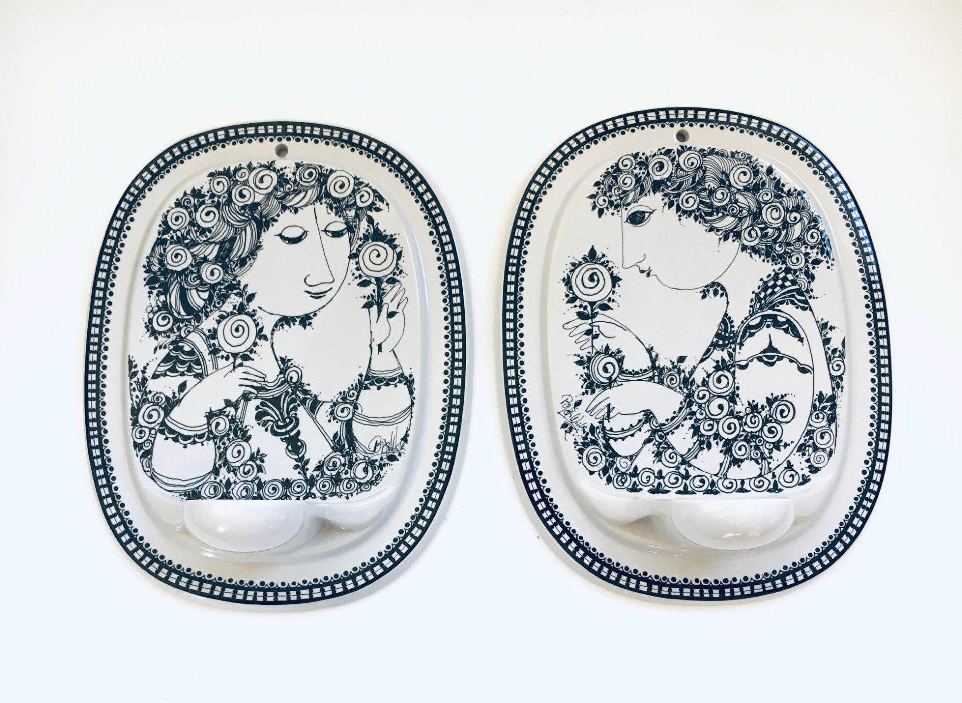 Vintage Art Ceramics Rosenthal Studio Linie "Die Maikönigin" wall candle holder set of 2 by Bjorn Wiinblad, 1970's Germany. Printed porcelain ceramic wall pieces in white and black. Both are in very good condition. Each measures 27,5cm x 21,5cm x 9cm.