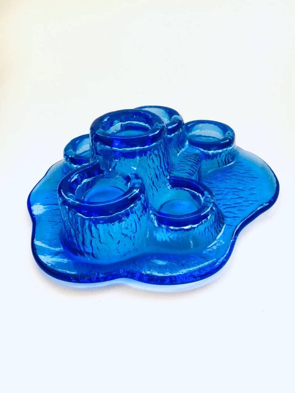 Vintage Midcentury Modern Scandinavian Design Ice Glass Candle Holder Island, Finland 1970's. Blue pressed ice structured glass. Holds 6 tea light wax candles. In perfect condition. Measures 9,5cm x 29cm x 25cm.