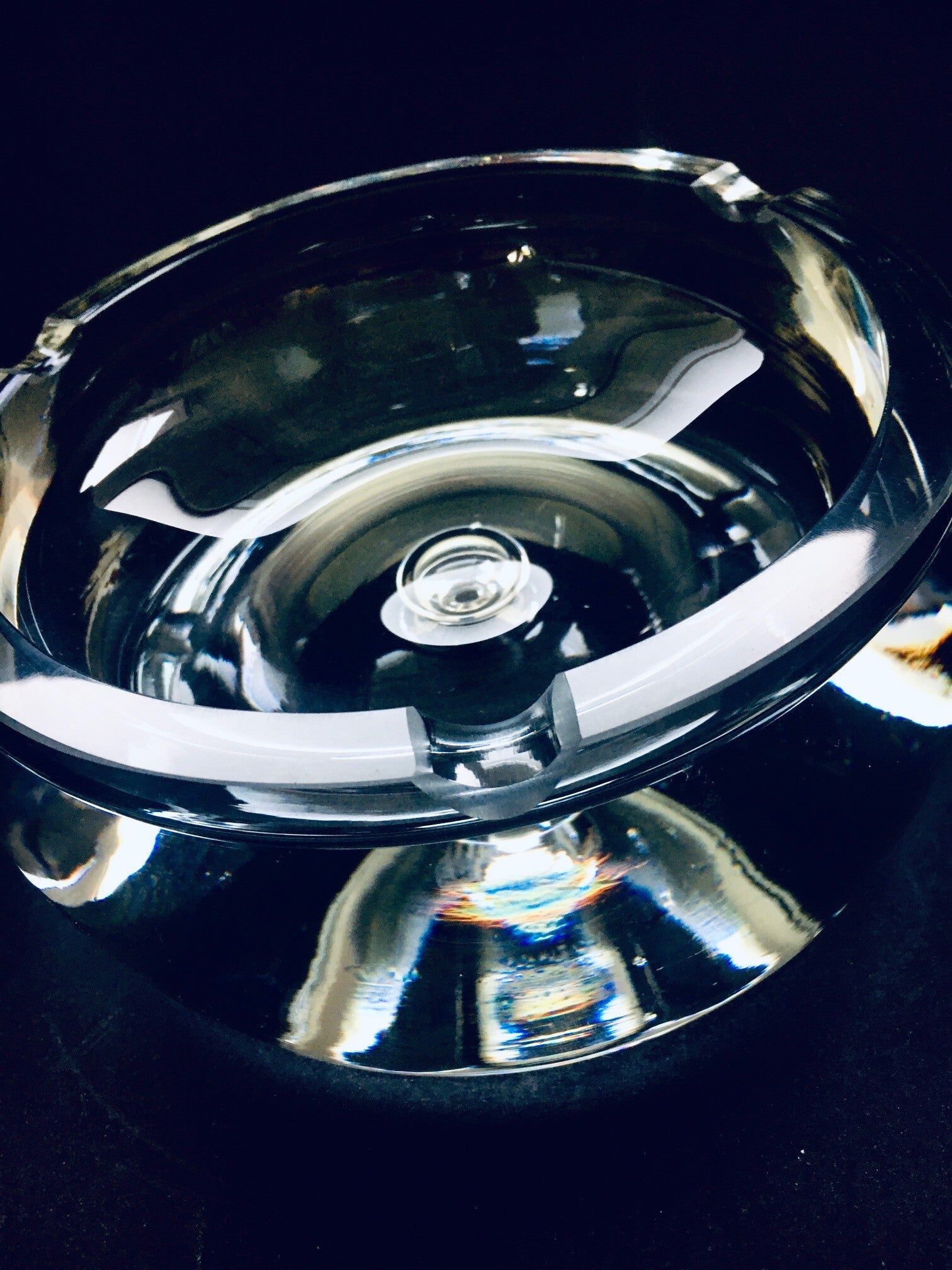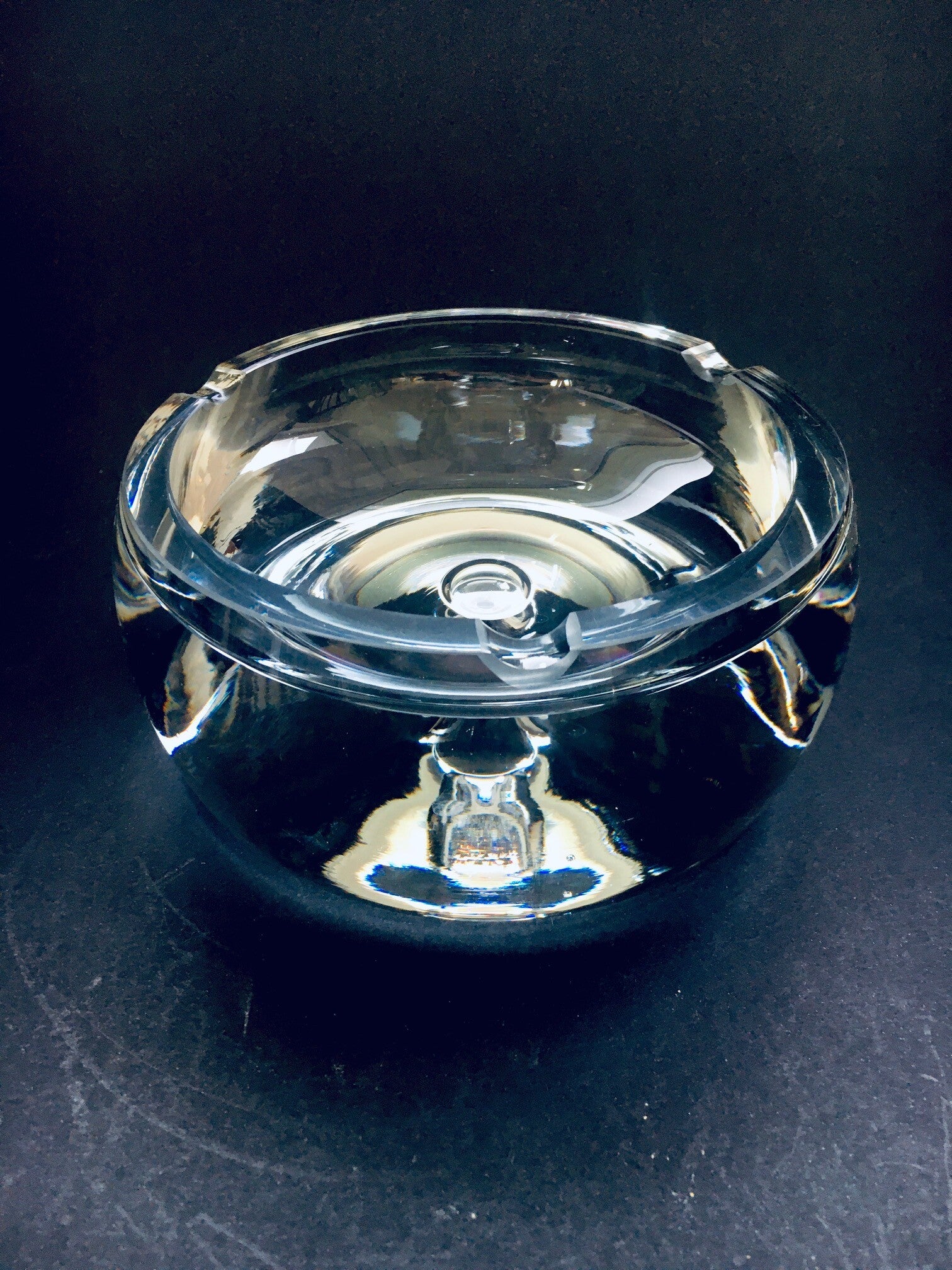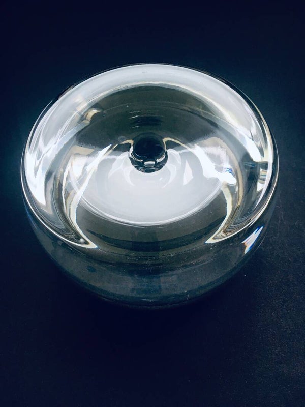 Vintage Postmodern Design heavy crystal glass ashtray bowl, vide-poche by Krosno, Poland 1980's. Heavy press molded crystal glass with bubble in the middle. In perfect condition. WIth original label. Measures 8cm x 18cm x 18cm.