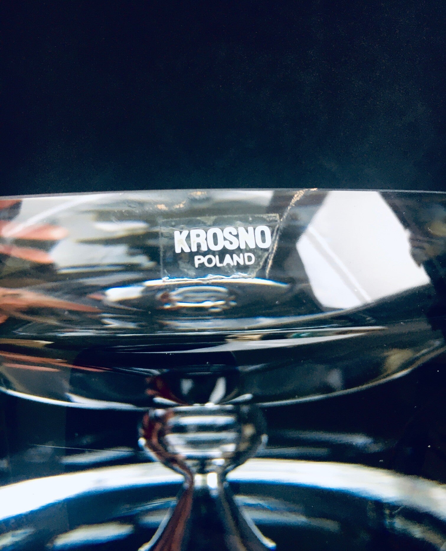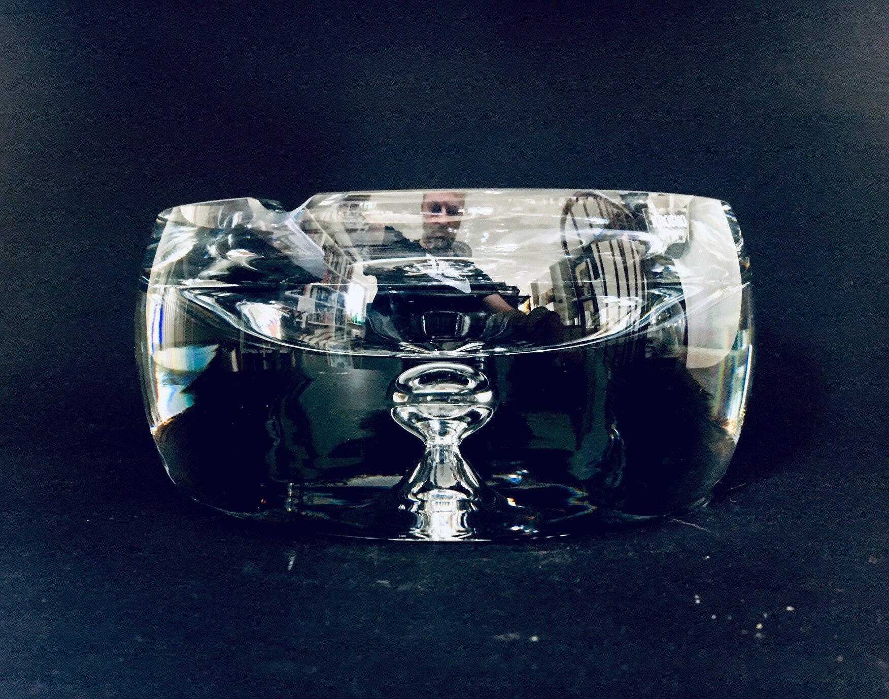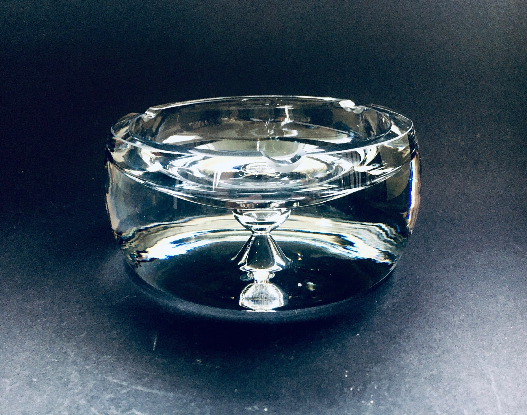 Vintage Postmodern Design heavy crystal glass ashtray bowl, vide-poche by Krosno, Poland 1980's. Heavy press molded crystal glass with bubble in the middle. In perfect condition. WIth original label. Measures 8cm x 18cm x 18cm.