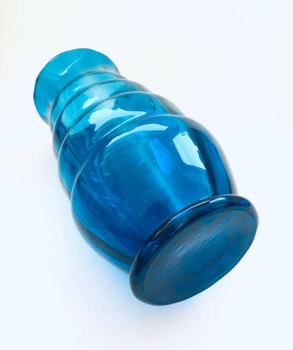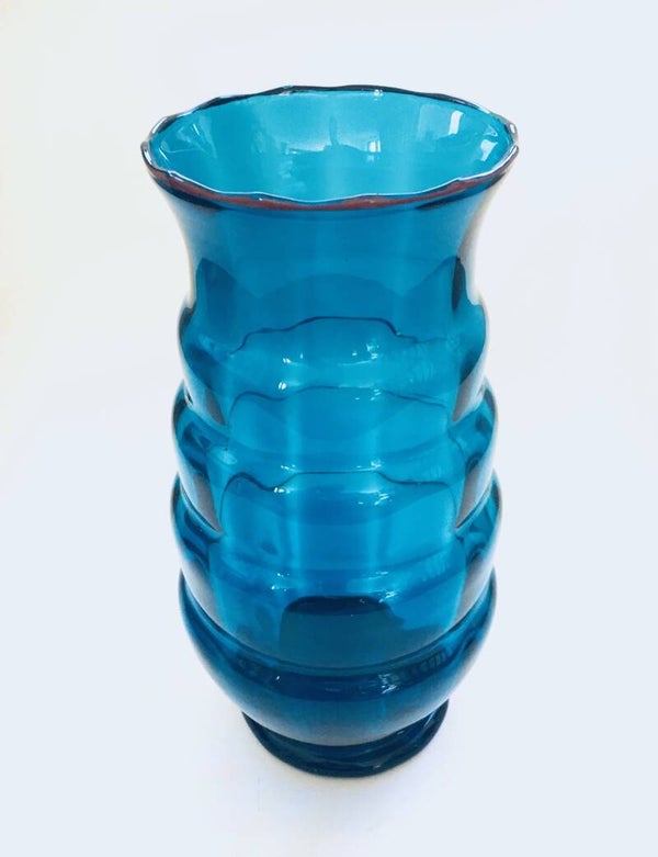 Vintage Art Deco Design blue glass hooped vase with red trim. Made in France, 1930's. Blown molded blue vase. In very good condition. Measures 27,5cm x 14,5cm x 14,5cm.