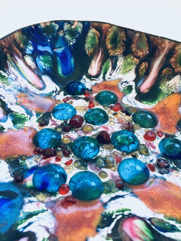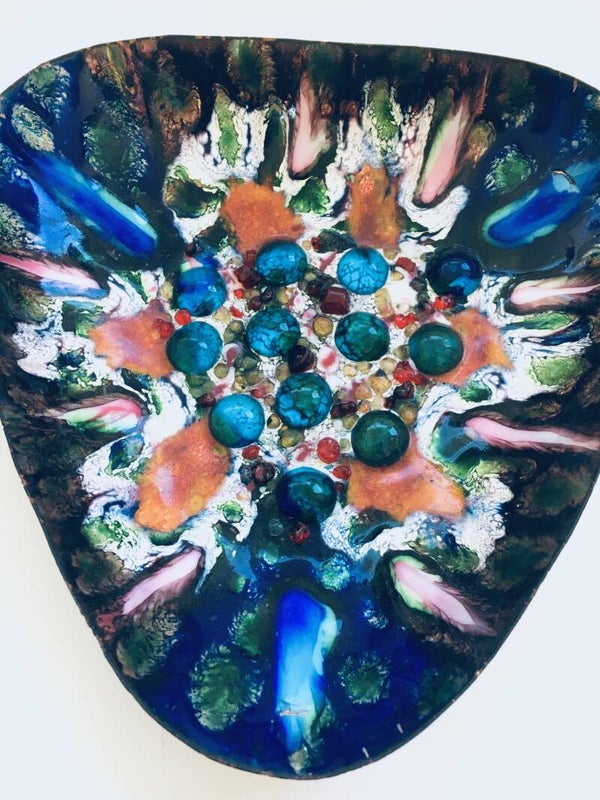 Vintage Midcentury Modern Italian Handmade enameled copper & glass inlay bowl. Italy 1960's. Multicolor enameling on copper base with glass particals inlay. Psychedelic in style. In very good condition. Measures 4,5cm x 22cm x 22cm.