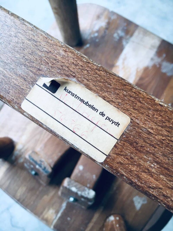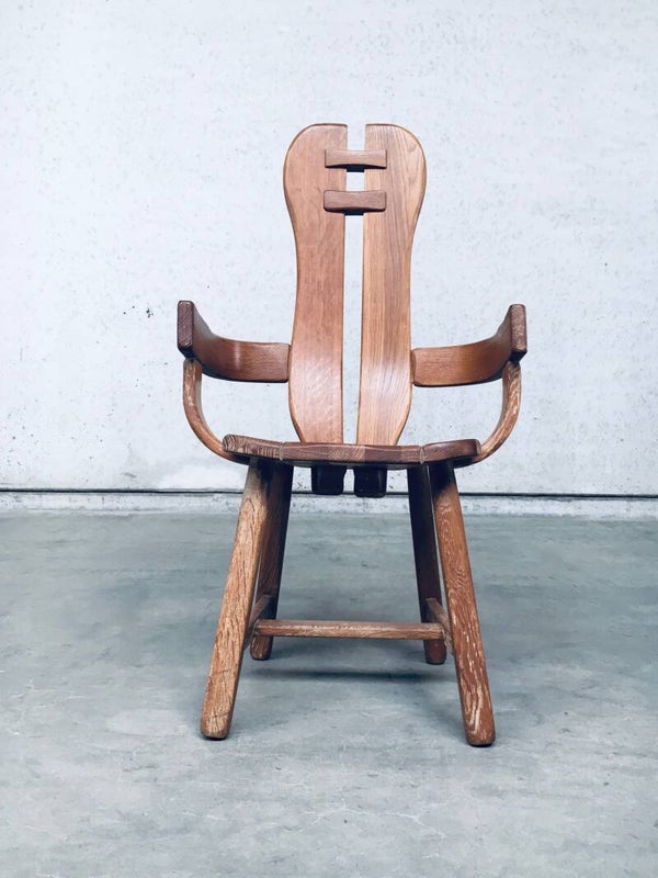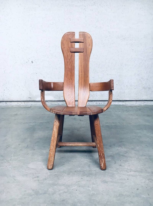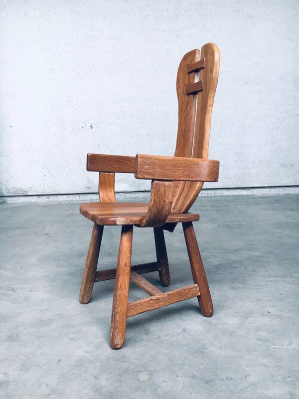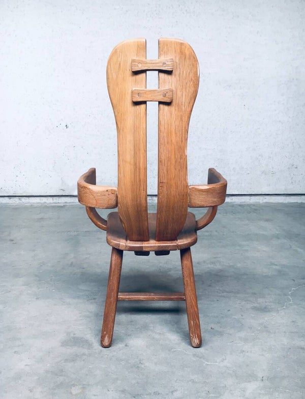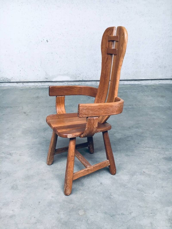 Vintage Brutalist Design Oak High Back Dining Arm Chairs by Kunstmeubelen De Puydt, Belgium 1960's. All solid oak wood artisan made chair. This comes in very good condition. Sturdy heavy chair. This is rather rare, as they were made in small numbers and only sold in Belgium. Chair measures 112cm x 59cm x 51cm.