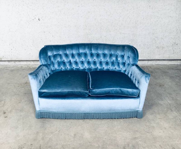 Vintage Midcentury Hollywood Regency Style Velvet 2 Seat Sofa with fringe in Baby Blue, Belgium 1950's. Buttoned back with real goose feather cushions. Feet are also covered in velvet fabric. In very good original condition. Measures 78cm x 136cm x 82cm.
