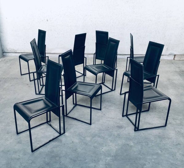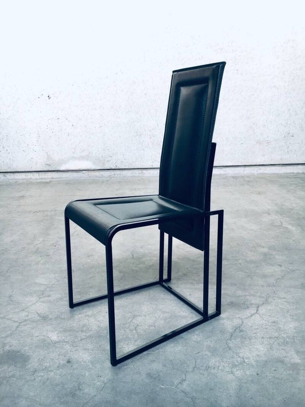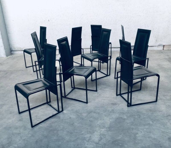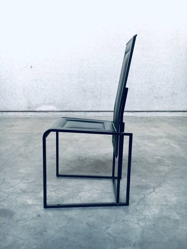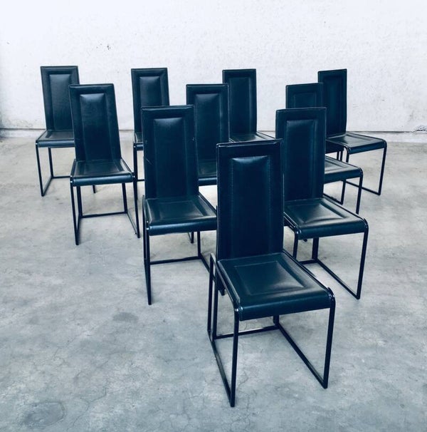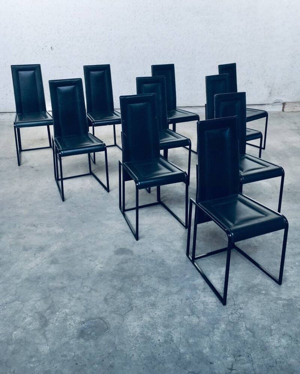 Vintage Postmodern Modern Architectural Design set of 10 Dining Chairs, made in Italy 1980's. Black leather seat and back rest on black laquered metal architectural square shaped base. All chairs are in good to very good condition. No maker markings. Each chair measures 95,5cm x 40cm x 49cm.