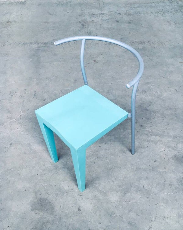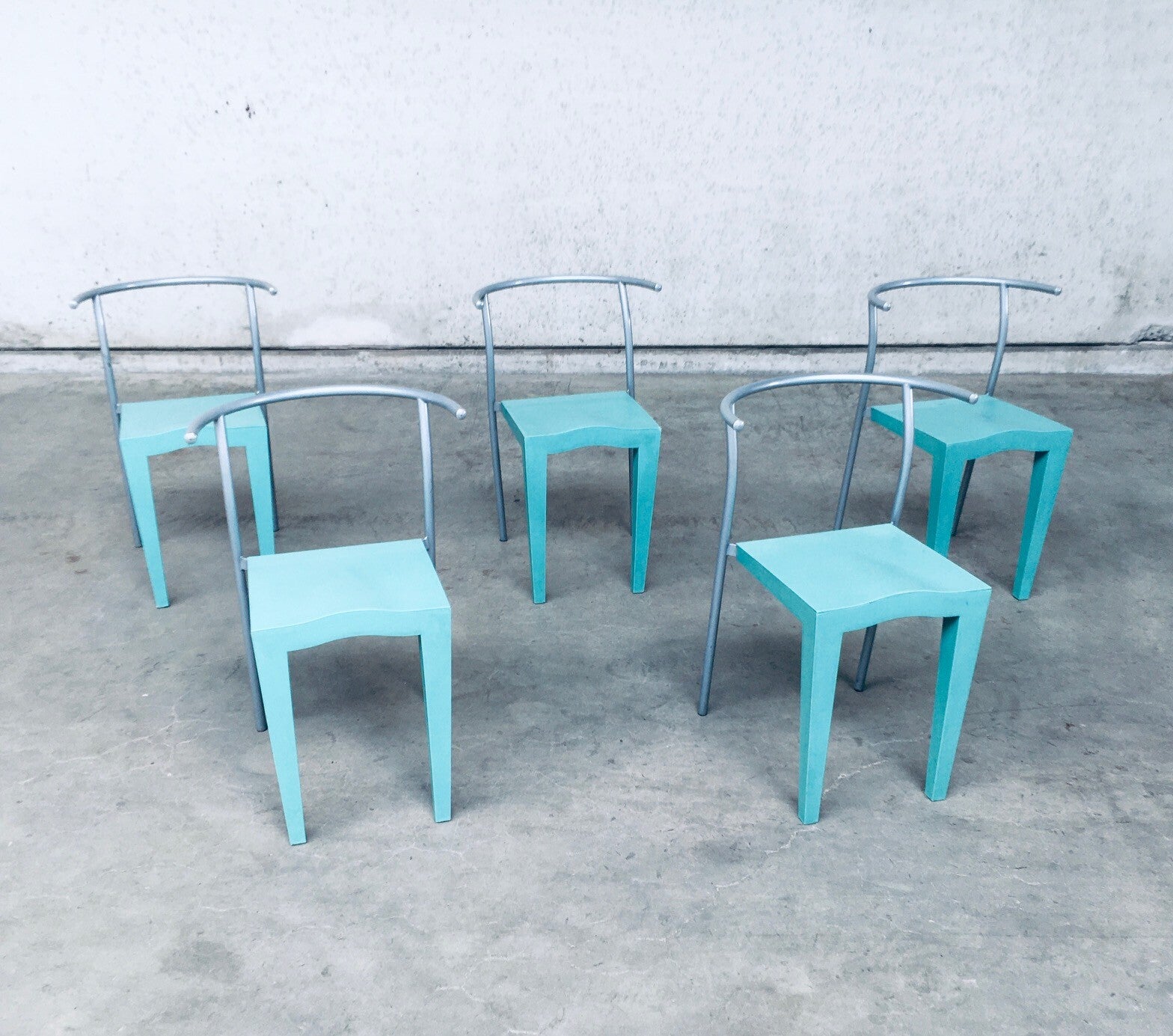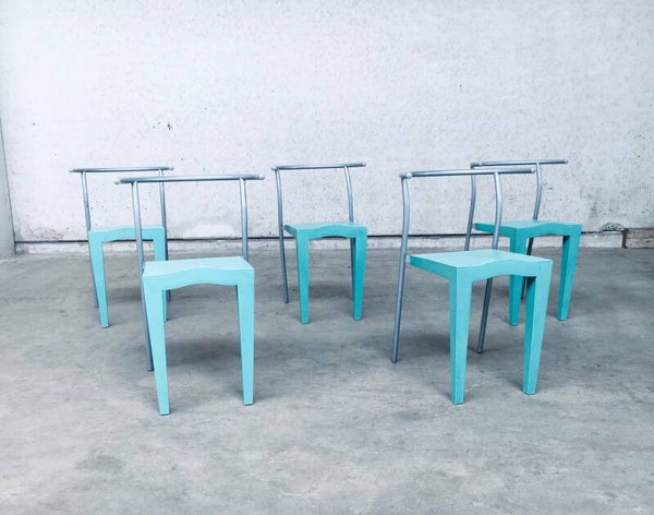 Postmodern Modern Design "Dr. Glob" Dining Chair set of 5 by Philippe Starck for Kartell, Italy 1988. Turquoise frosted matt plastic with grey laquered metal back. All chairs in good condition. Each chair measures 72cm x 48cm x 46cm.