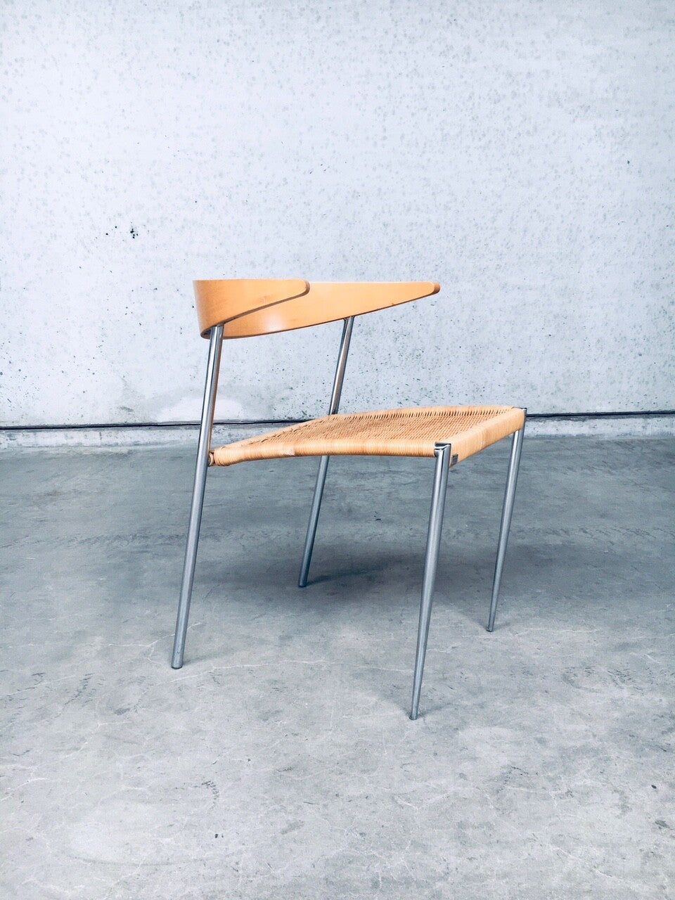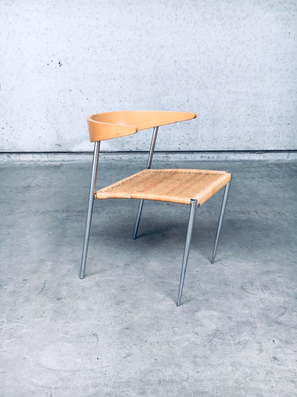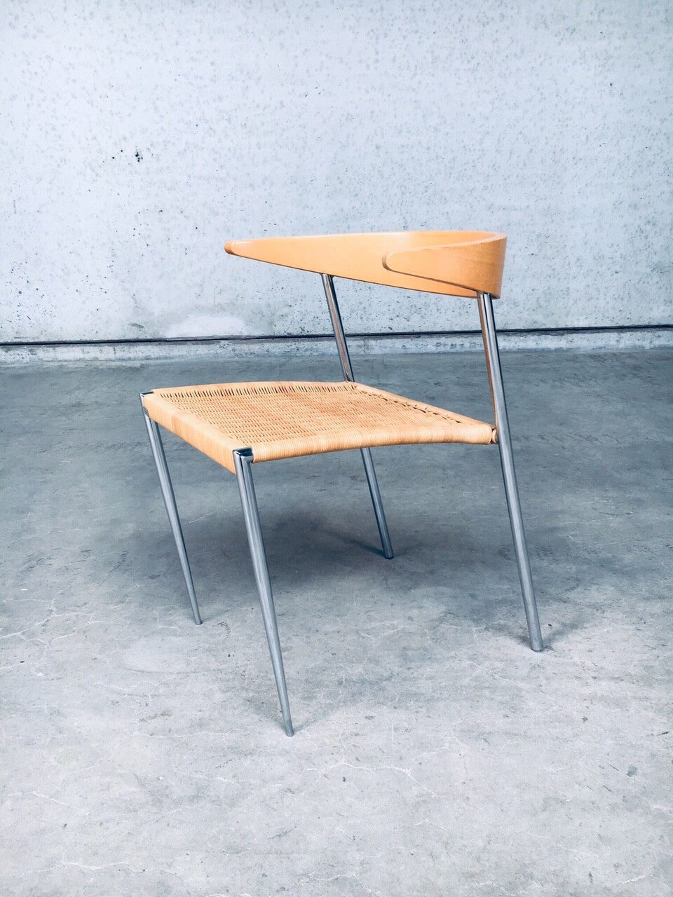 Postmodern Modern Design Dining Chair by Pierantonio Bonacina, Italy 1990's. Steer head bend pressed wood back with rattan seat on chrome metal base. With original metal label. Cool slanted shaped chair in very good condition. Measures 69,5cm x 53cm x 51cm.