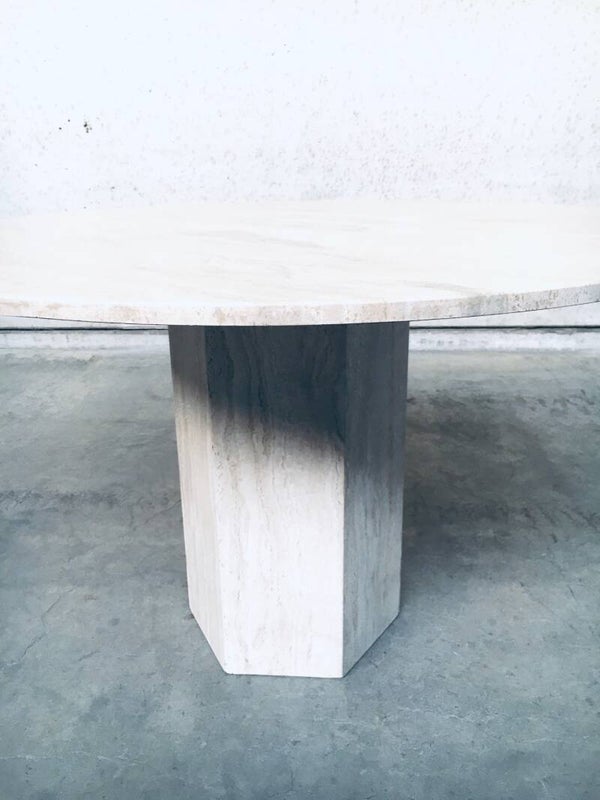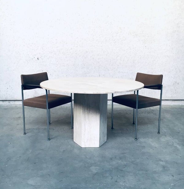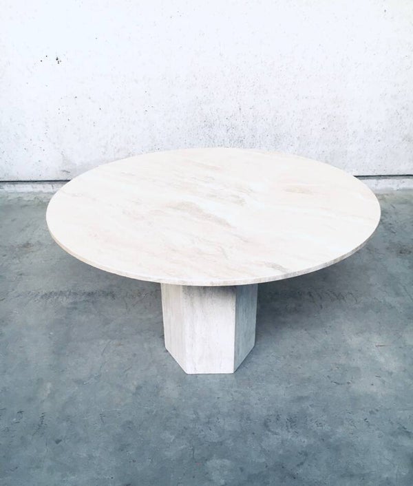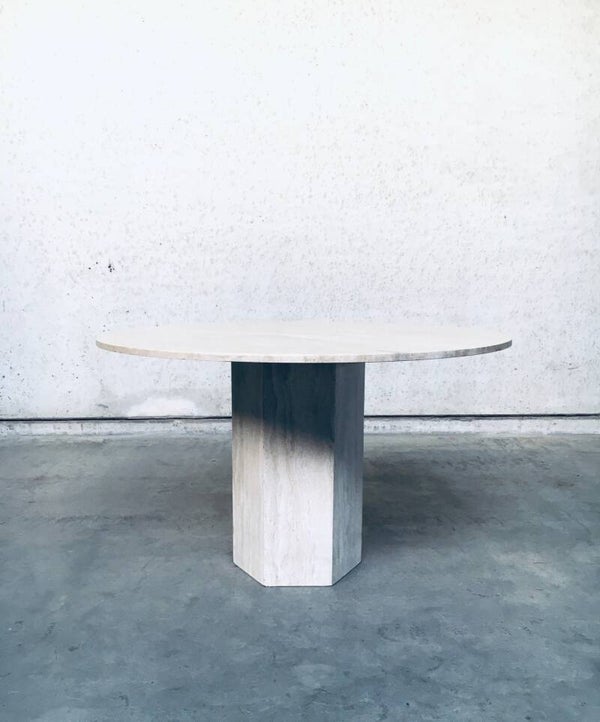 Postmodern Modern Design Round Dining Table in Travertine Marble, Italy 1970's. Round travertine marble top on hexagonal travertine base. Comes in very good condition. Measures 74cm x 120cm x 120cm. (chairs seperate for sale)