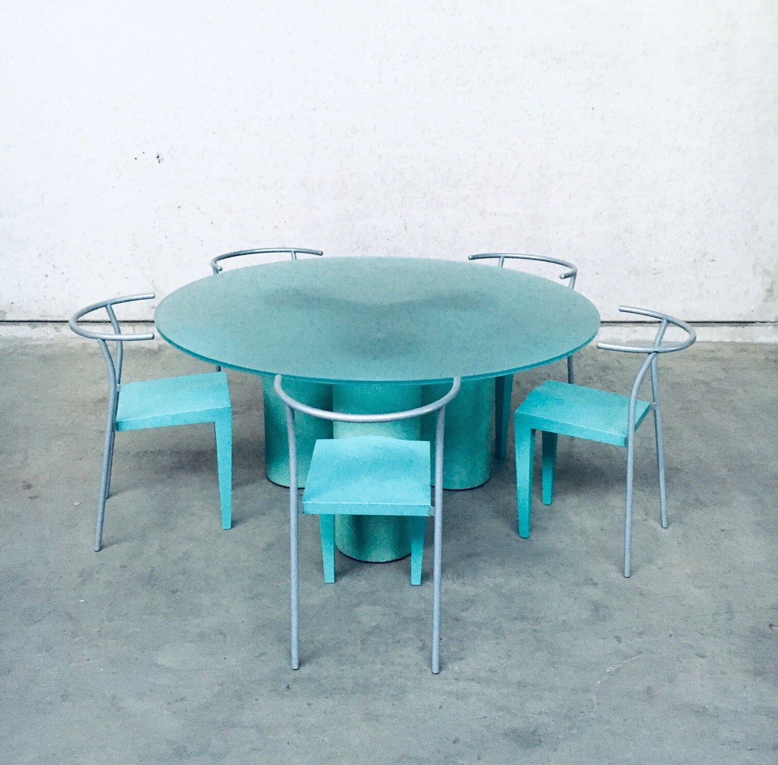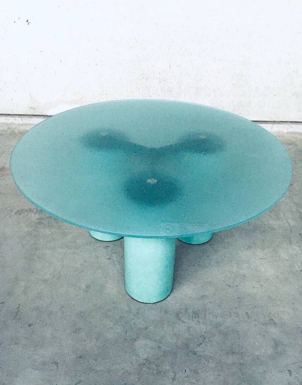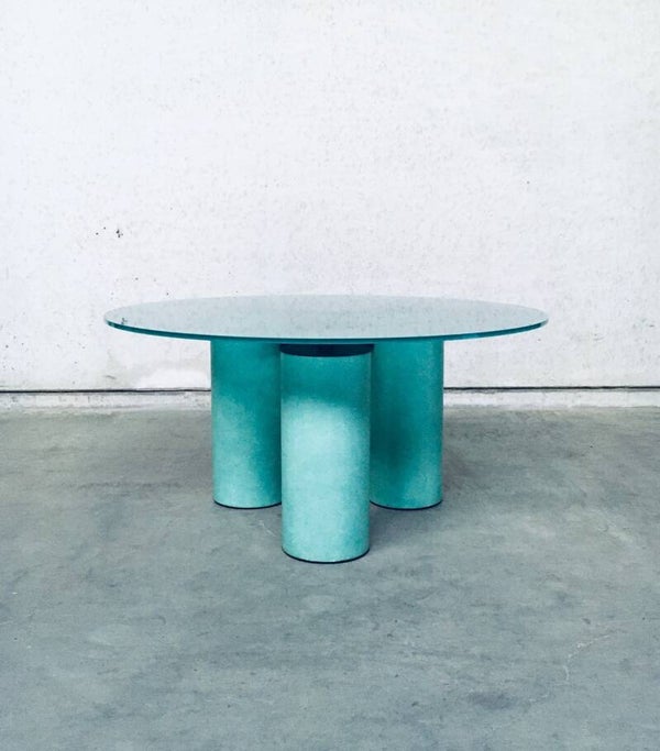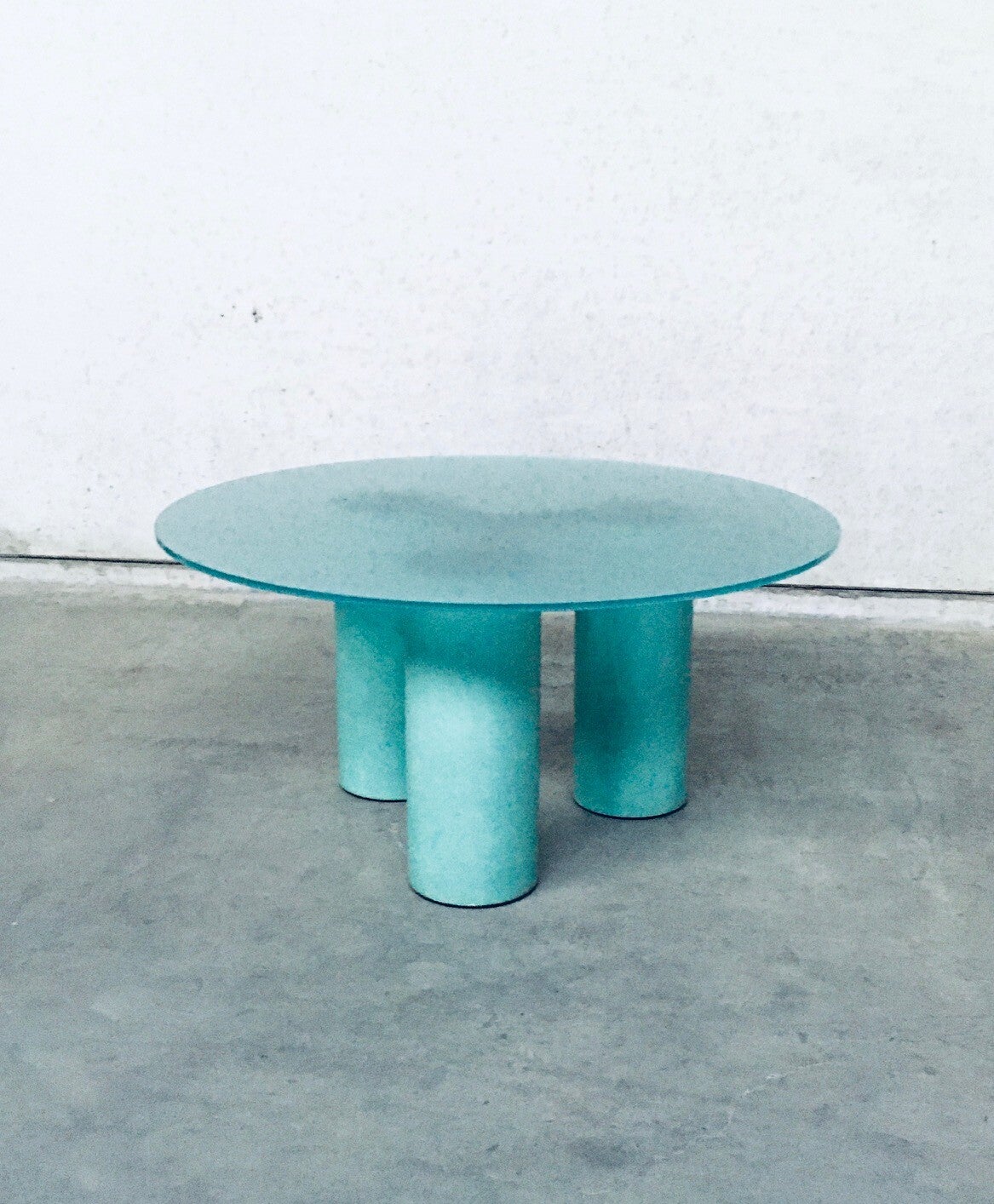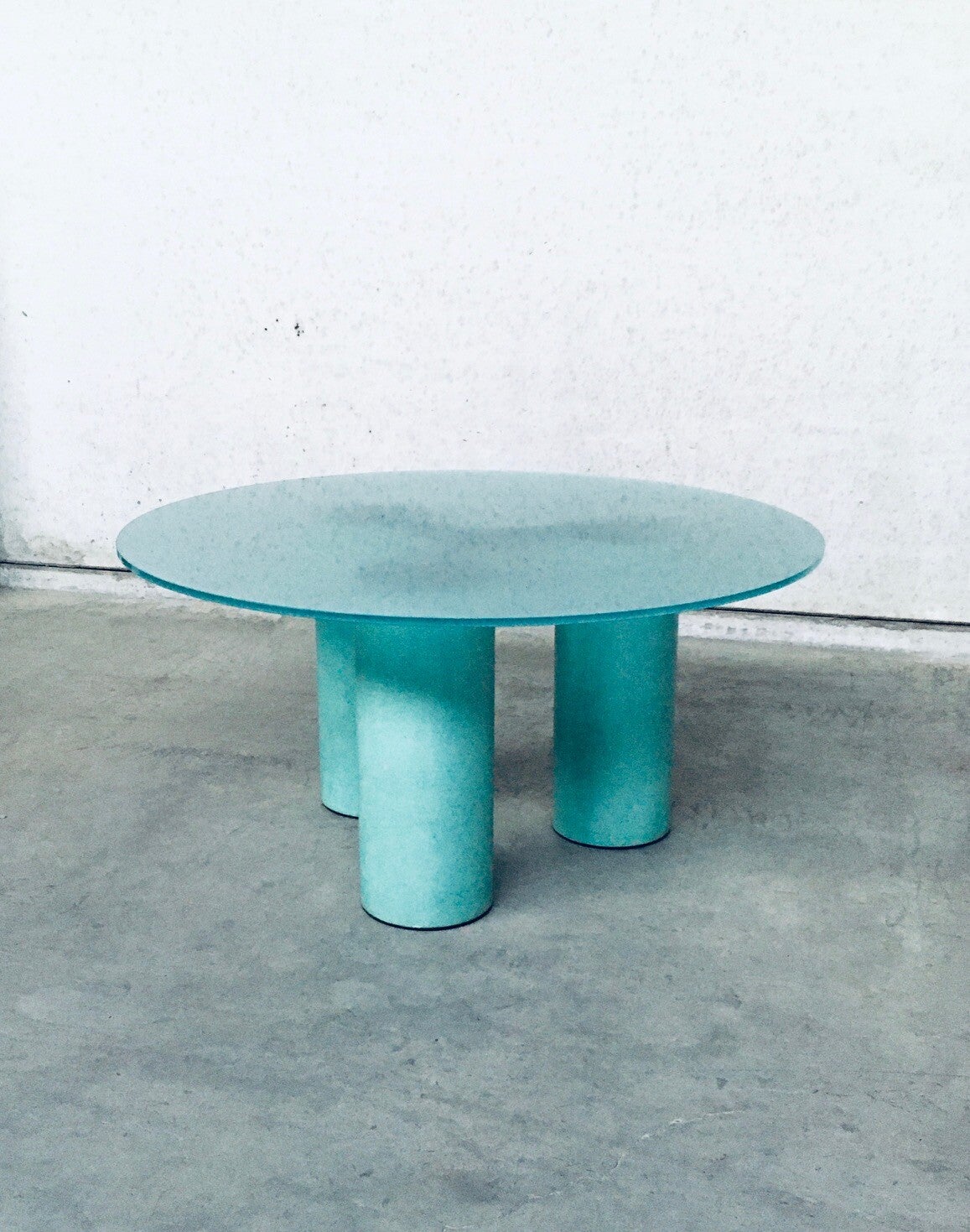 Postmodern Modern Architectural Design "Serenissimo" Round Dining Table by Lella & Massimo Vignelli, David Law for Acerbis International, Italy 1980's. 3 round metal turquoise green laquered feet with grey metal laquered support for round matt frosted heavy glass top with 3 inserted supports in the glass. All original awesome table in very good condition. Measures 71,5cm x 145cm x 145cm.