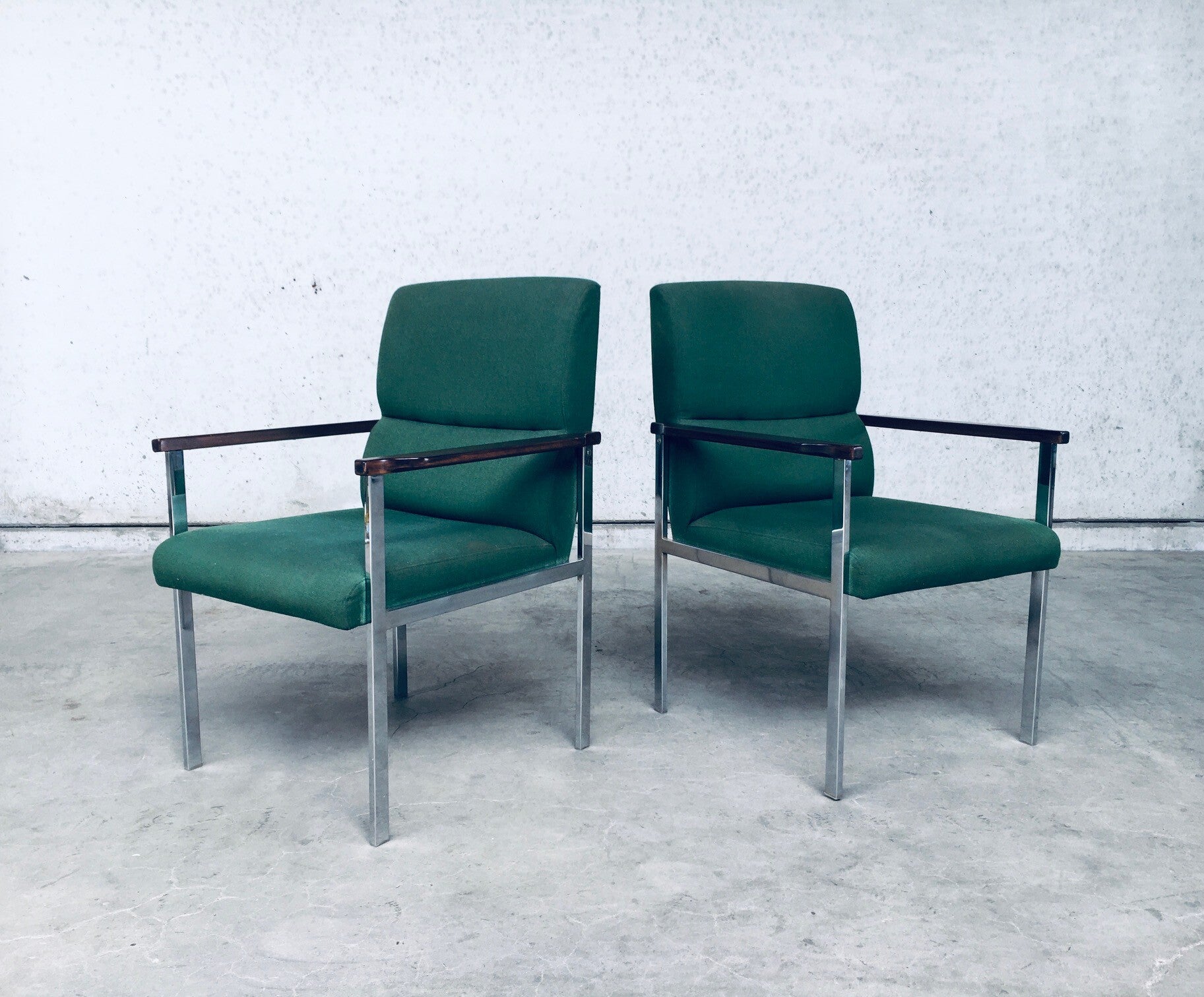 Vintage Midcentury Modern Design pair of Office Arm Chairs by Brune, Germany 1960's. Rare Chairs! Original green fabric with Palissander wood arm rest on chrome metal frame. Both are in very good vintage condition. Each chair measures 93cm x 63,5cm x 63cm.