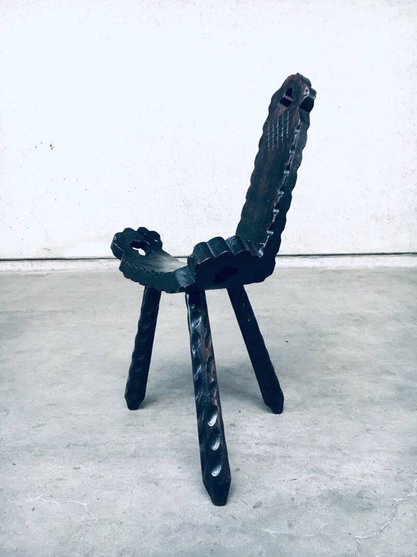 Vintage Brutalist Hand Craft Made Tripod wooden stool, made in Spain 1960's. With original label. Dark stained wooden tripod stool, hand carved. In very good condition. Measures 80cm x 49cm x 34cm.