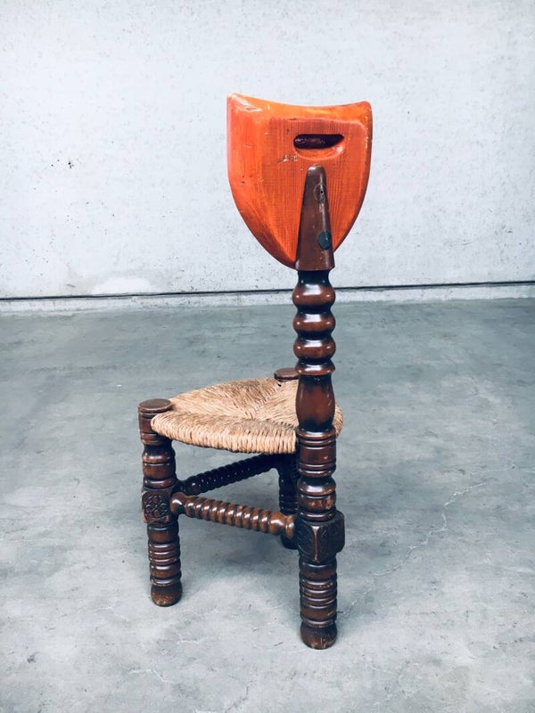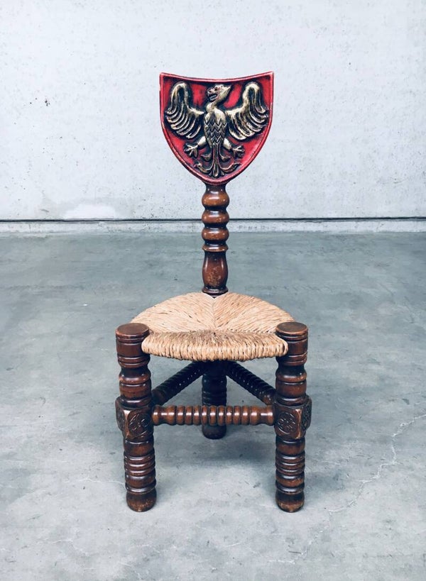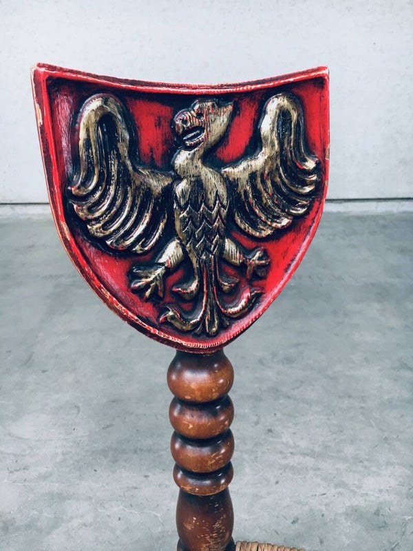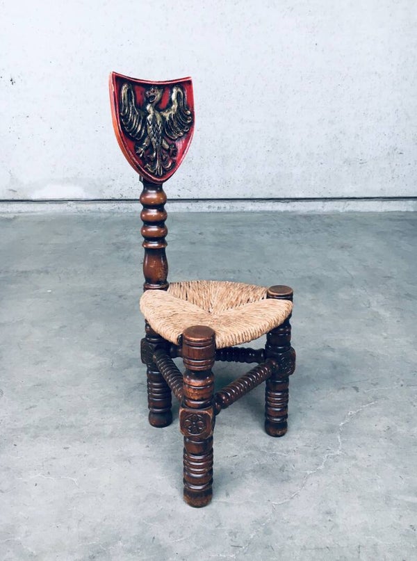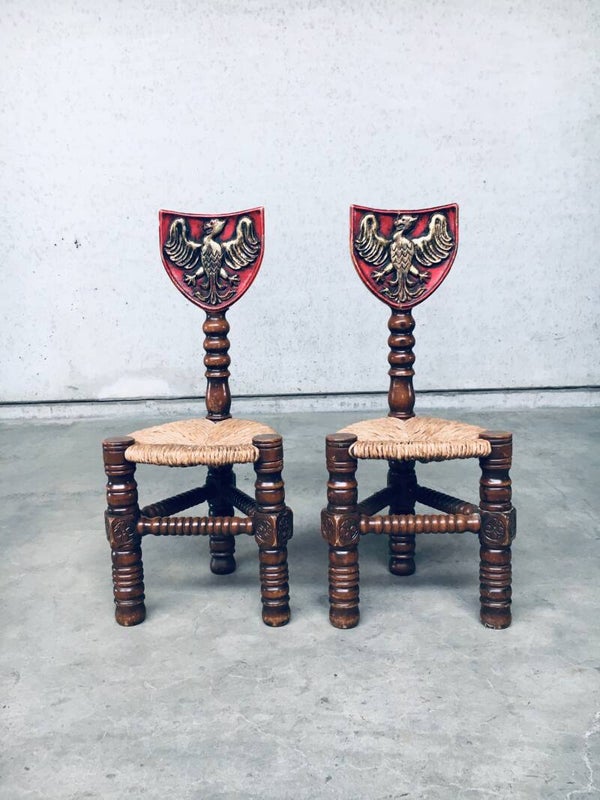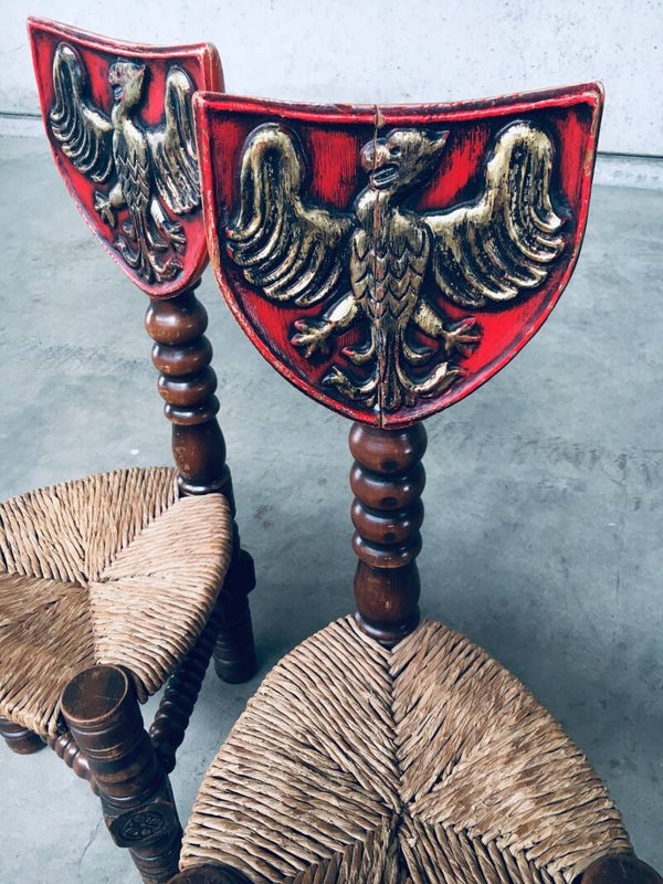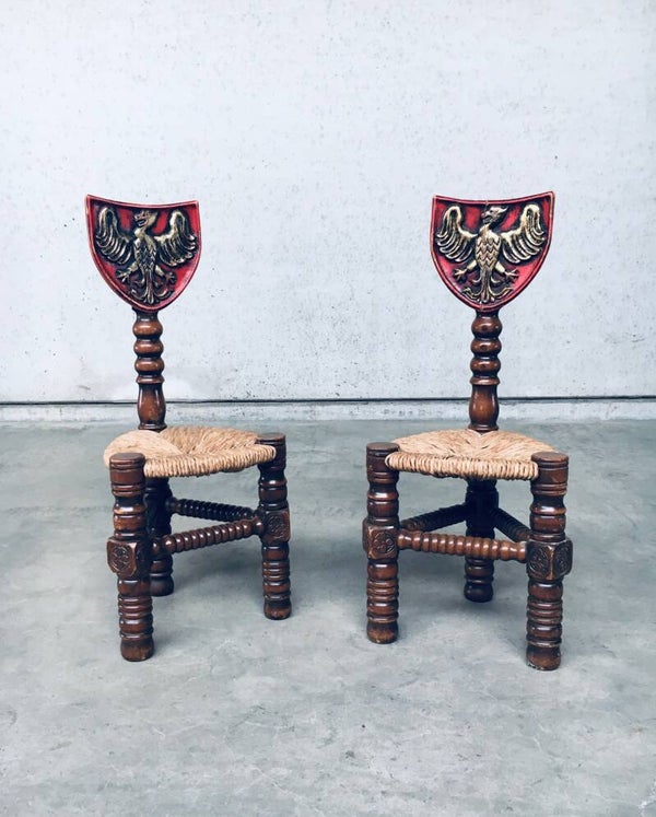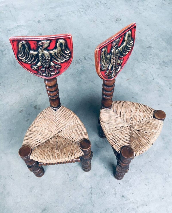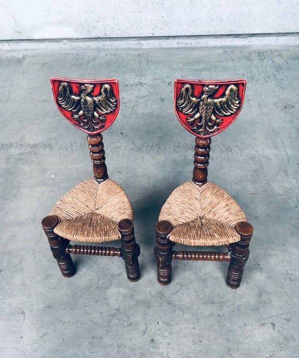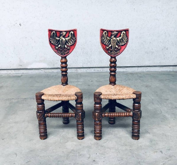 Vintage Brutalist in Style Hand Craft Made Whimpsical Medieval Knights Low Stool Chair set of 2, 1960's. Wood constructed frame with paper cord seat and painted shield top. Hand Craft made turned and carved wooden chairs. In overall very good condition. One chair has a crack in the painted top shield. A Rare original one of a kind set of chairs. Each chair measures 89,5cm x 38cm x 38cm.