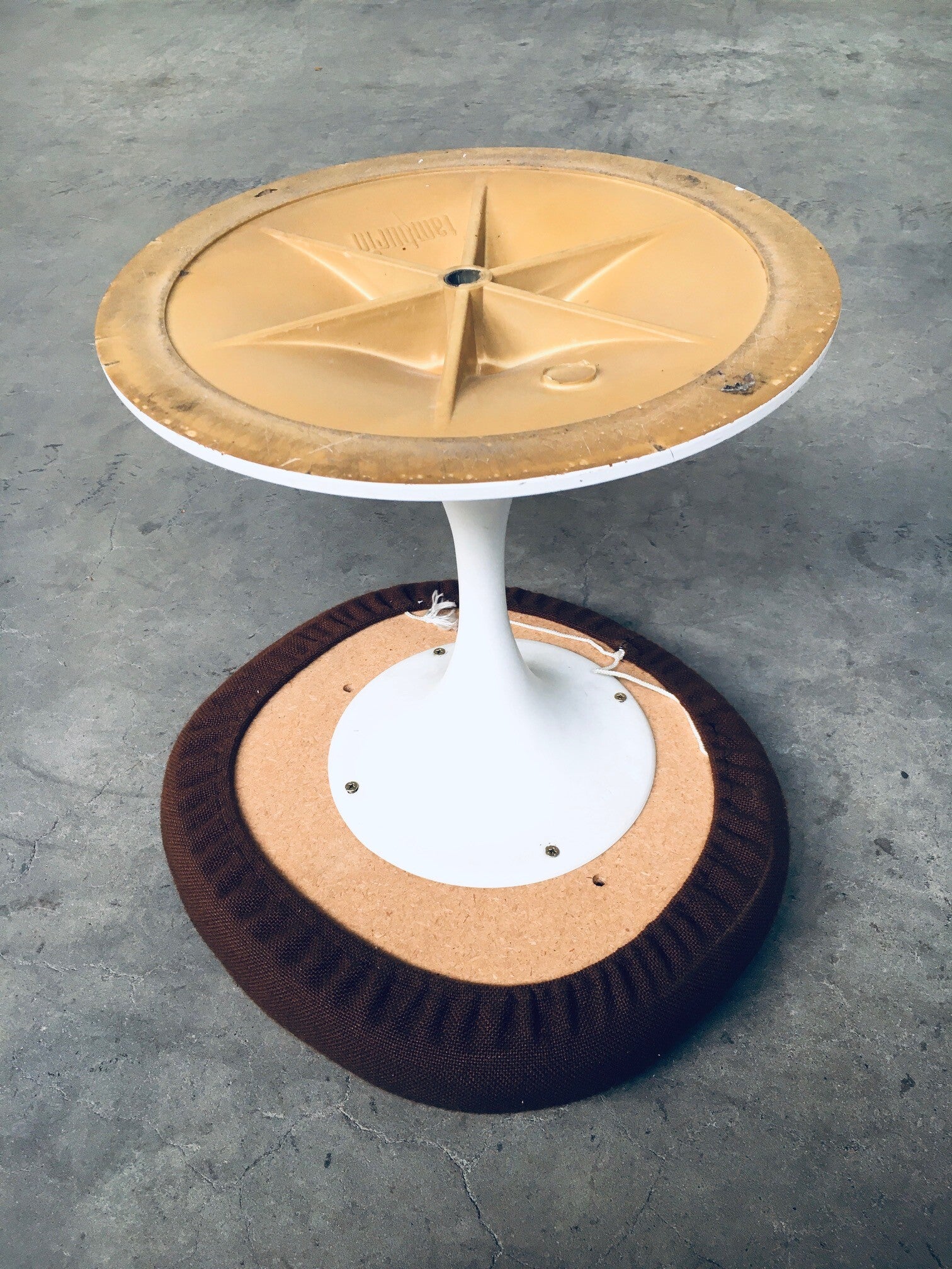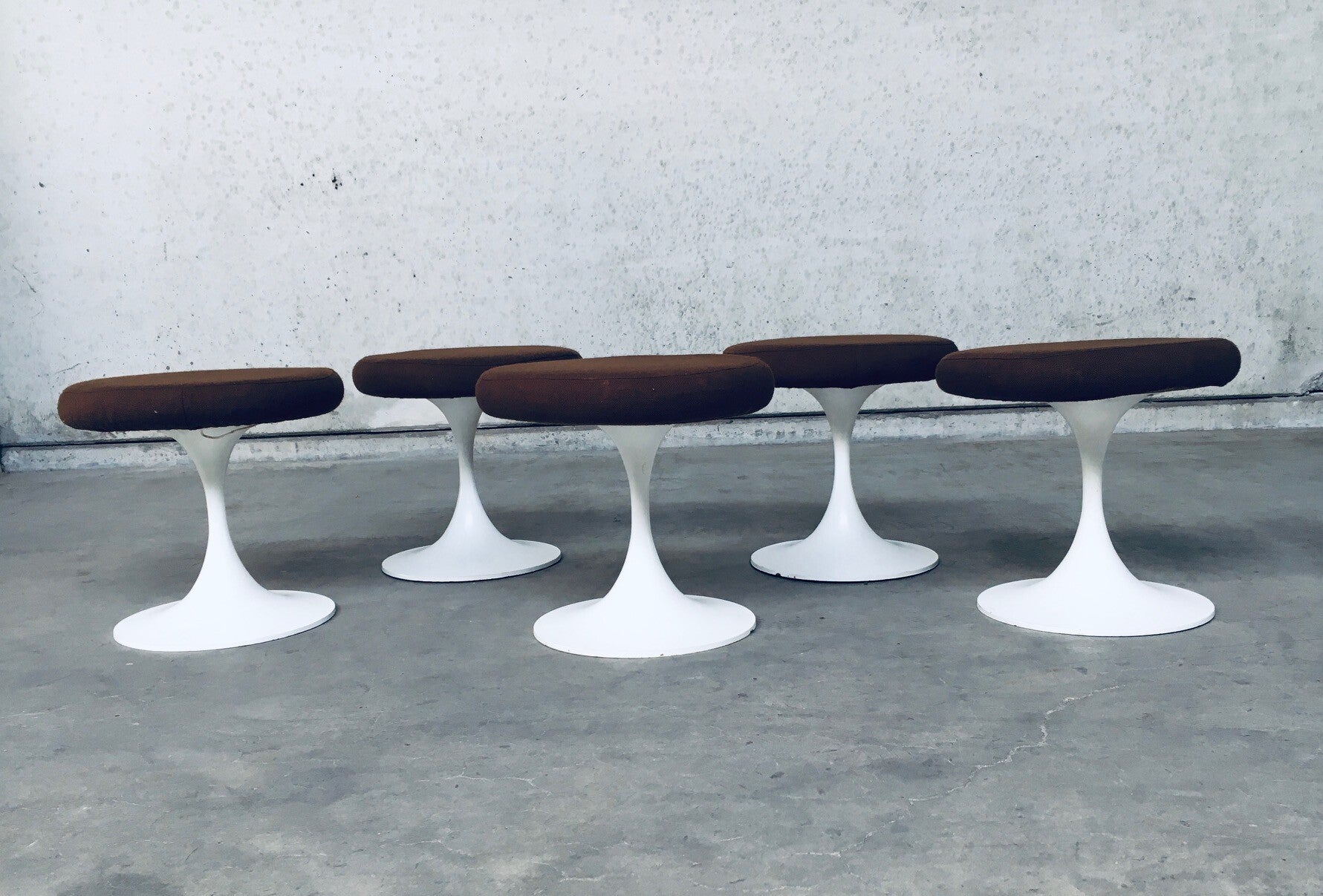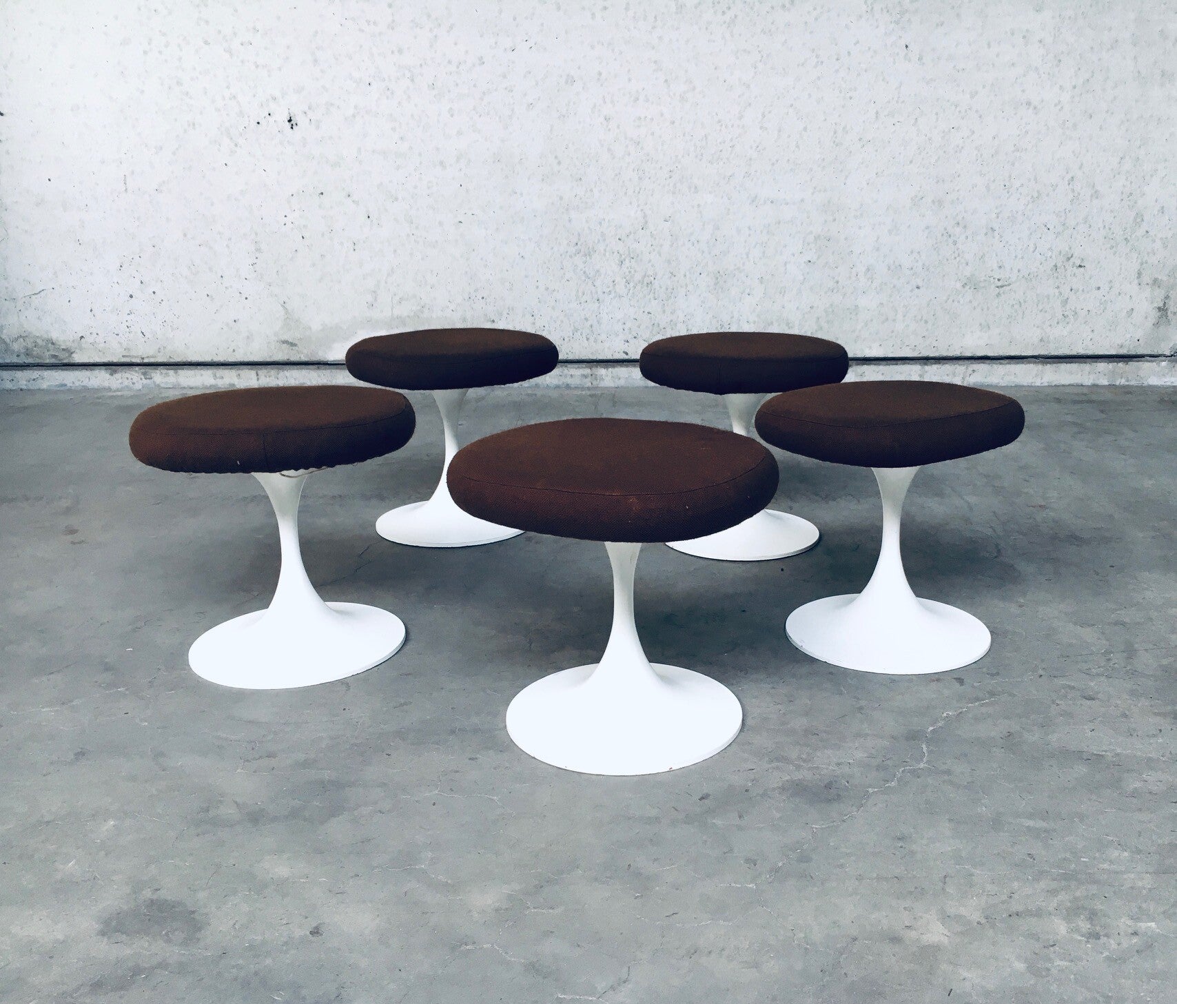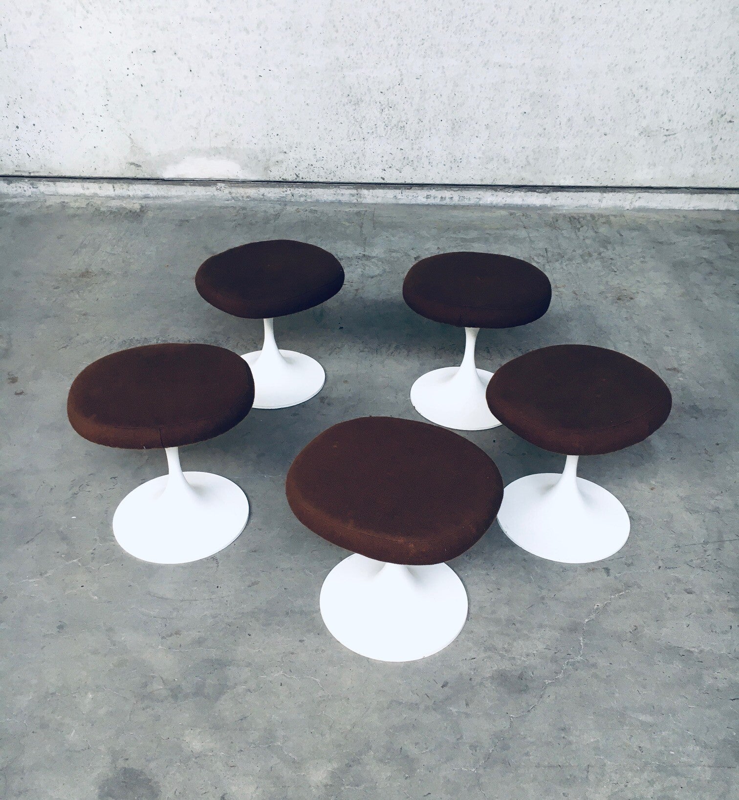 Vintage Midcentury Modern Design Tulip Low Stool set of 5 by Tamburin, Sweden 1970's. In Style of Knoll stools. White Plastic formed tulip base with brown fabric covered oval seat. White plastic base shows signs of wear of each stool. In overall very good condition. Each stool measures 46cm x 49cm x 44cm.