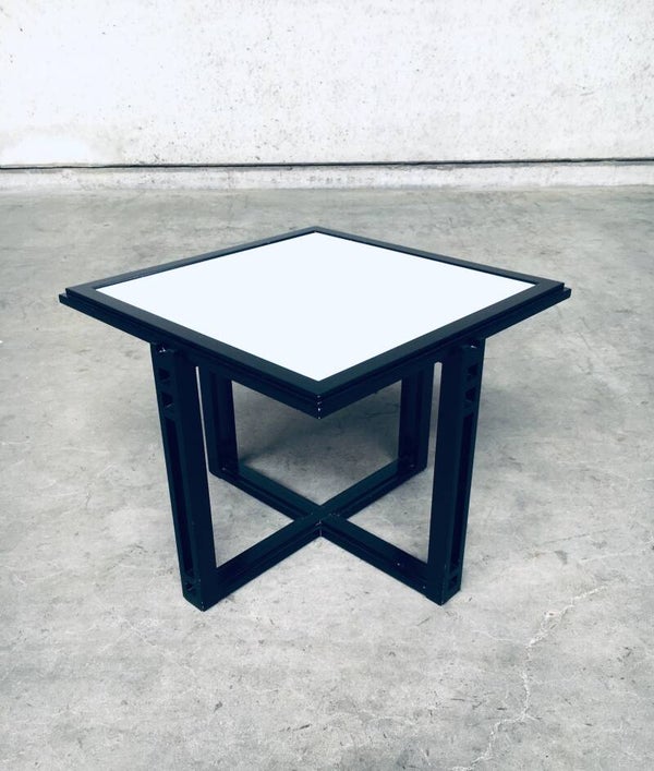 Postmodern Italian Design 'Galaxy' series square Side Table set of 2 by Umberto Asnago for Giorgetti, Italy 1980's. Black laquered wooden frame with white glass inlay on top. Higher two tier model and lower single model. Both are in very good condition. Measurements; High model: 56,5cm x 52cm x 52cm, Low model: 41cm x 52cm x 52cm.