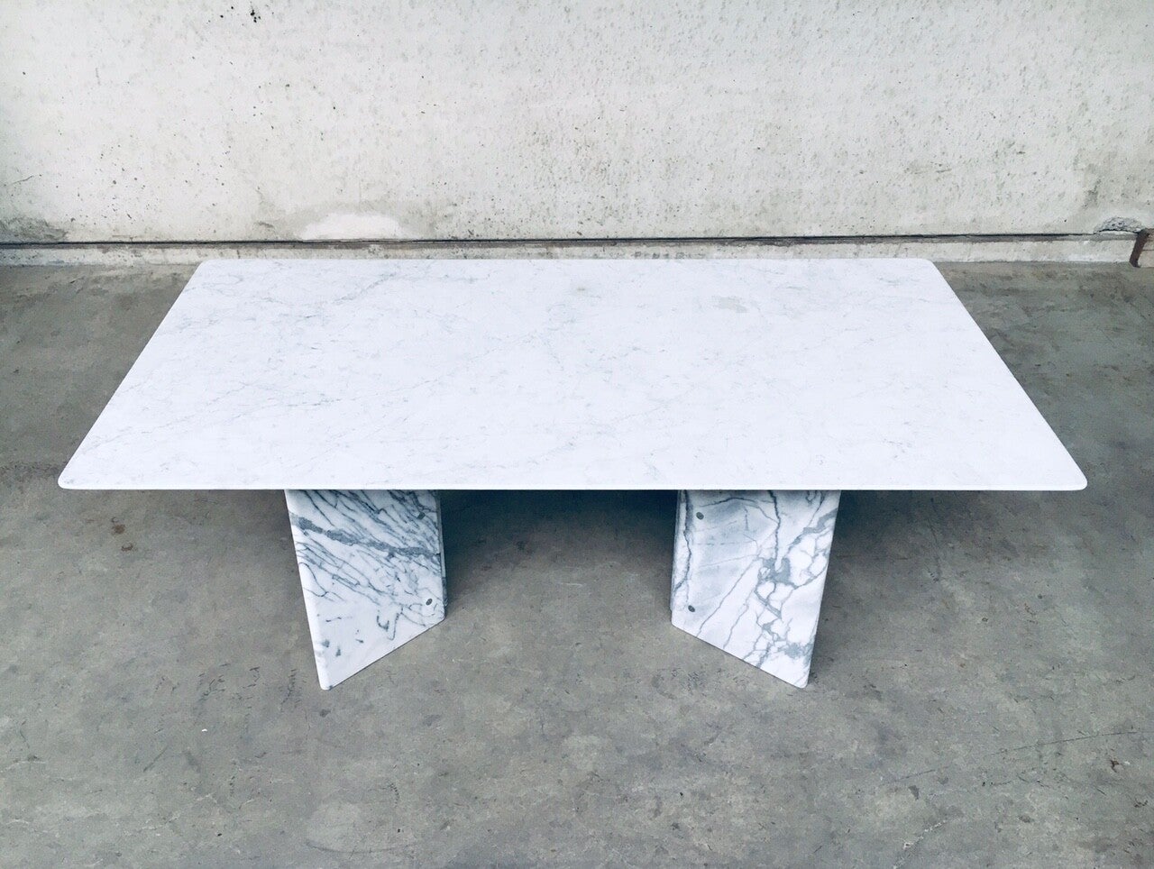Vintage Postmodern Italian Design Carrara Marble Dining Table, Italy 1970's. Thin marble top on V shape marble bases. Impressive dining table in very good condition. Table top has signs of use and some spots, no major defects, beautiful thin cut marble. Marble bases are in very good condition. Will seat 6 easily. Measures 72,5cm x 190cm x 80cm.