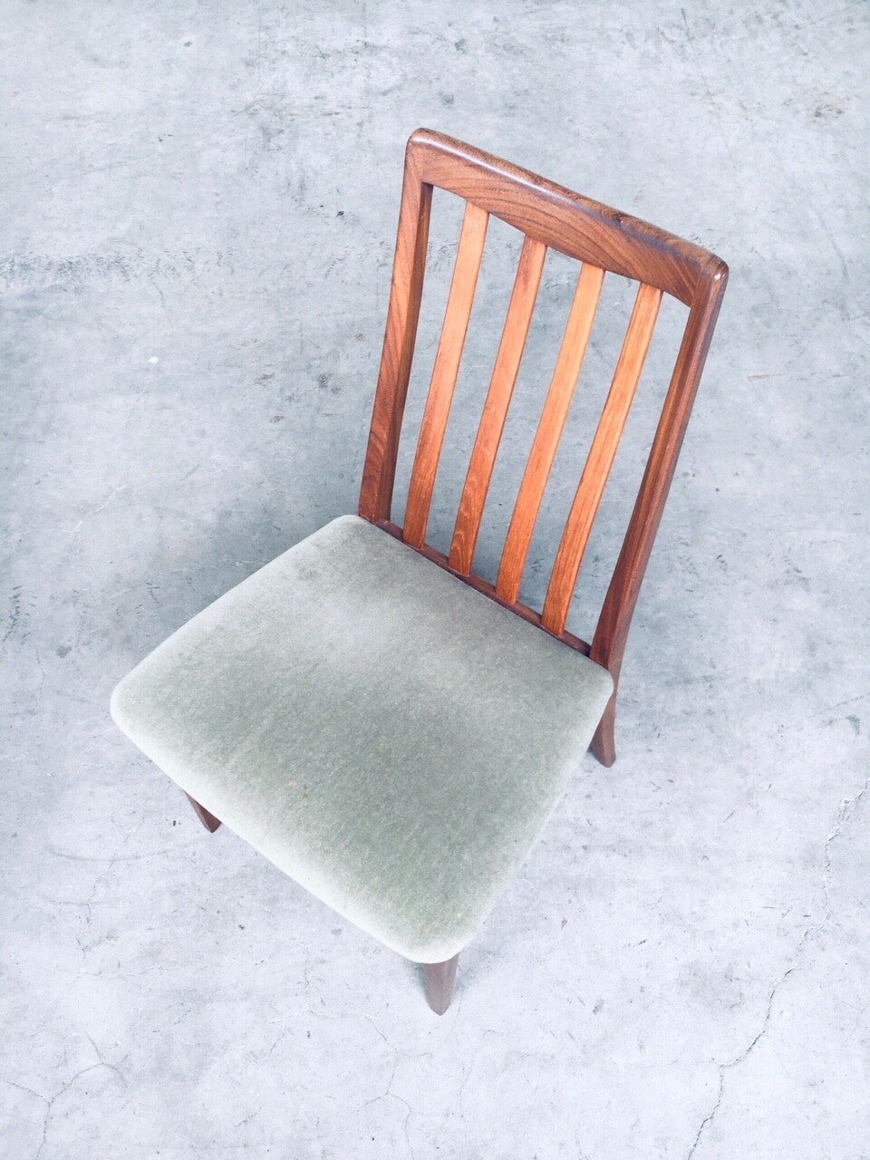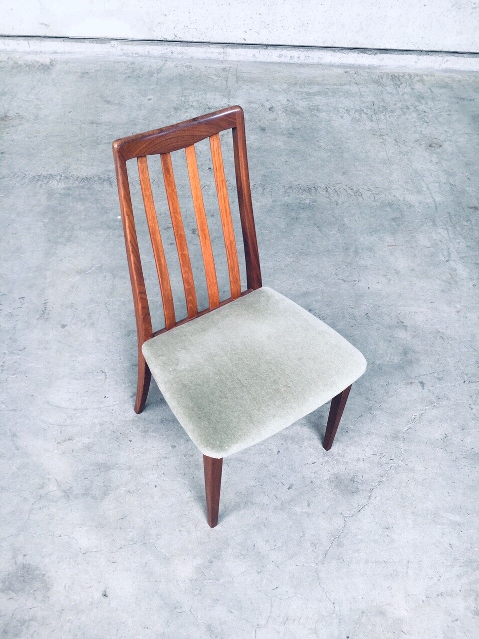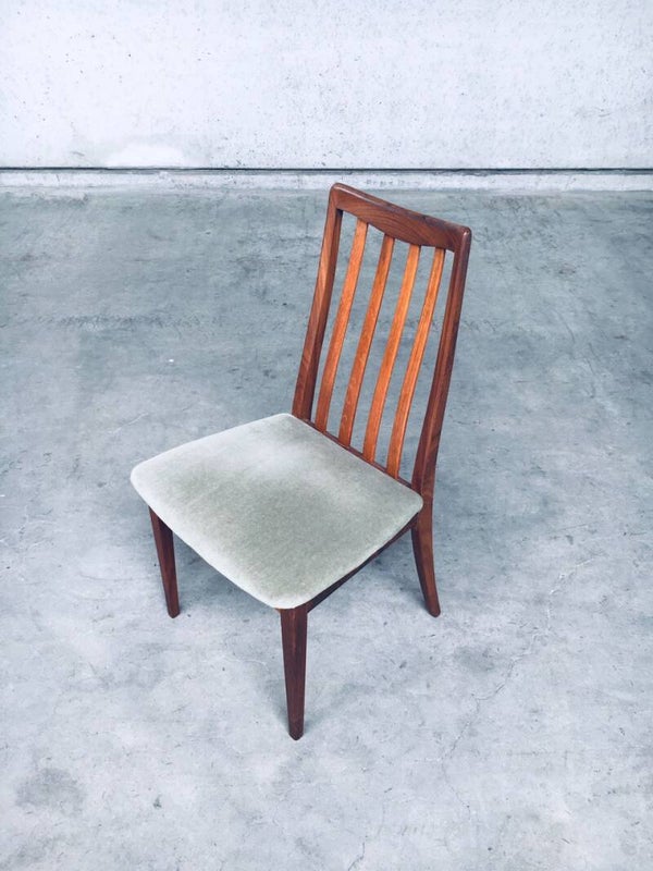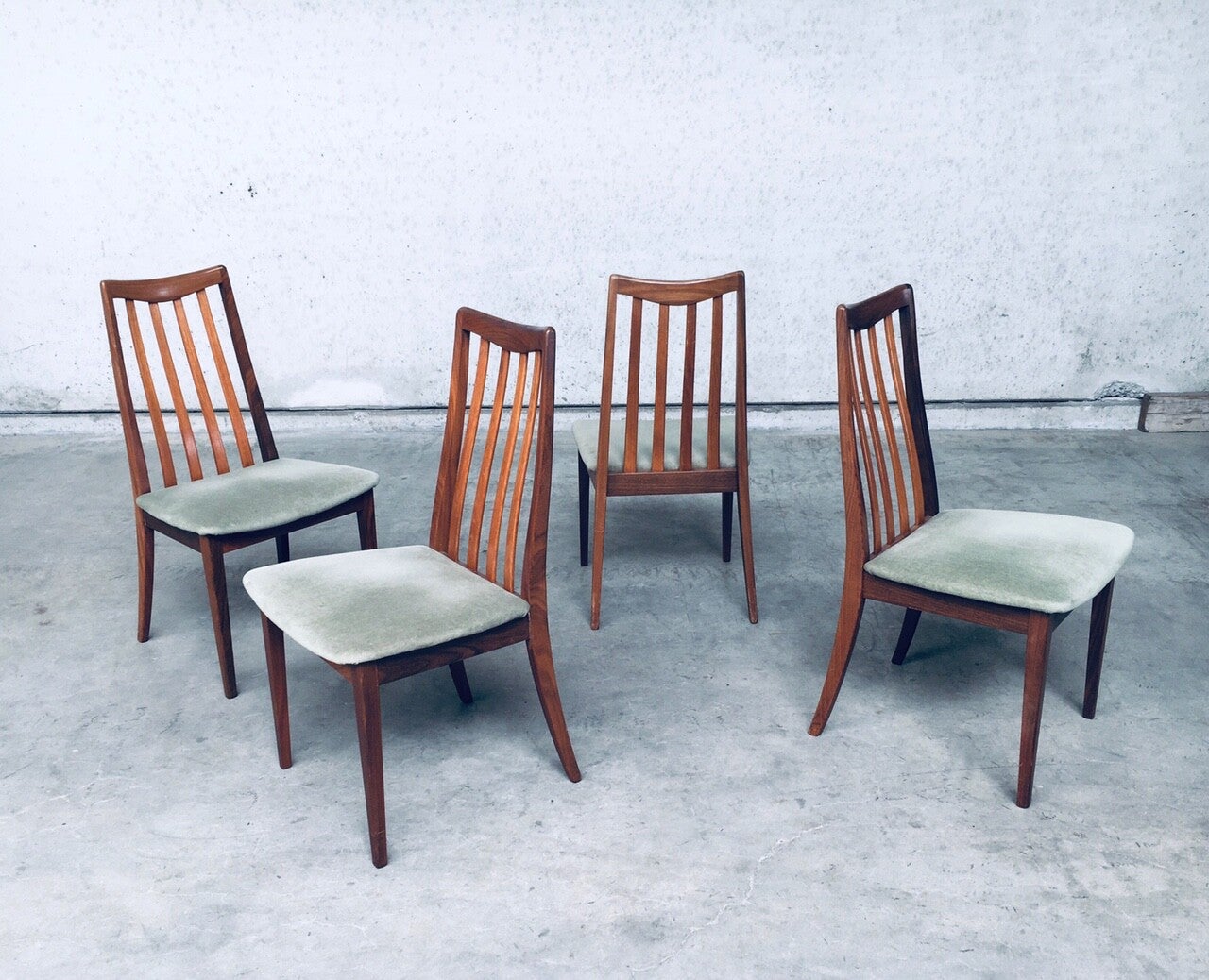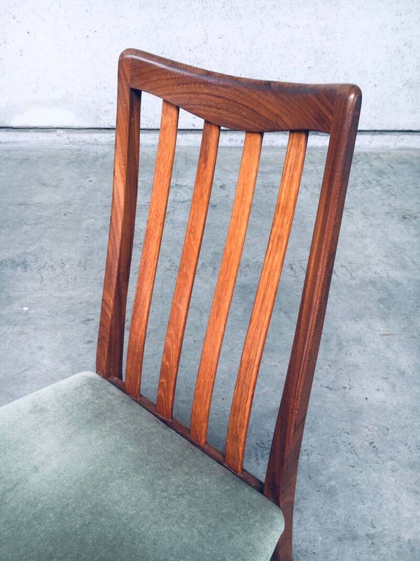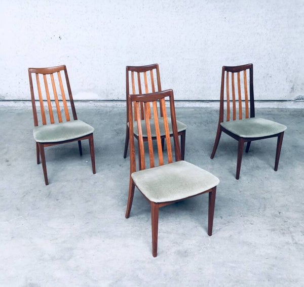 Vintage Midcentury Modern Design Dining Chair set of 4 by Leslie Dandy for GPlan, England 1960's. Beautifully shaped teak wooden frame with soft green velvet seat. All are in very good condition. Each chair measures 91,5cm x 48,5cm x 47cm.