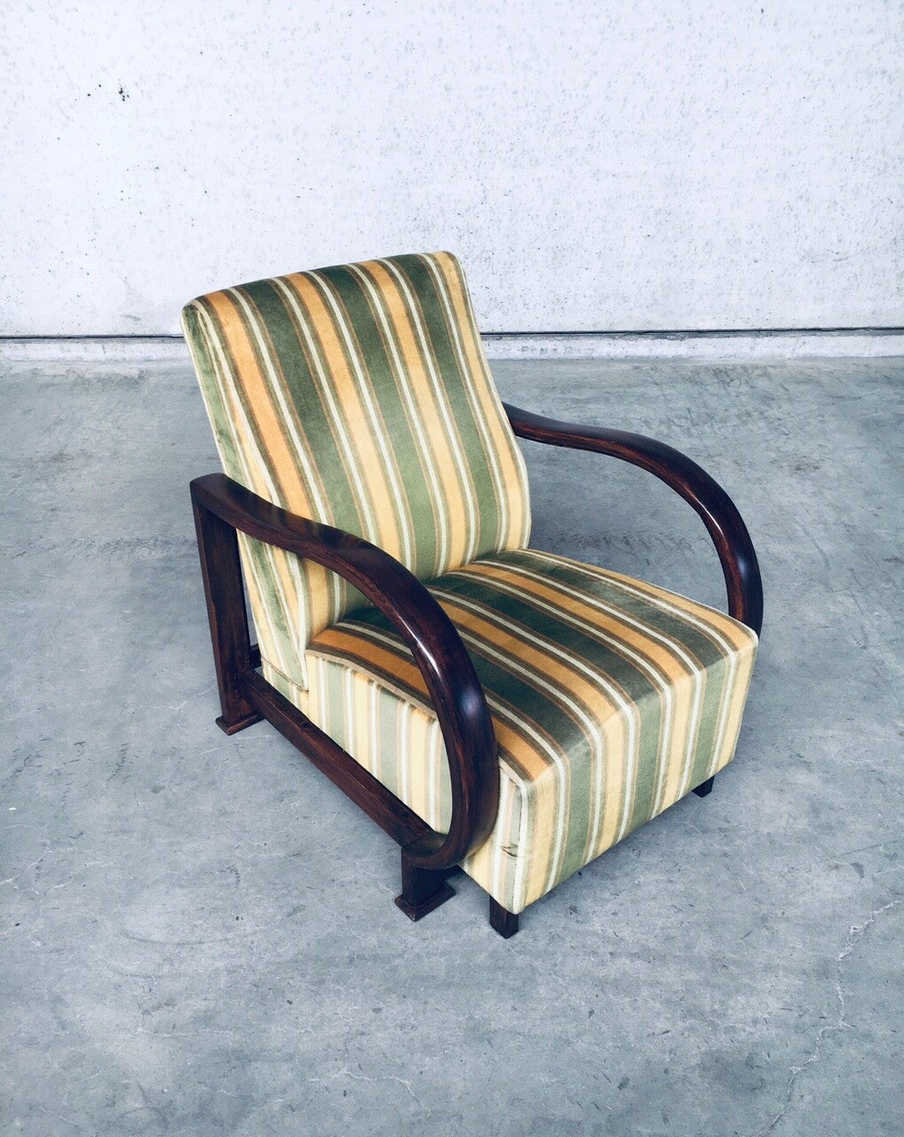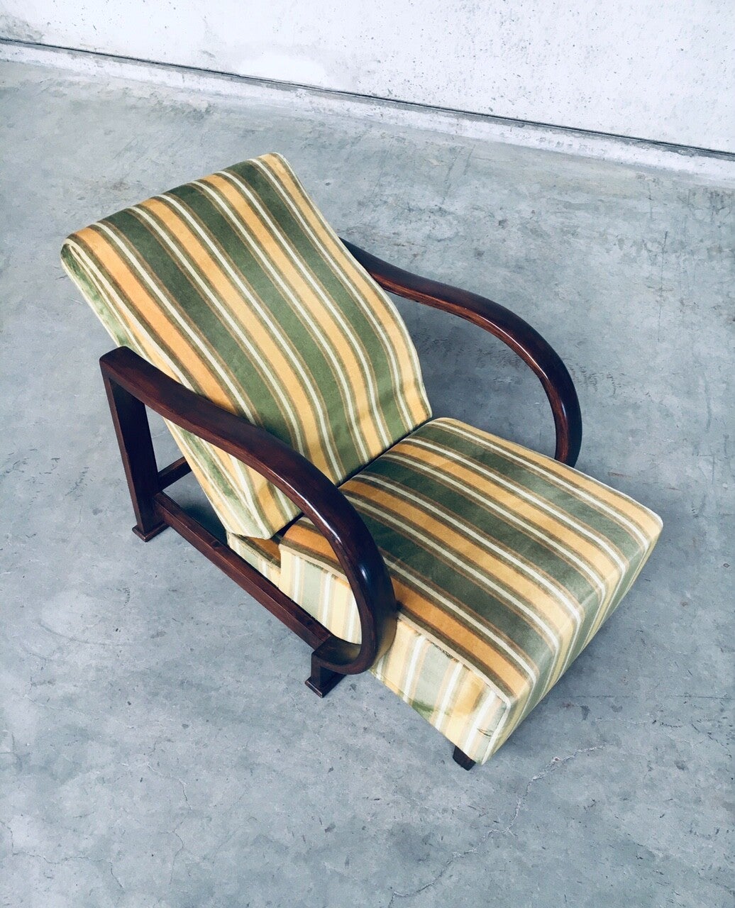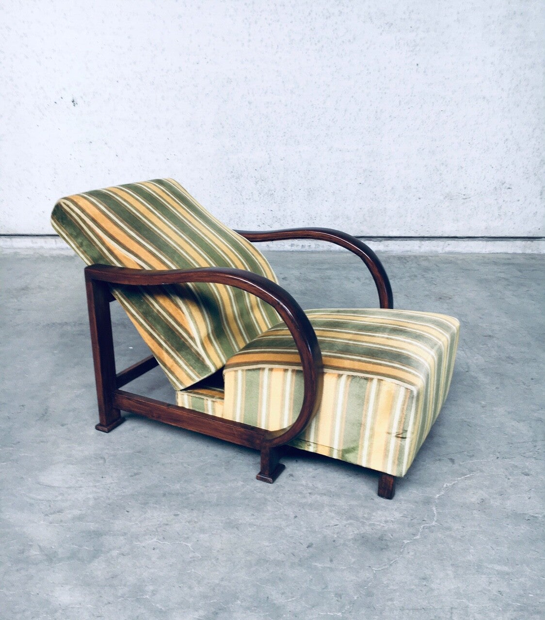 Vintage Art Deco Reclining Armchair Lounge Chair set of 2, 1930's. Recliner bentwood armchair set. Striped velvet spring seat and back with bend walnut arm rests and seat construction. Rare set in very good condition. All original fabric. In style of Jindrich Halabala. Each chair measures 88cm x 70cm x 86cm. When reclined it measures 126cm.