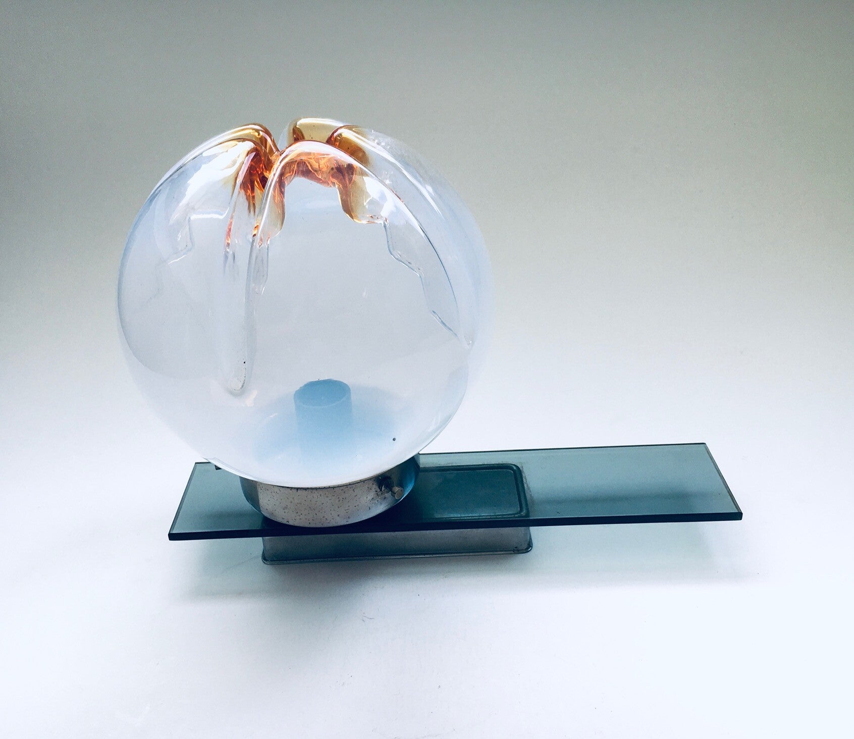 Vintage Midcentury Modern Italian Design Opaline Glass wall lamp by Mazzega, Murano Italy 1970's. Clear White and umber glass ball fixed on metal base with smoke glass wall plaque. In very good condition. Measures 27cm x 16cm x 20cm.