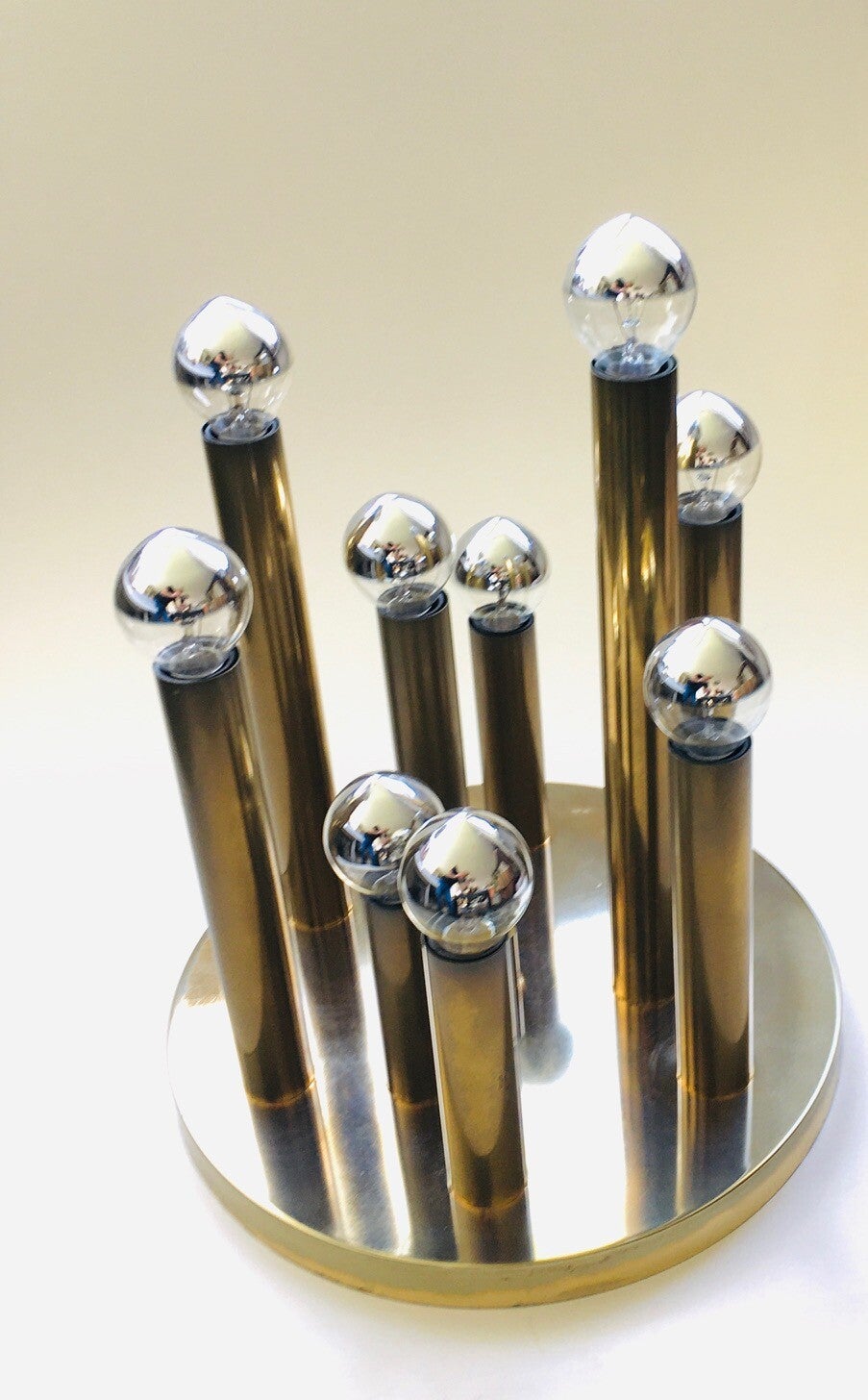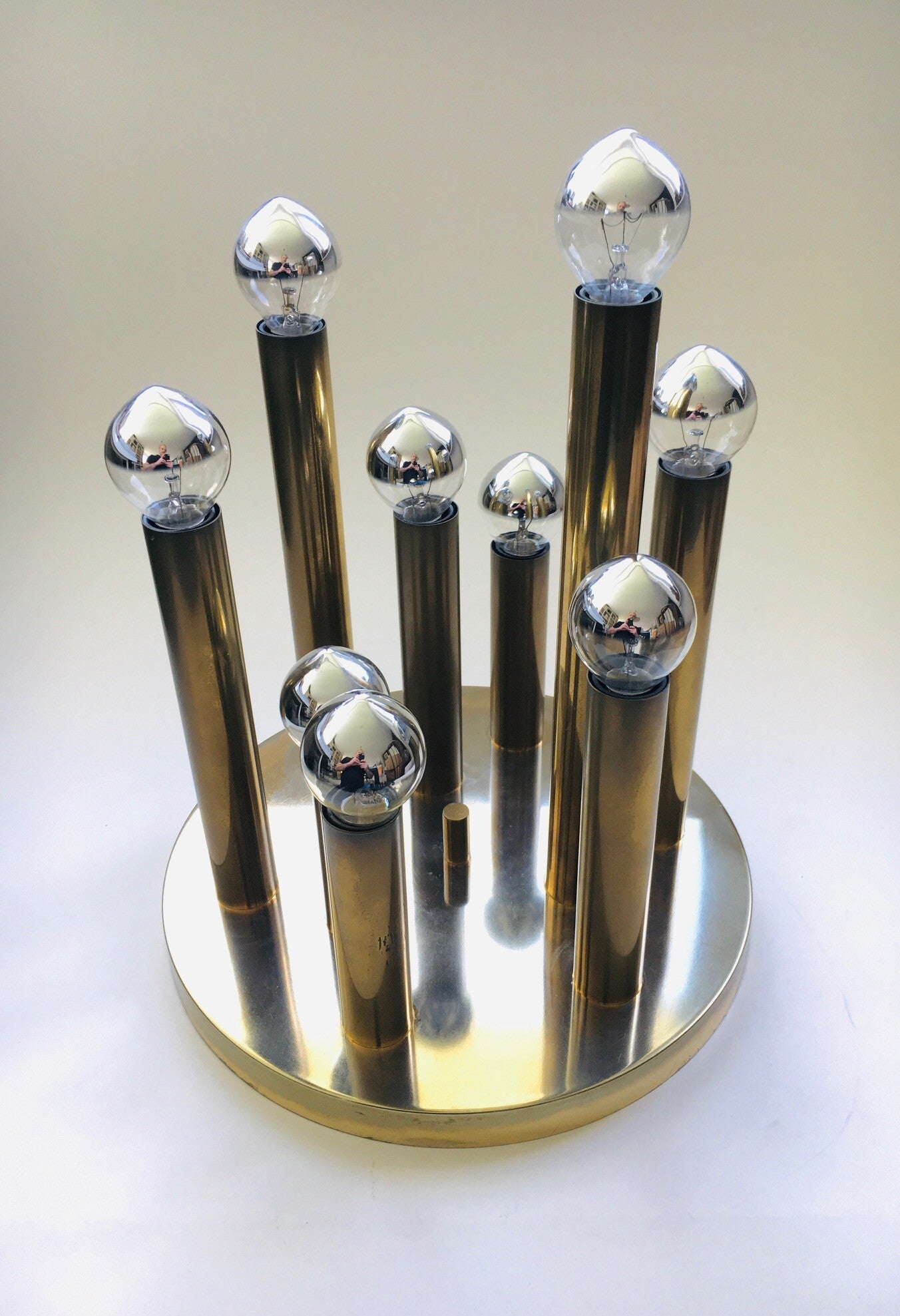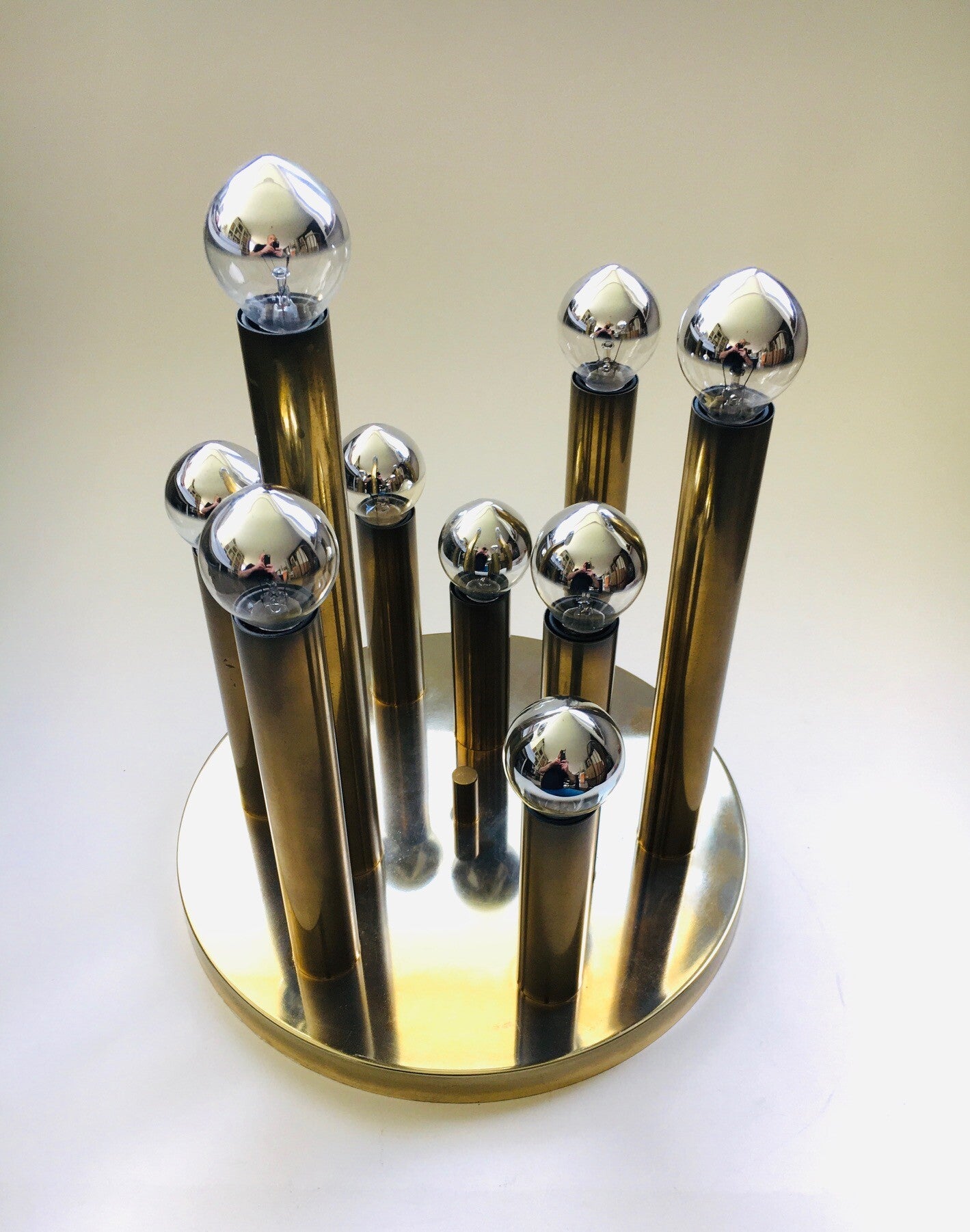 Vintage Italian Design Large Flush Mount Ceiling Lamp by Gaetano Sciolari for Boulanger, Belgium 1970's. 9 light points (9 half mirror lamps not included). Solid brass structure. Original S.A. Boulanger Belgique label on inside. In very good condition. Measures 28,5cm x 28,5cm x 35cm.
