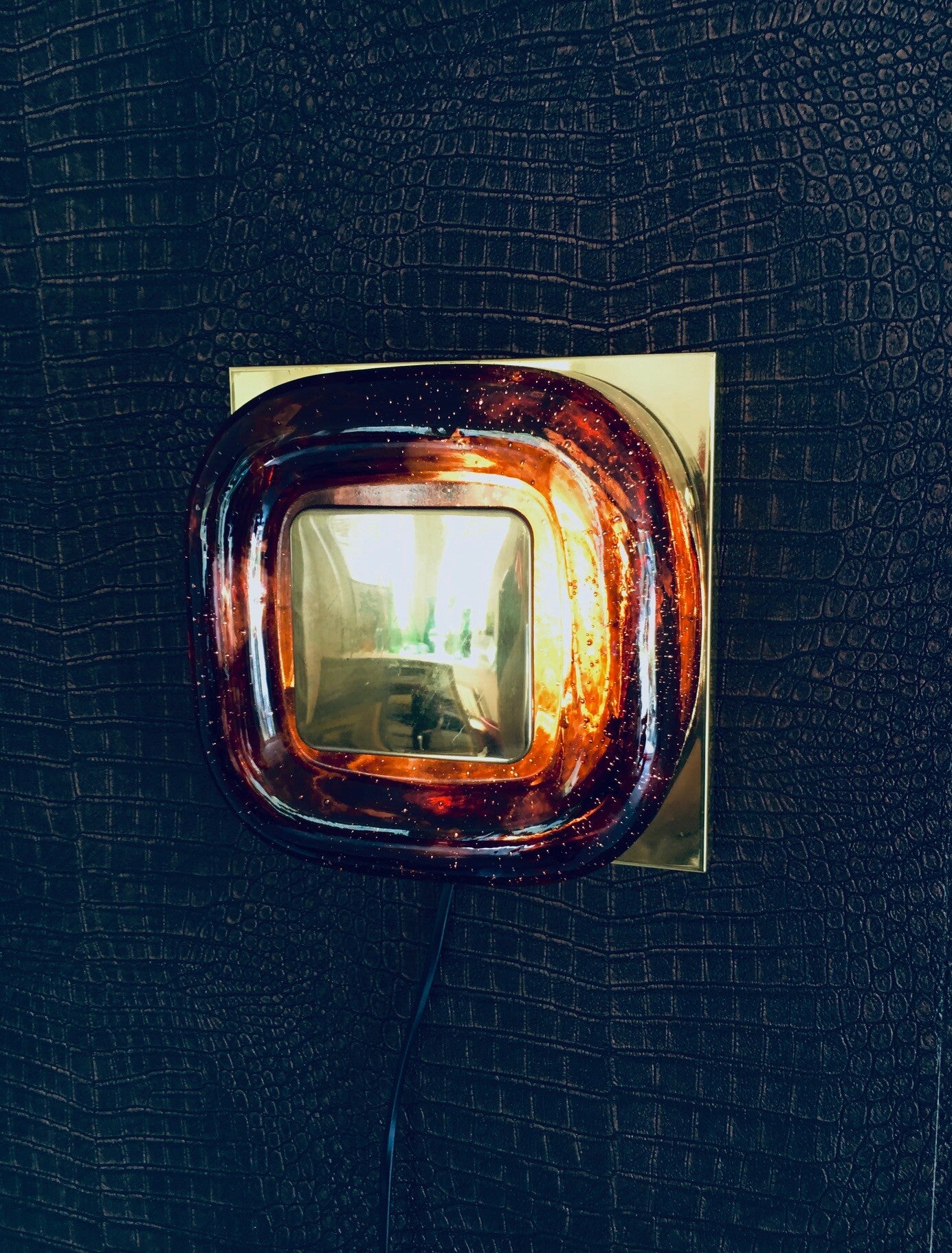 Vintage Midcentury Modern German Design Wall Sconce Lamp Applique by Helena Tynell for Glashütte Limburg. Brass square base and cover plate with amber brown bubbled glass. Beautiful handmade glass which differs slightly on all the lamps. In very good condition. Measures 20cm x 20cm x 9,5cm.