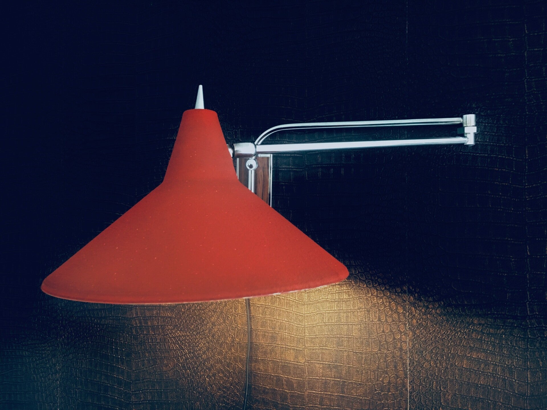 Vintage Midcentury Modern Dutch Design Extendable Paperclip Swining Arm Wall Lamp by J.J.M. Hoogervorst for Anvia, Holland 1960's. Made in the Netherlands. All metal construction. Matt red industrial painted lampshade. In overall good condition.Lampshade measures 27,5cm x 18cm. Fully extended this measures about 76cm.