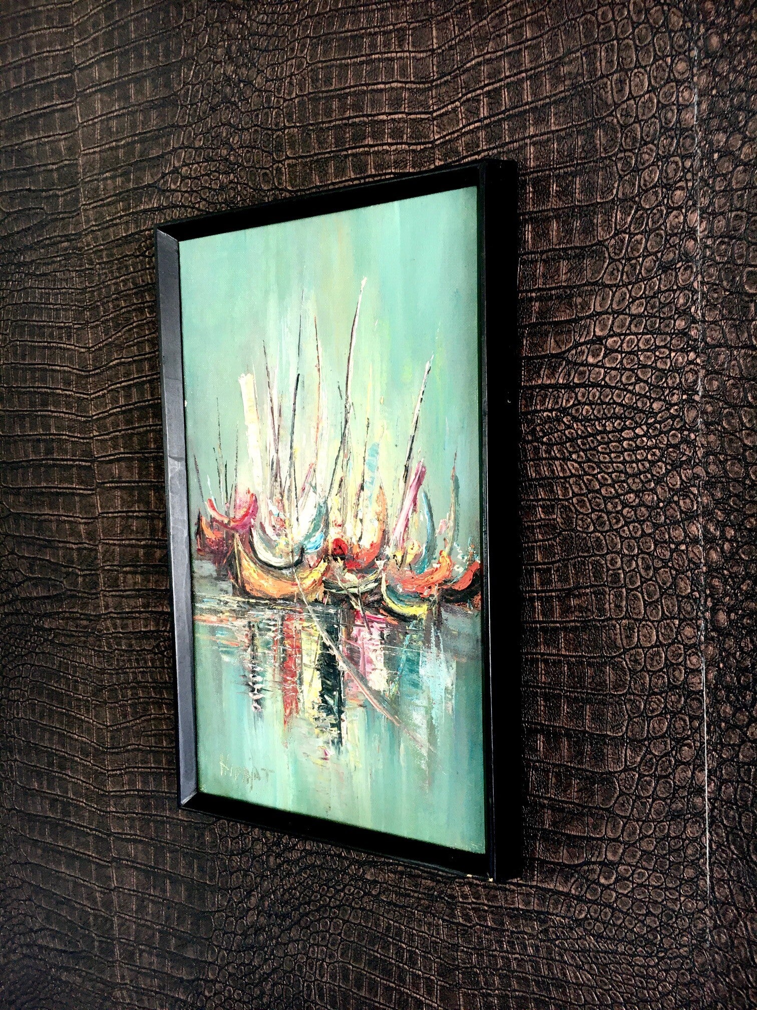 Vintage Original handpainted Indonesian Tourism Art 'Boats' signed by Hidajat, 1960's. Oil on canvas. Framed in black wooden frame. In very good condition. Measures 22cm x 37cm.
