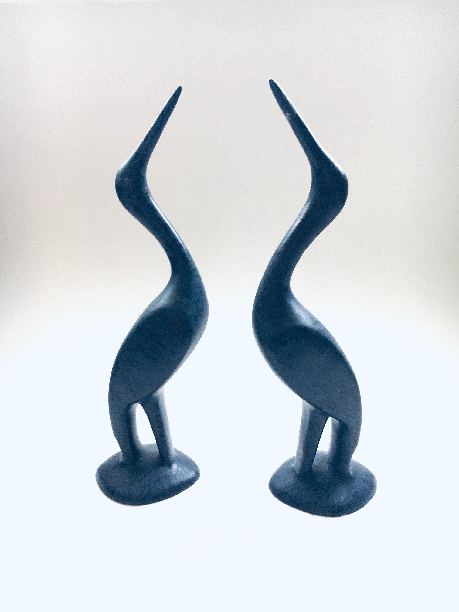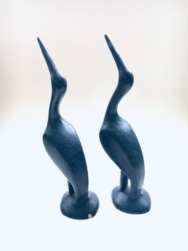 Memphis Design Ceramic Crane Bird Statue Set, made in the 1980's. Matt purple glazed with dark purple structured print. Both are in good condition, but both have some damage, one has a chip at it's base, one has it's beak broken and reglued. Each measures 9cm x 8cm x 31cm.