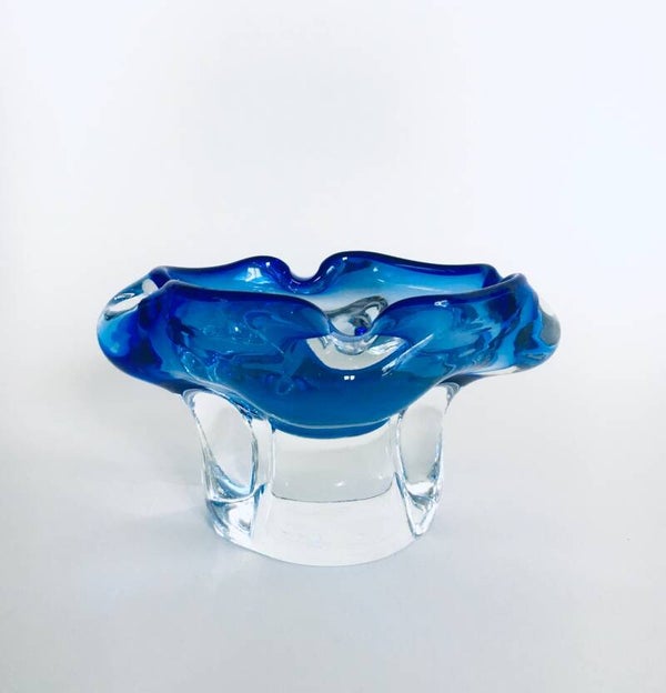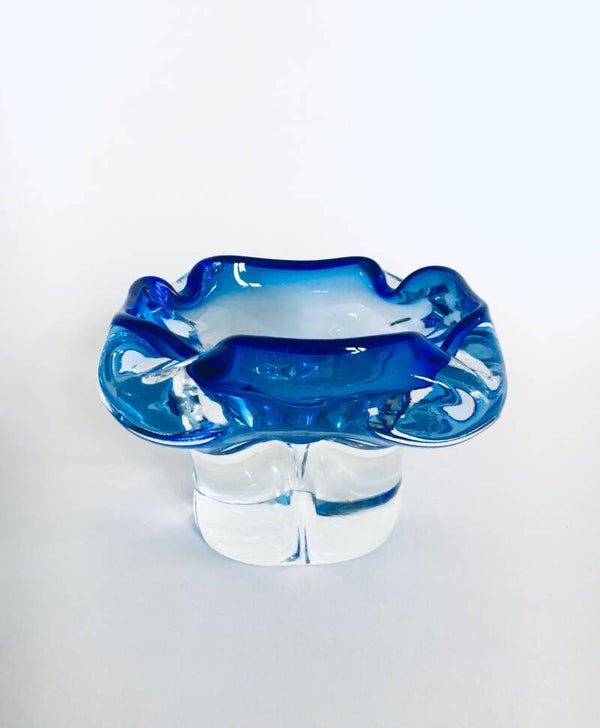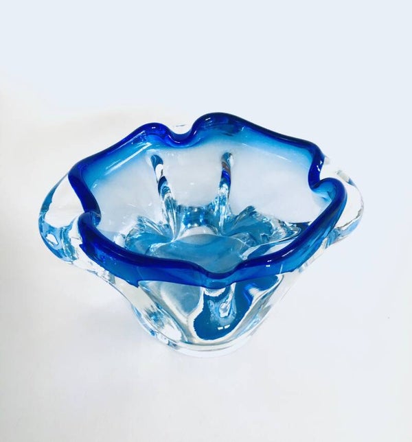 Vintage Midcentury Modern Bohemia Crystal Glass Bowl, Ashtray, Made in Czechoslovakia, 1960's. Heavy Clear crystal glass with blue trim. In very good condition. Measures 13cm x 13cm x 9cm.