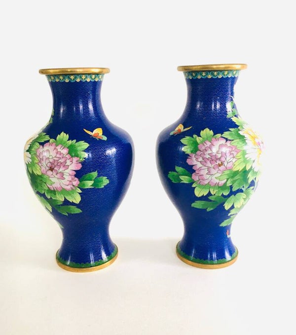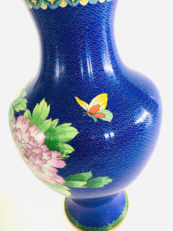 1960's Large Blue Flower Illustrated Chinese Cloisonné Enamel Vase set