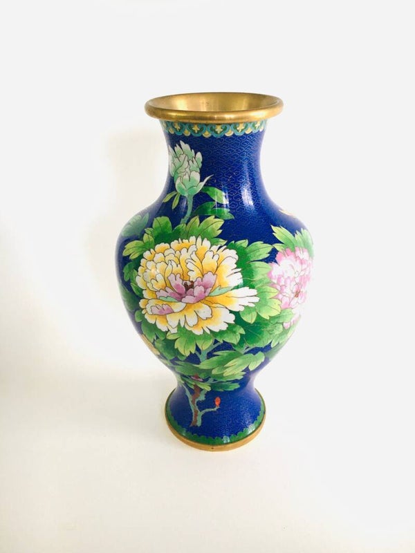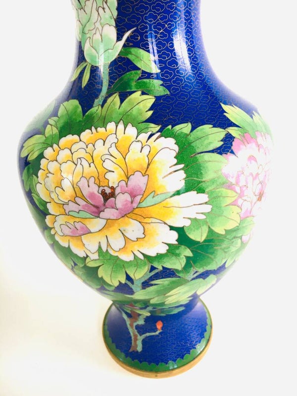 Vintage Midcentury Large Illustrated Chinese Cloisonné Enamel Vase set, made in China 1960's. Marine blue base with yellow and pink flowers over green foliage. An original mirrored pair. Both are in very good condition, old stock. Each vase measures 22cm x 22cm x 39,5cm.