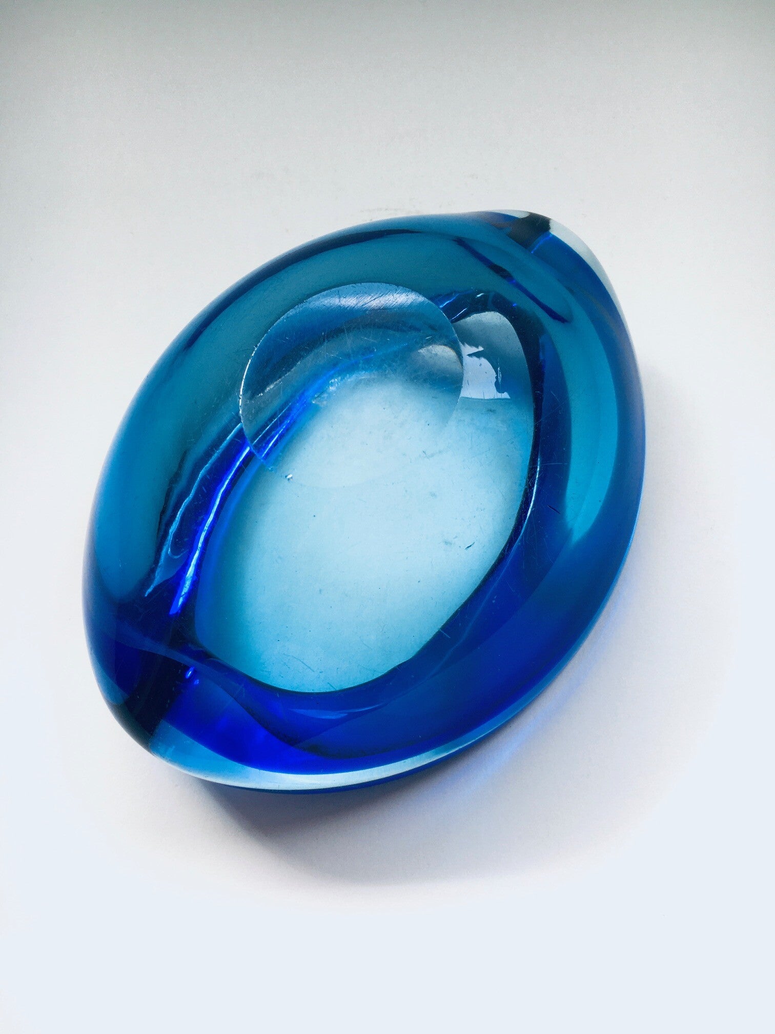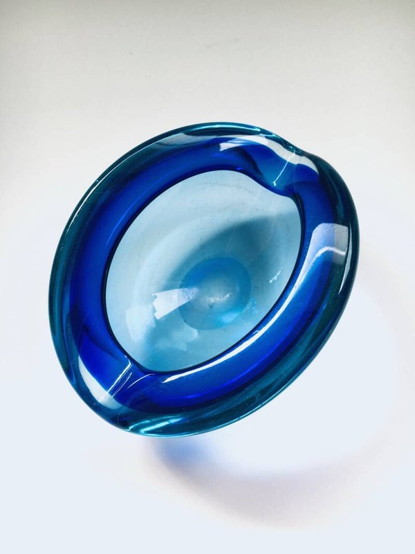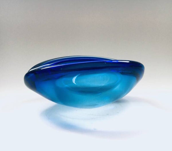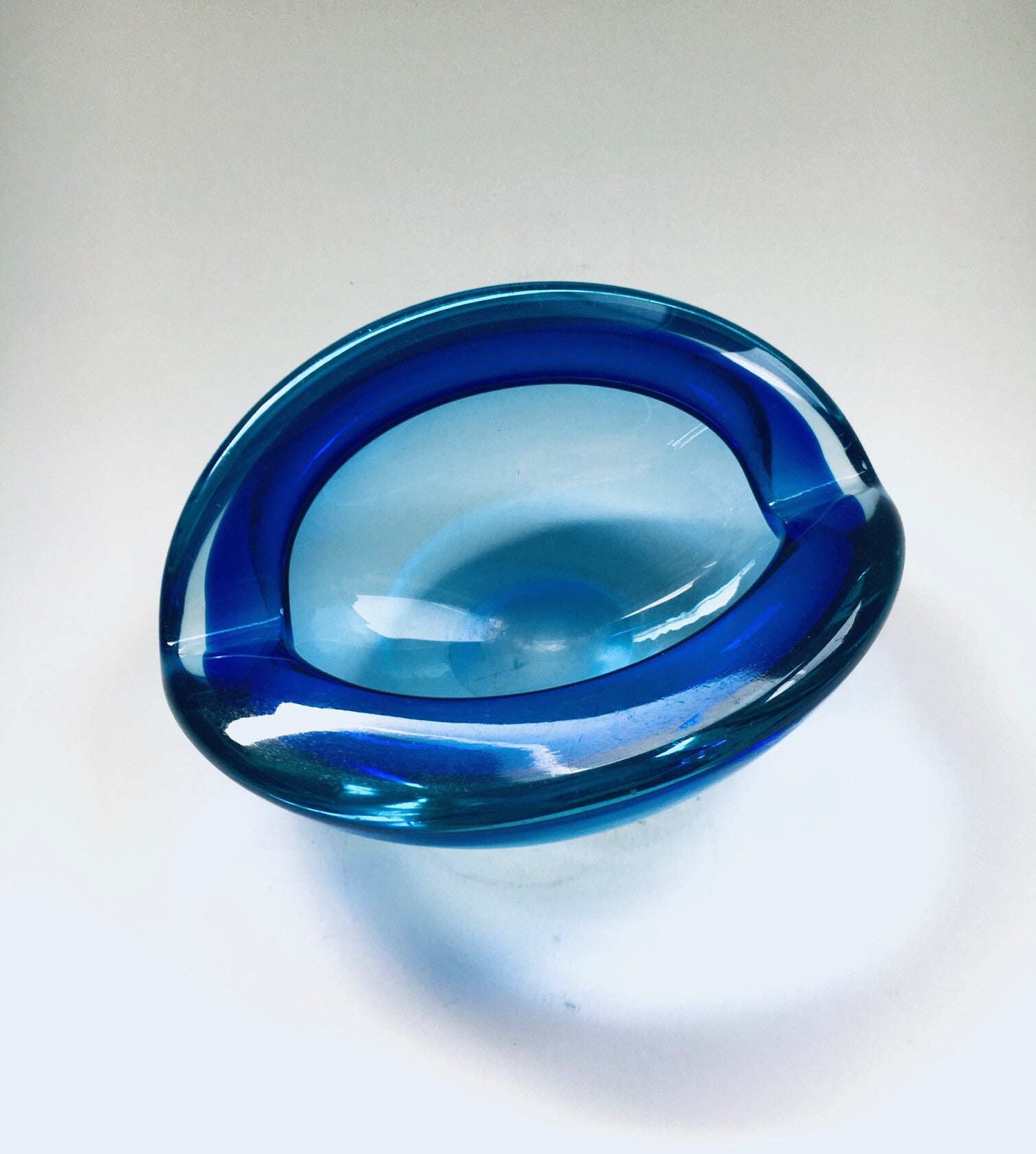 Vintage Midcentury Modern Italian Design Blue Glass Bowl Ashtray in Sommerso Style, Italy 1960's. Blue and green glass oval shape bowl. In very good condition. Measures 13cm x 16cm x 7cm.