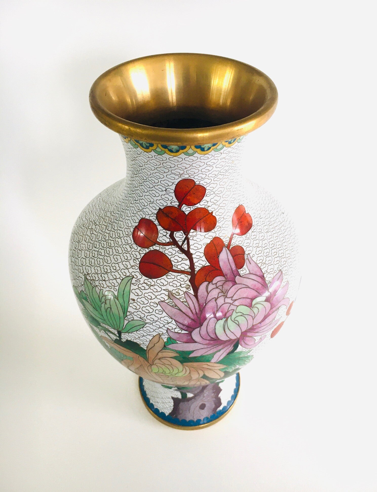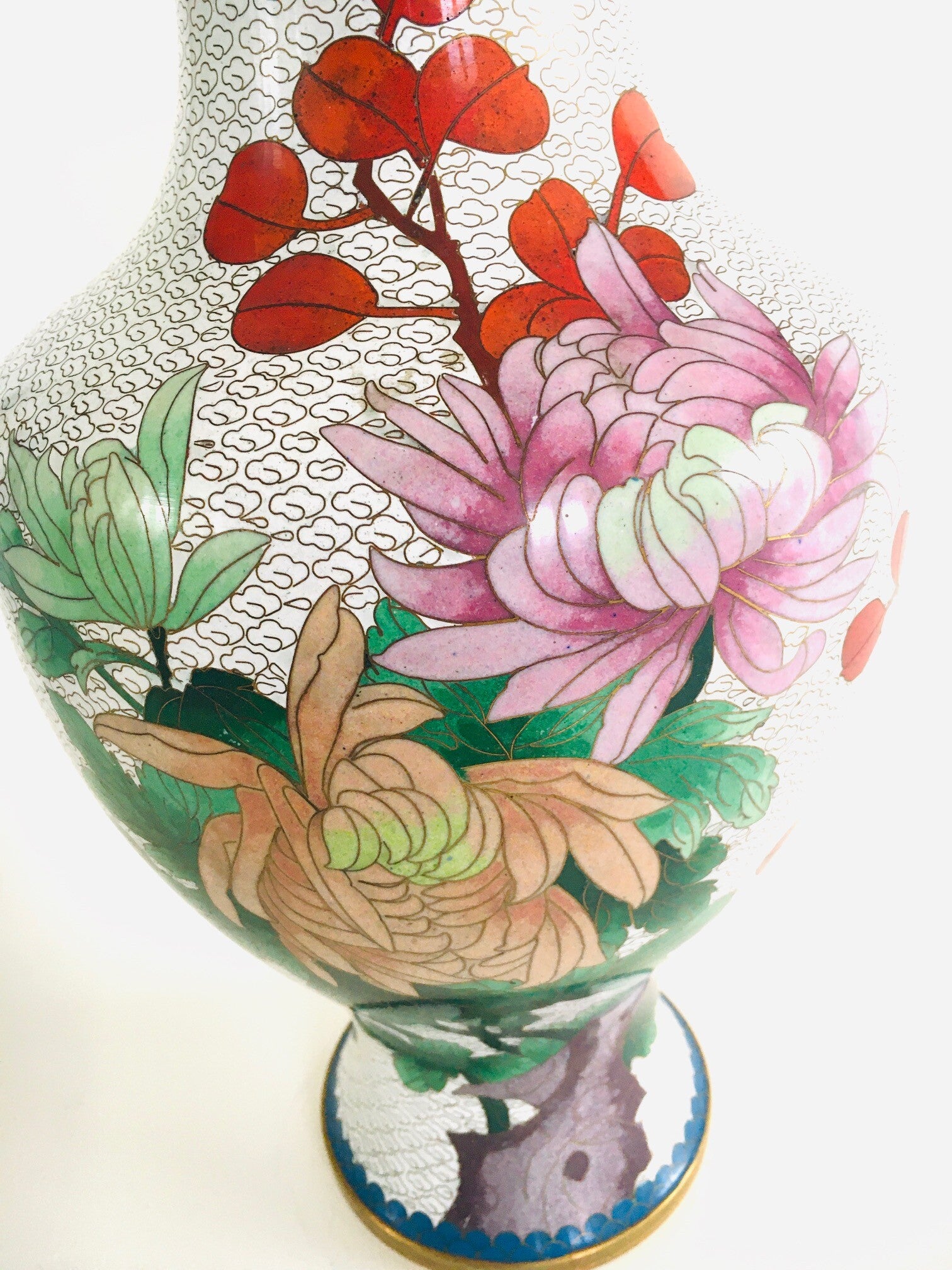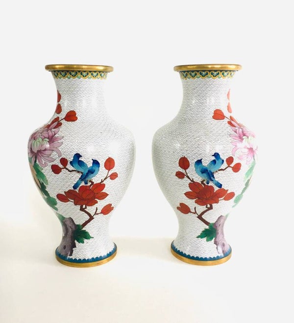 1960's Large White Flower Illustrated Chinese Cloisonné Enamel Vase set