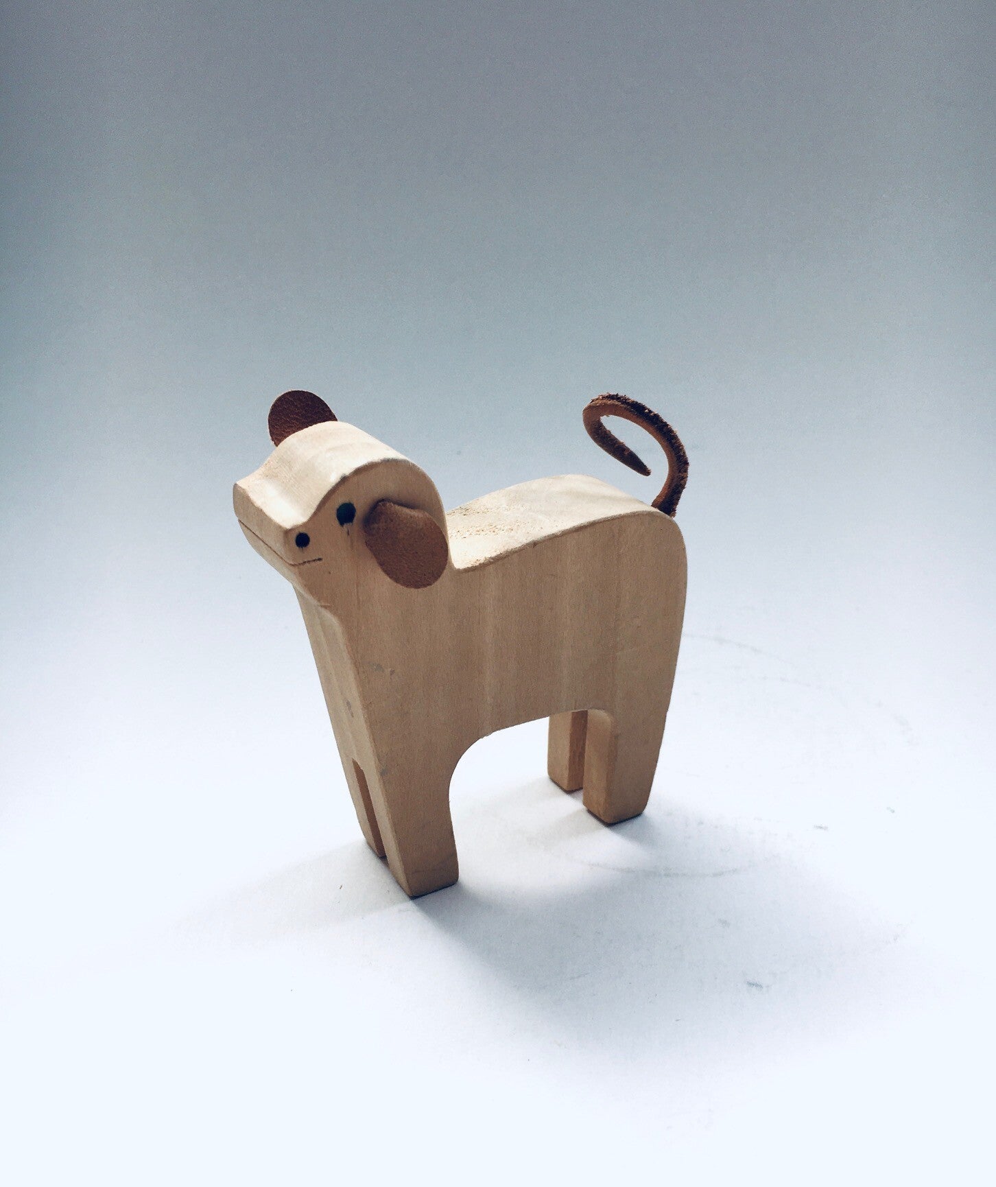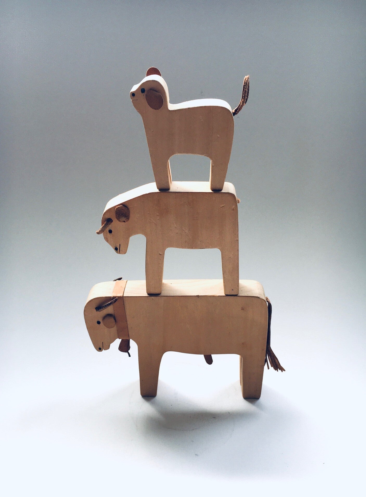 Vintage Midcentury Design Wooden Toy Deco Animal Stacking set, made in the 1970's. Set of 3 different size cows. Carved birch wood with leather details. All three are in very good condition, the middle bull has it's tail broken. The largest cow measures 15,5cm x 11cm x 3,5cm.