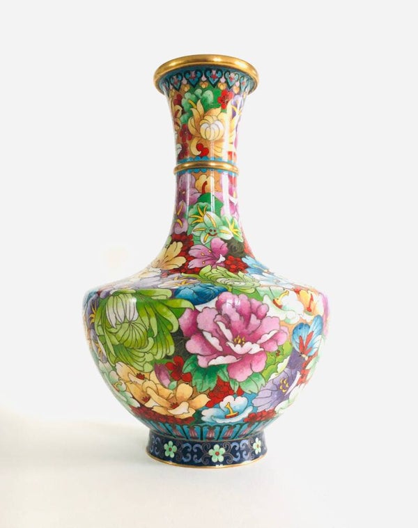 Vintage Midcentury Illustrated Chinese Cloisonné Enamel Vase set, made in China 1960's. Flowers all over in rainbow colors with gold trim. An original mirrored pair. Both are in very good condition, old stock. Each vase measures 20cm x 20cm x 31cm.