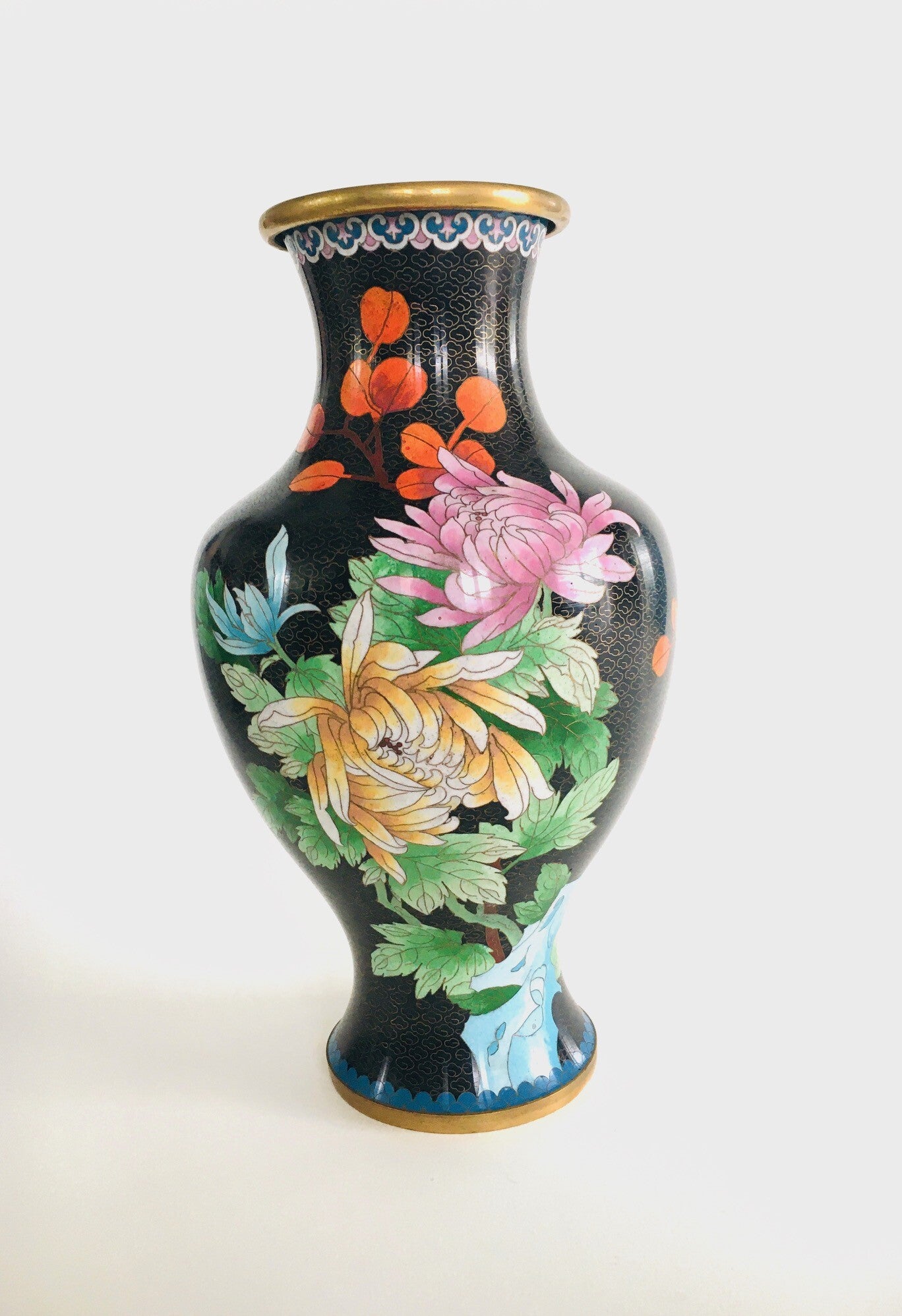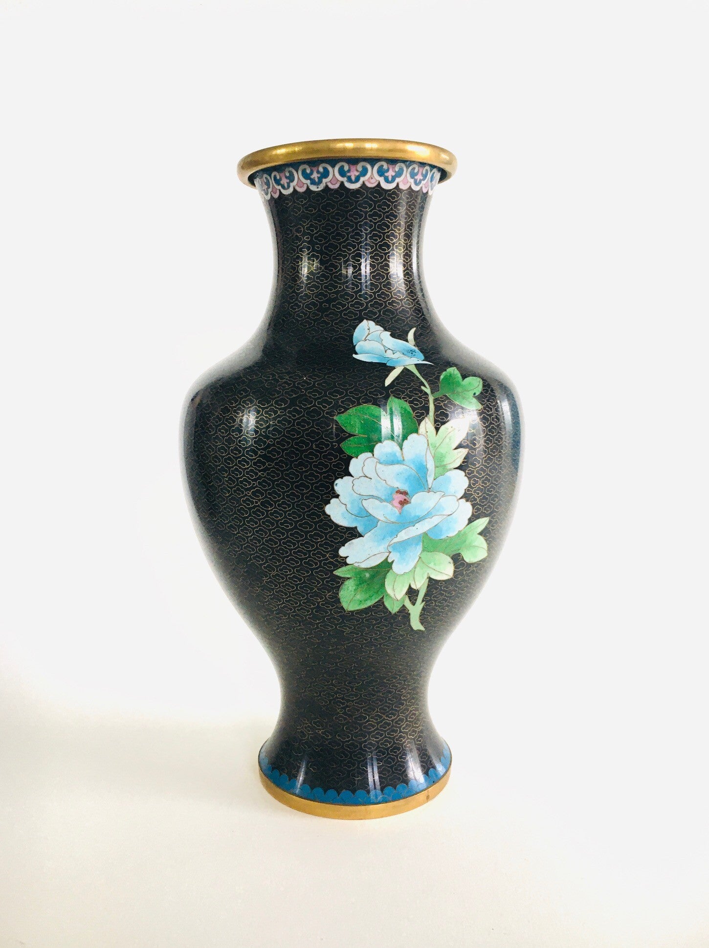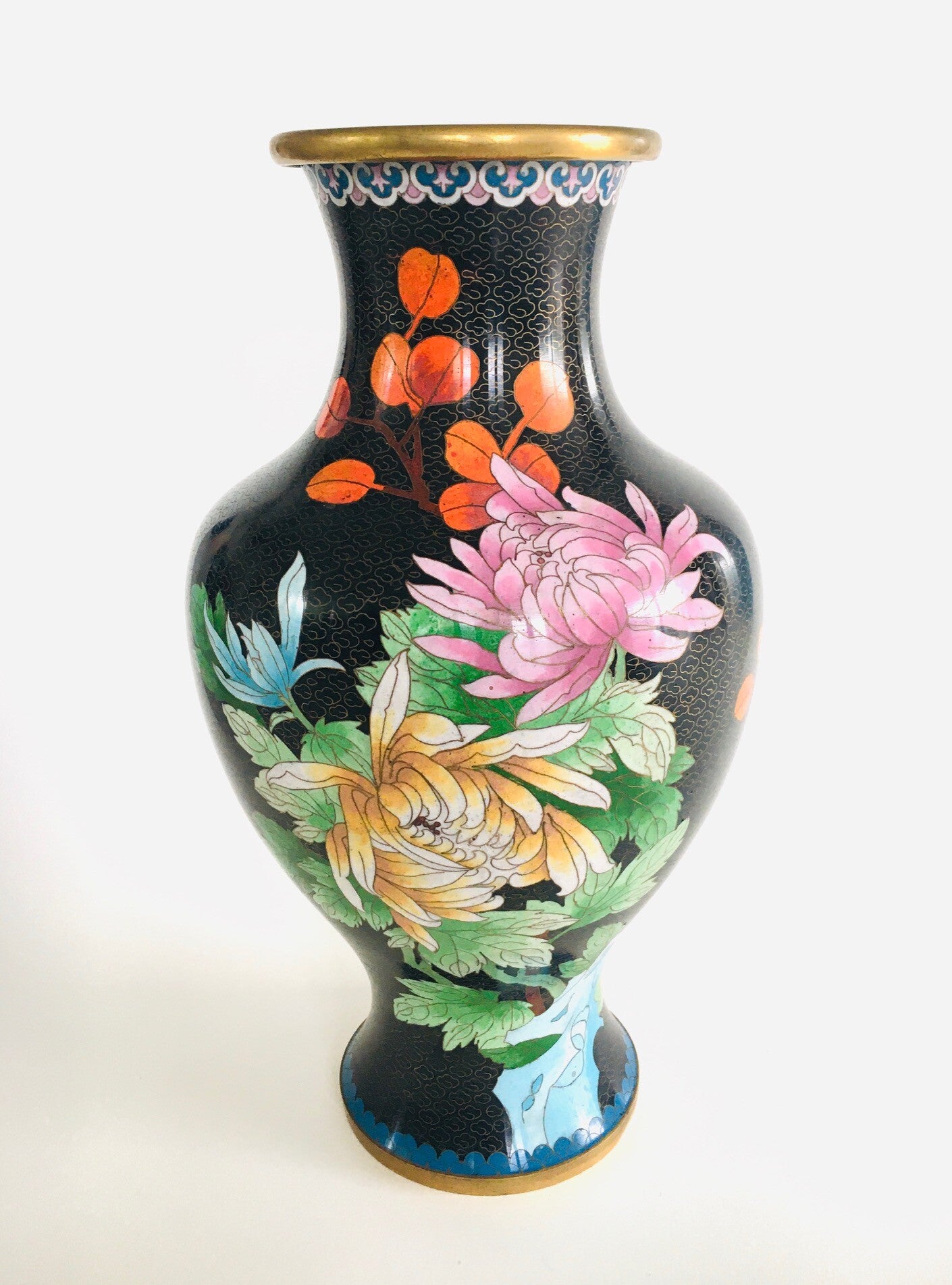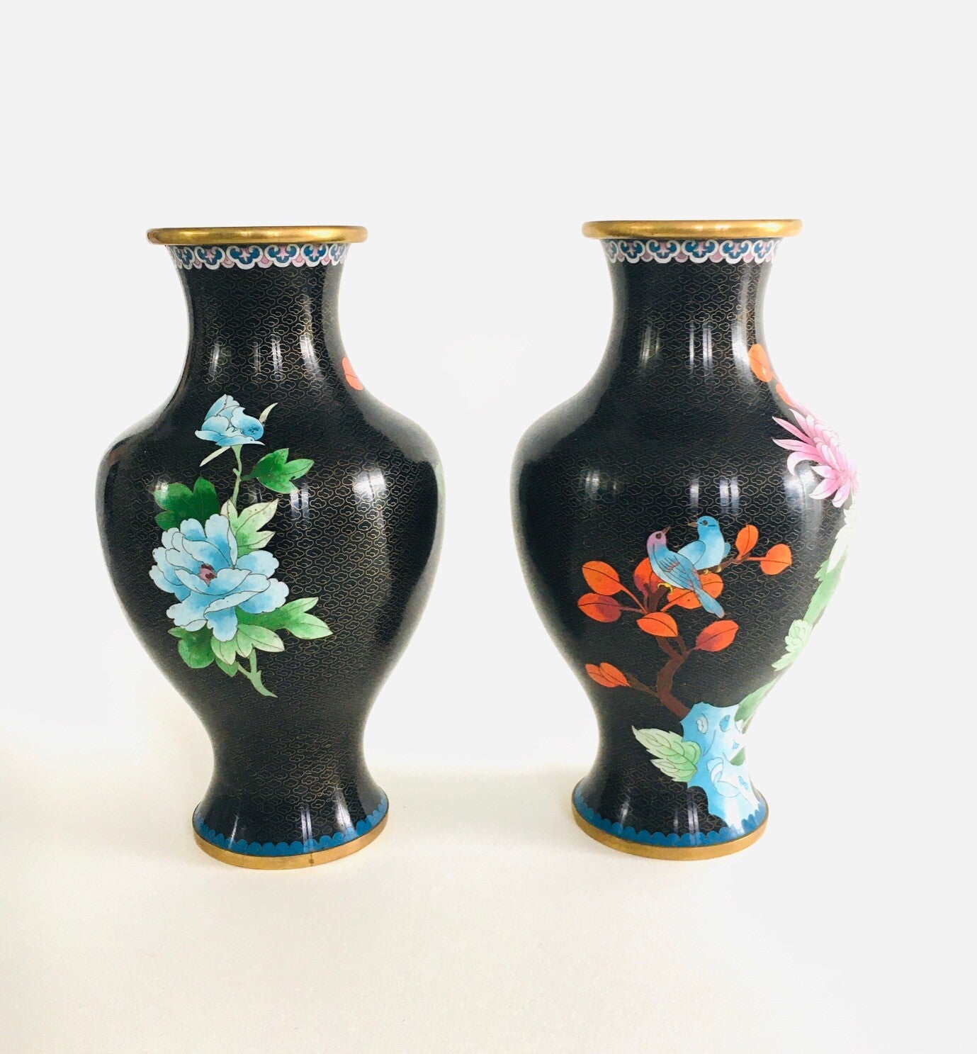 1960's Large Black Flower Illustrated Chinese Cloisonné Enamel Vase set