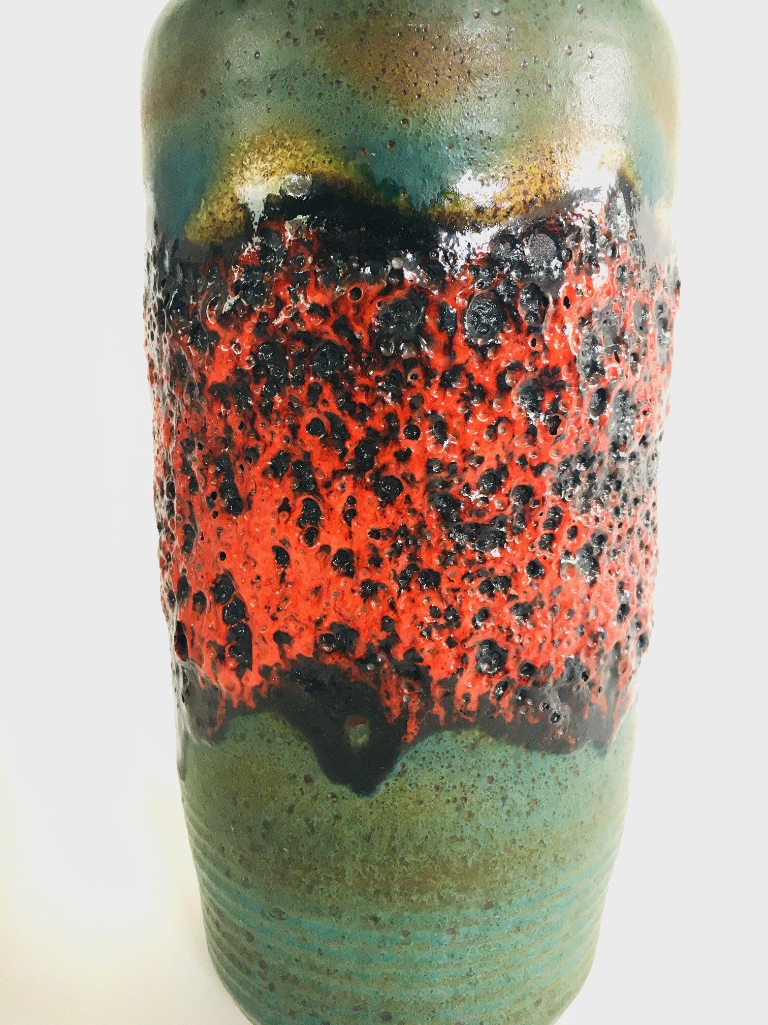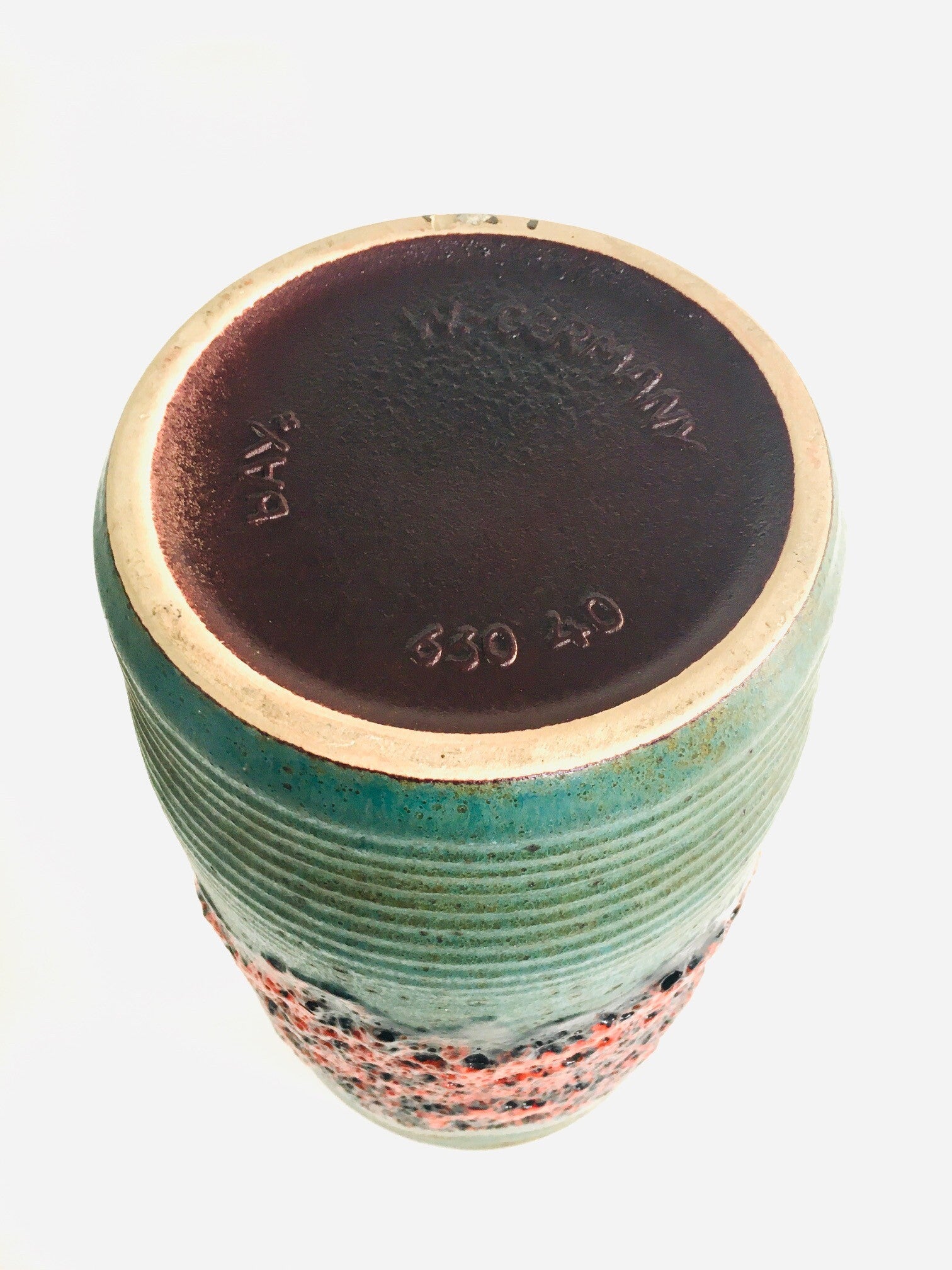 Vintage Midcentury Modern Art Studio Pottery Lava Vase by Bay Ceramic, West Germany 1960's. Model 630-40. Green glazed pot with red and black lava topping. In very good condition. Measures 18cm x 18cm x 40,5cm.