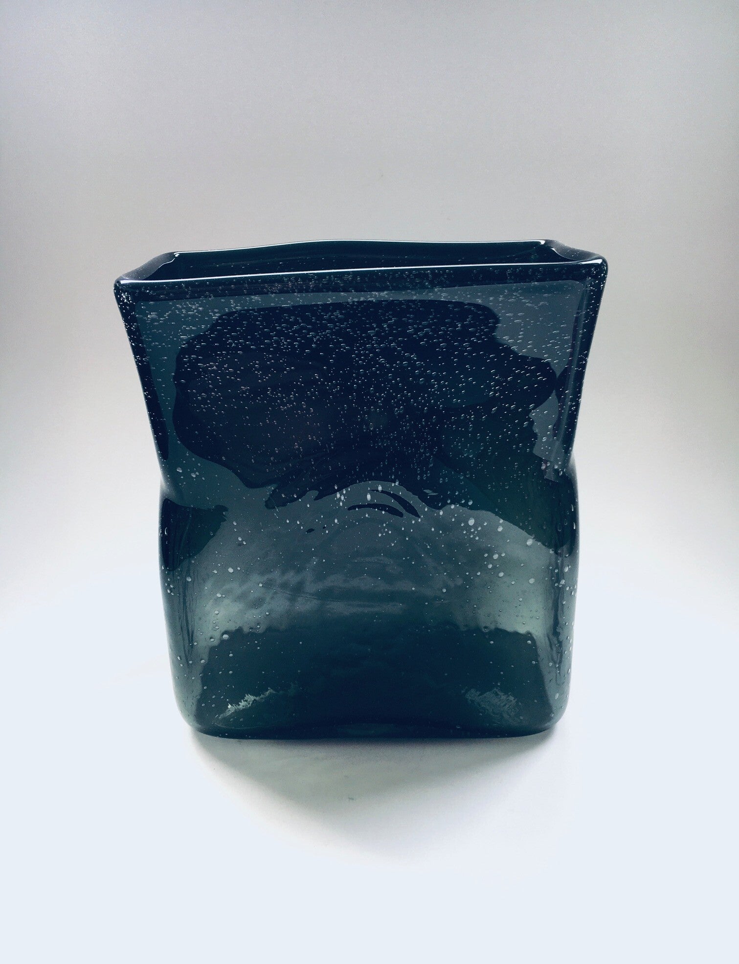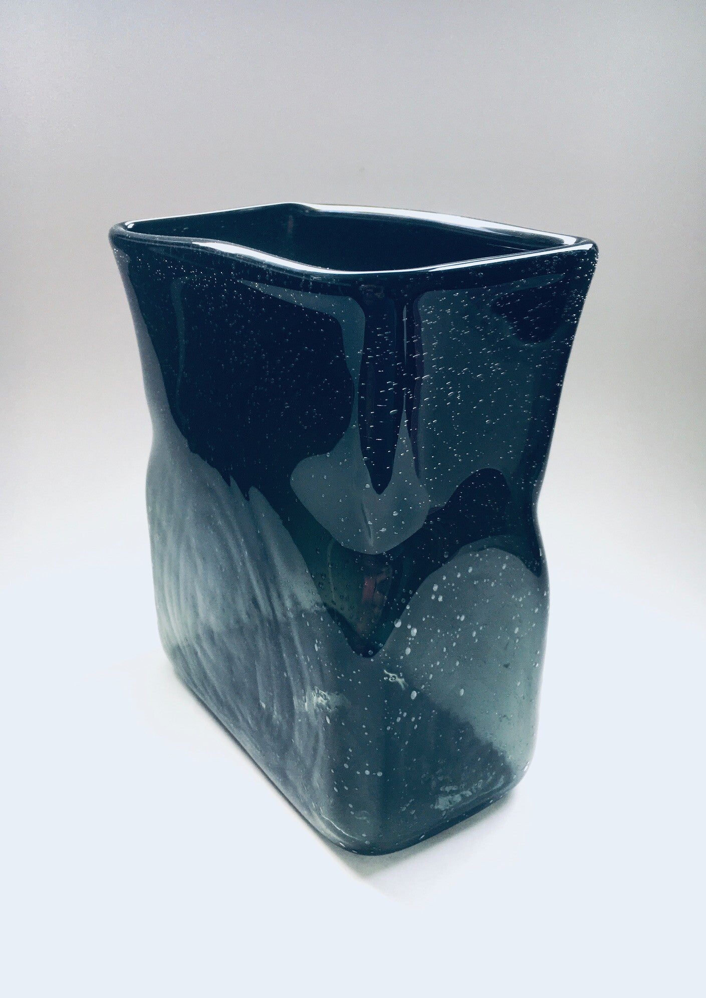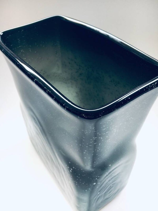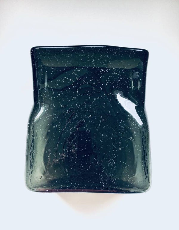 Vintage Handmade Art Bubble Glass Moss Green Square Vase. No markings. Blown molded vase. In very good condition. Measures 19cm x 11,5cm x 22cm.
