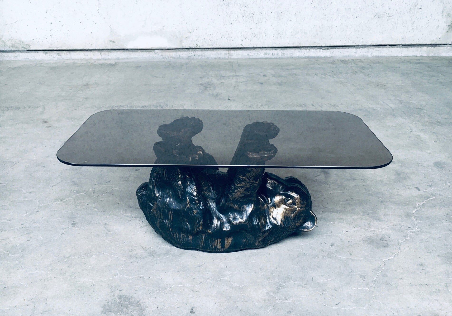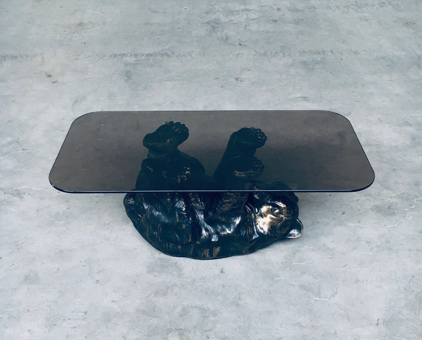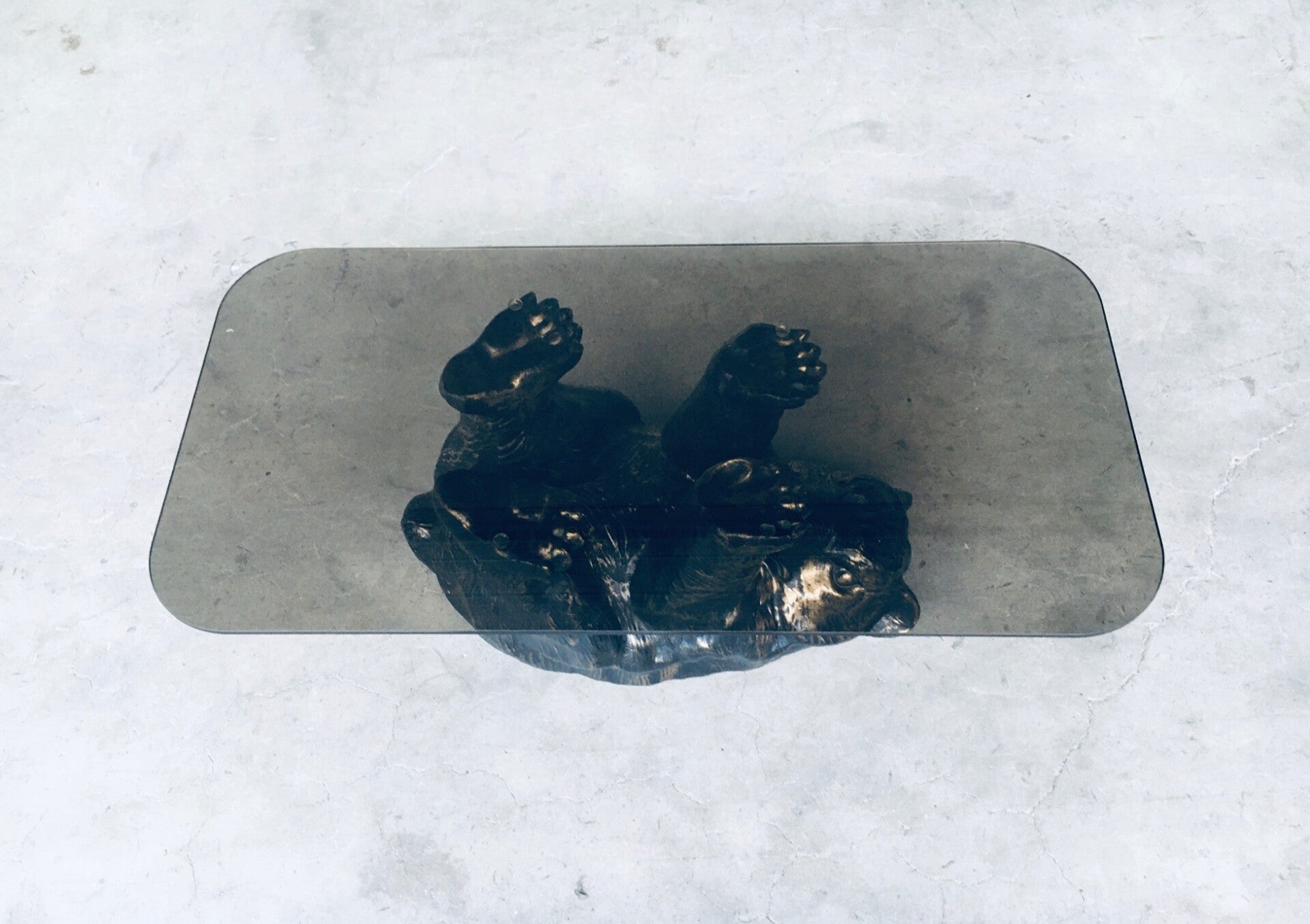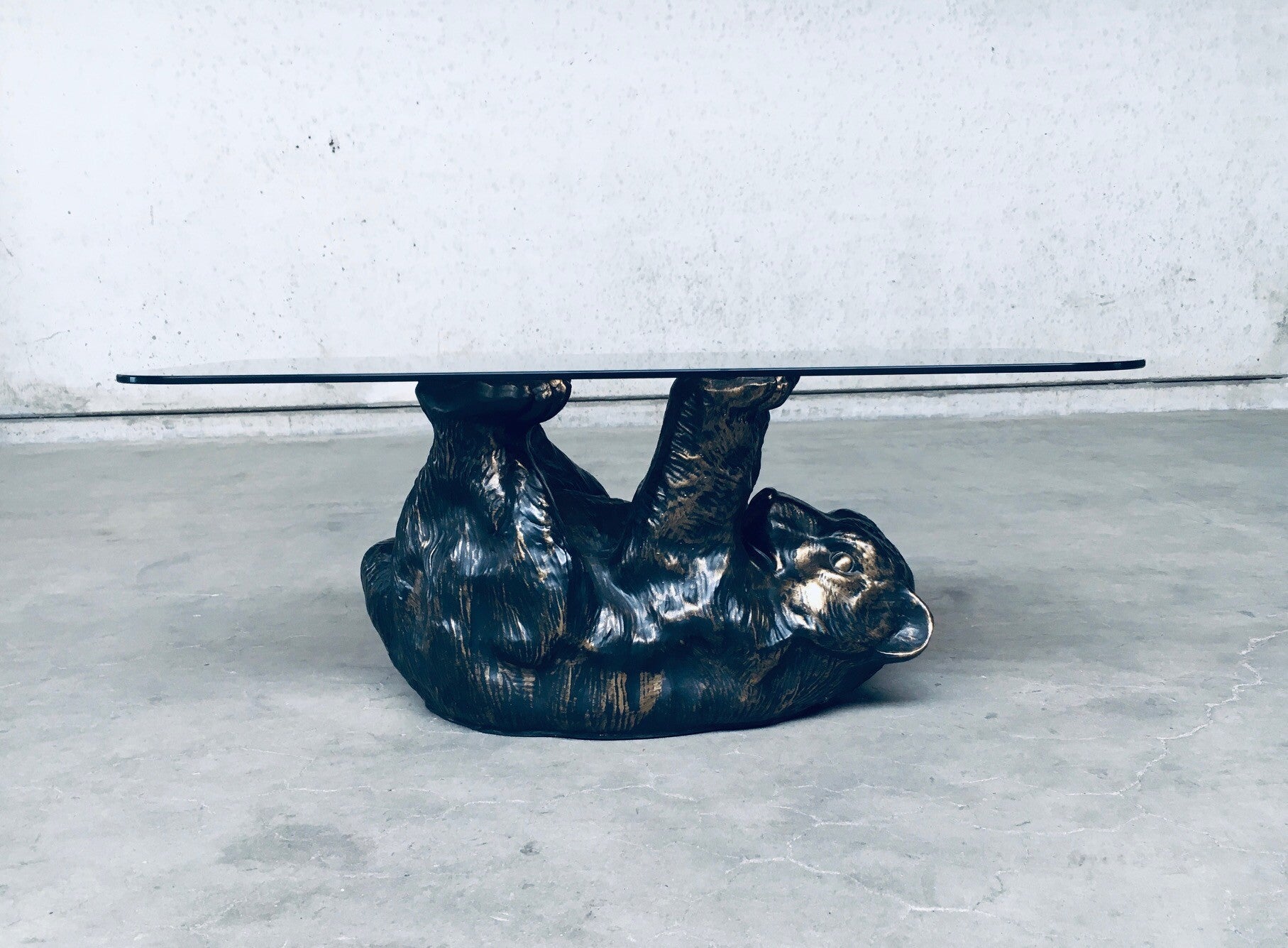 Vintage Midcentury Modern Unique Design Sculptural Black Bear Coffee Table. Made in the late 1970's - early 1980's. Molded Black Bear is finished in a Gold Bronze finish. Smoke glass rectagular top. Comes in very good condition. Measures 100cm x 50cm x 40cm.