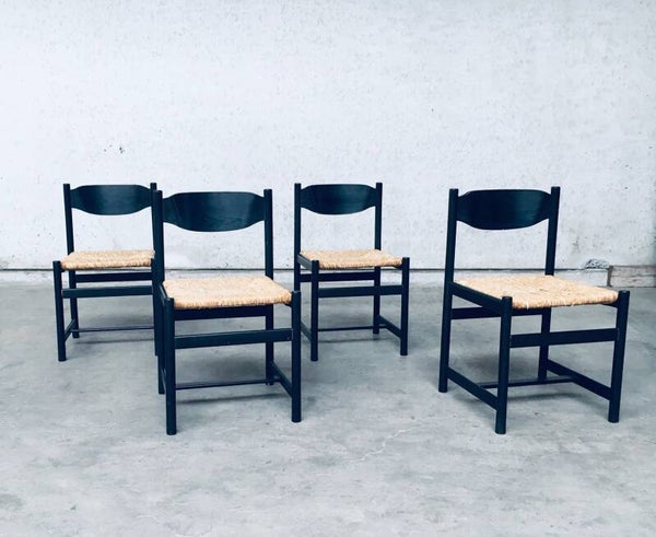 Vintage Midcentury Modern Design Black Stained and Paper Cord Dining Chair set of 4. Made in the 1970's. All chairs are in good condition with regular signs of age. Some tiny paint spots on the black frame and paper cord seats. Each chair measures 45cm x 77,5cm x 44cm.
