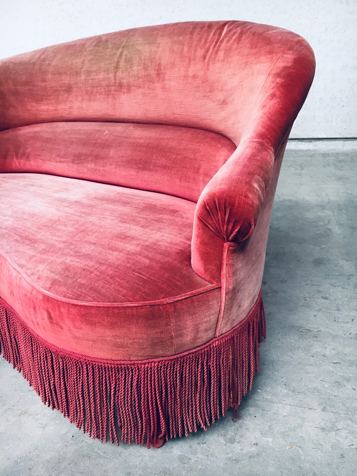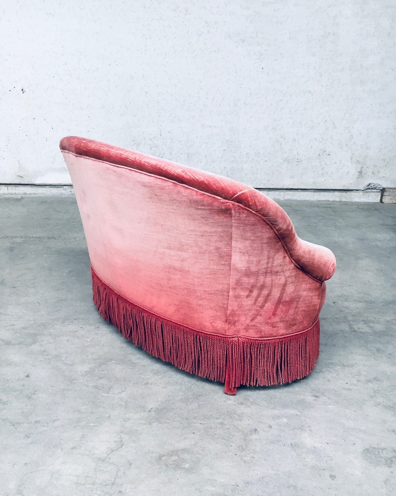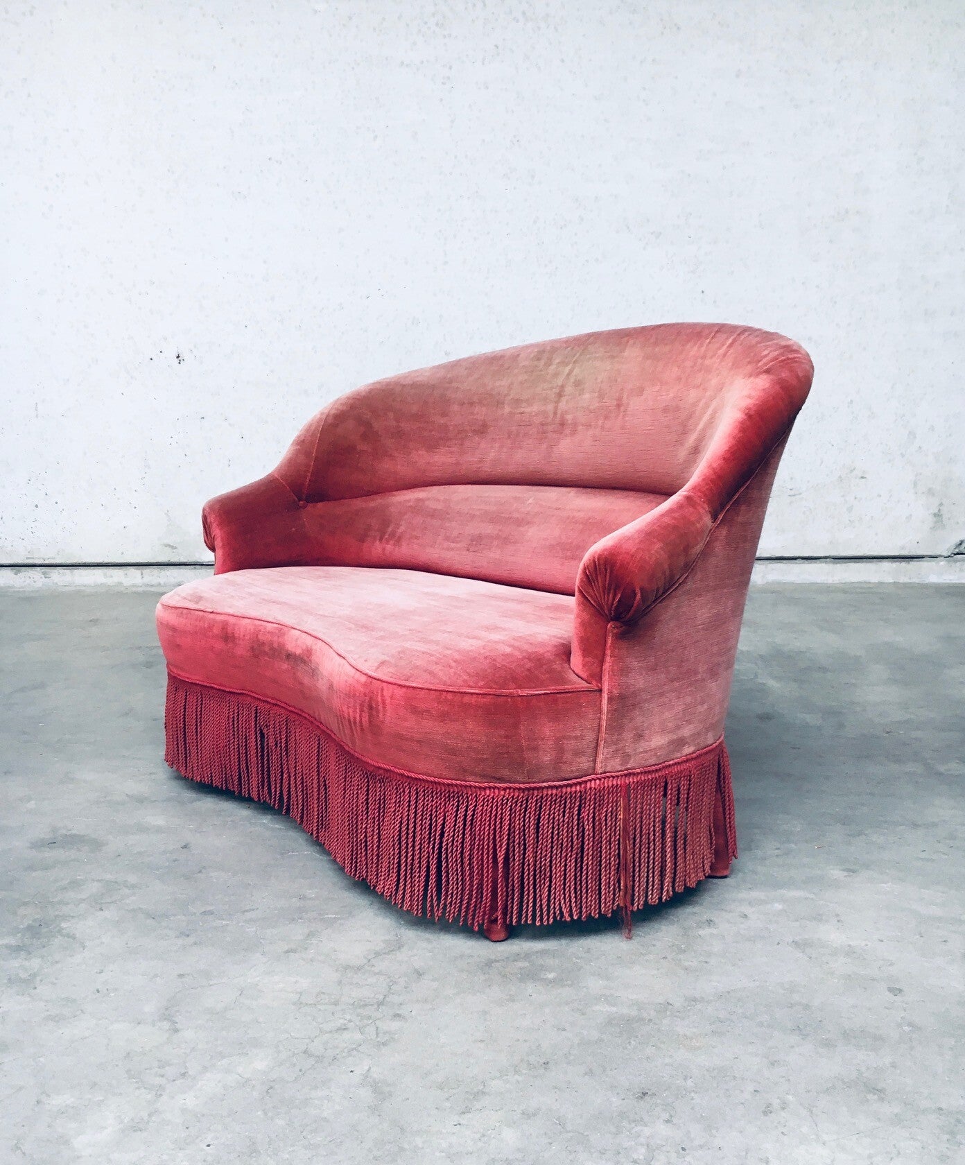 Vintage Midcentury Hollywood Regency Style Velvet 2 Seat Sofa with fringe in Red / Pink, Belgium 1950's. Curved back and seat. Feet are also covered in velvet fabric. In good original condition. Velvet has color loss and wear, see pictures. Measures 140cm x 87cm x 78cm.
