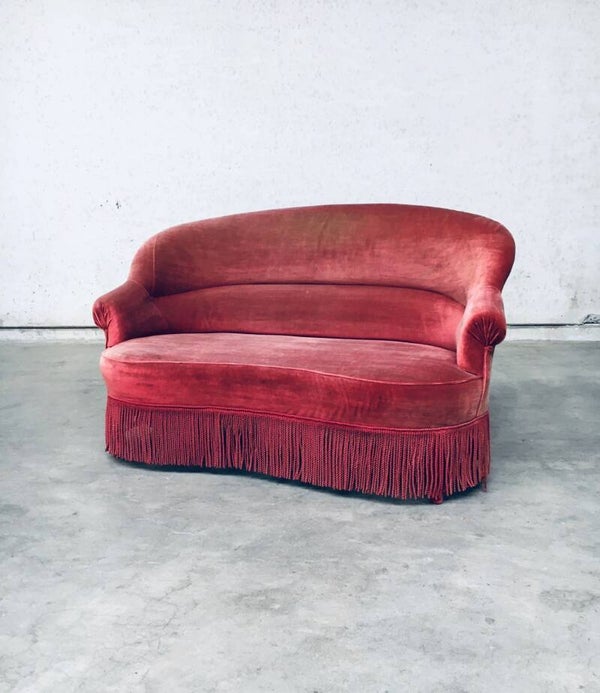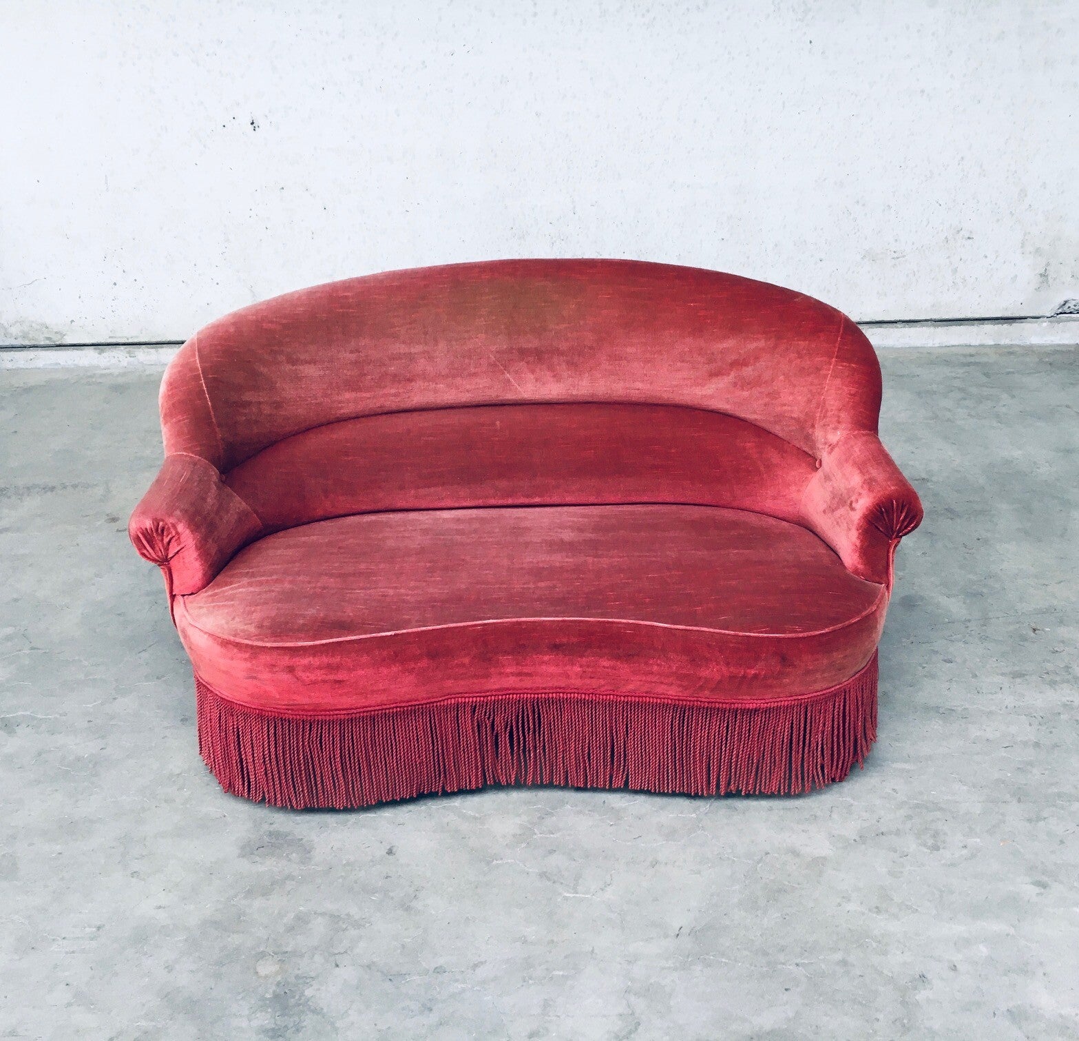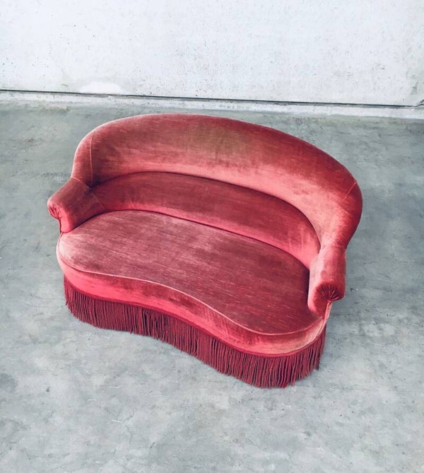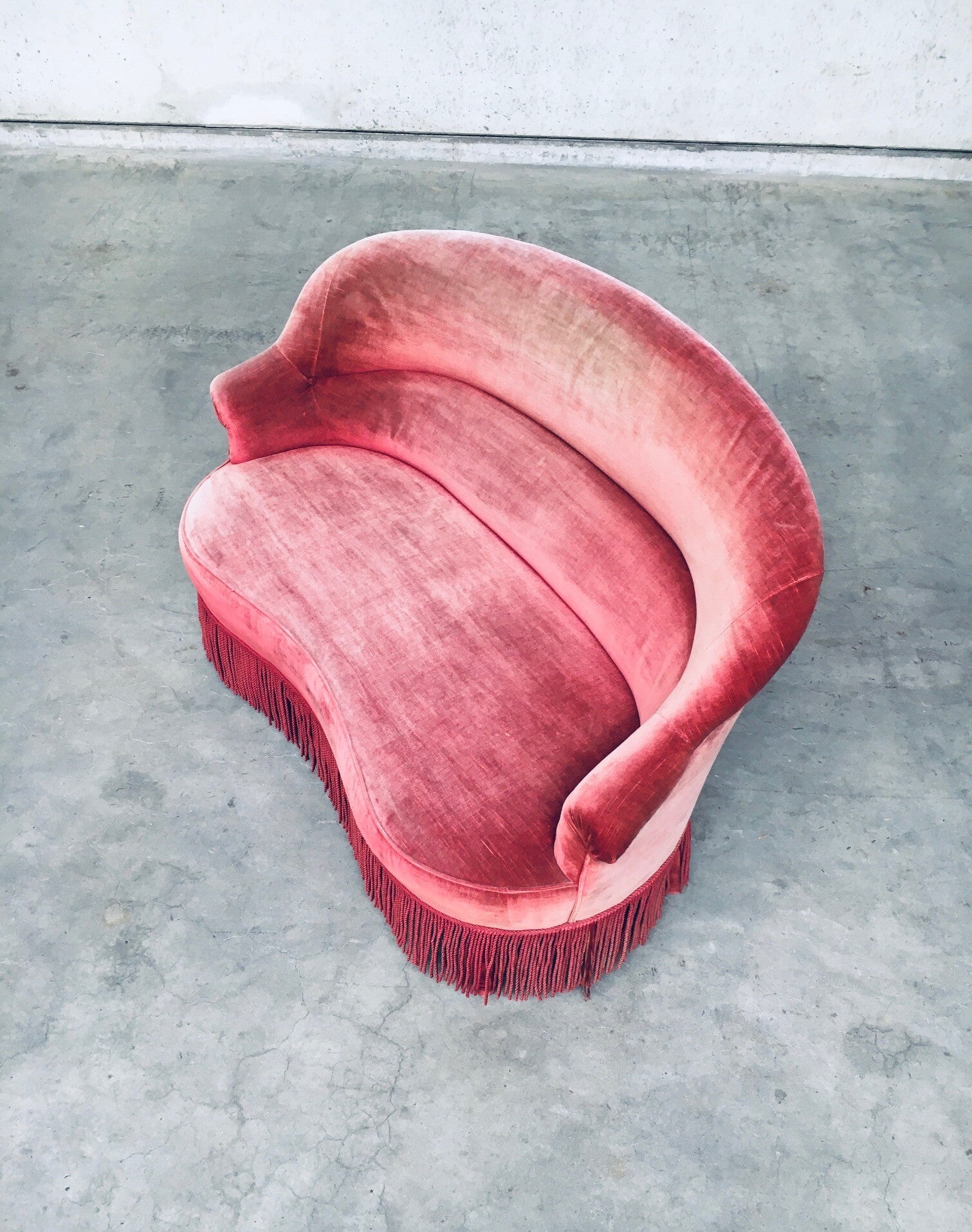 Vintage Midcentury Hollywood Regency Style Velvet 2 Seat Sofa with fringe in Red / Pink, Belgium 1950's. Curved back and seat. Feet are also covered in velvet fabric. In good original condition. Velvet has color loss and wear, see pictures. Measures 140cm x 87cm x 78cm.
