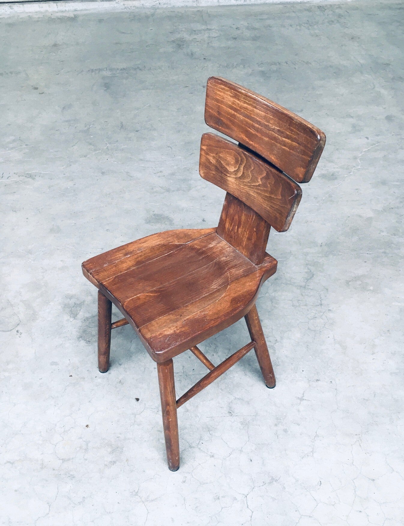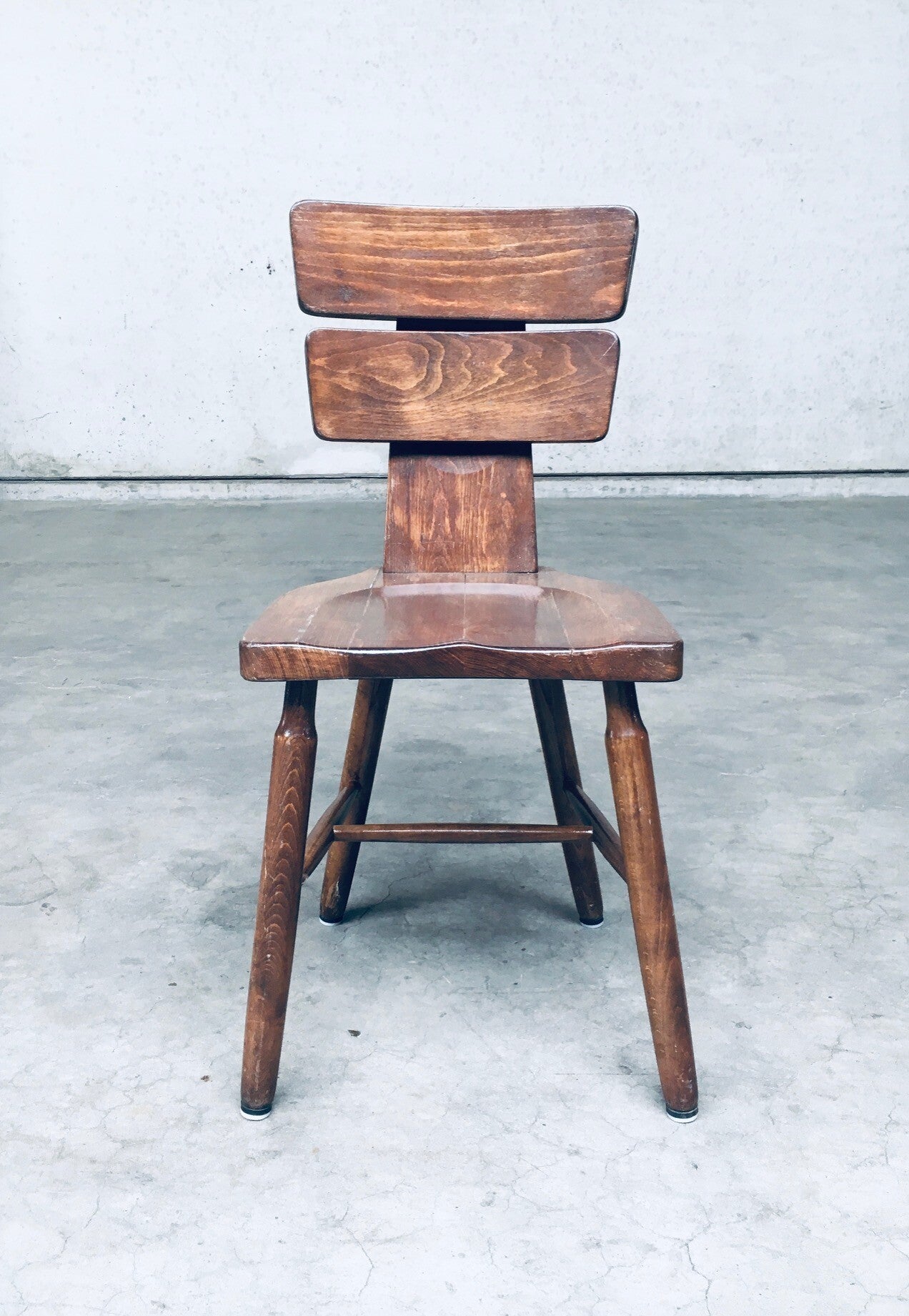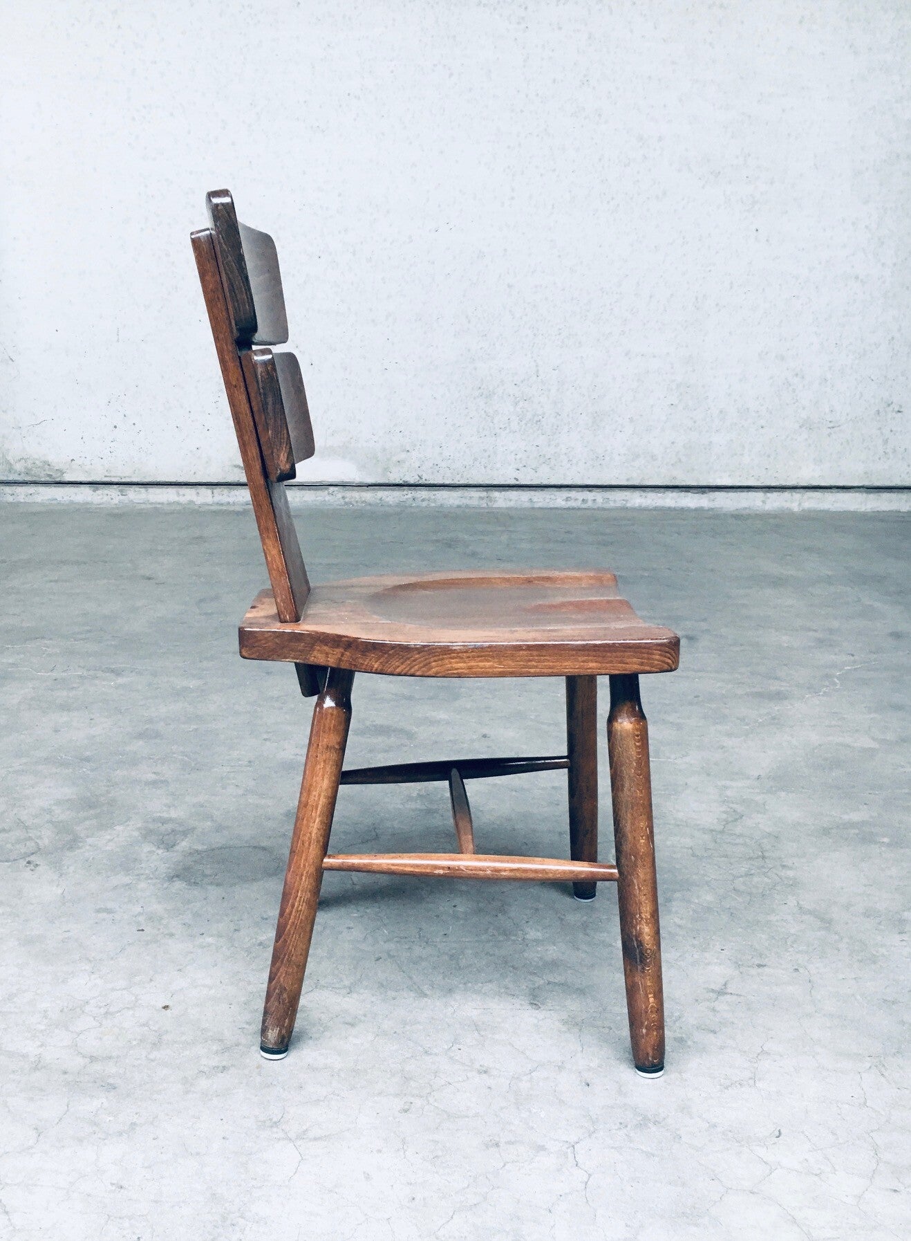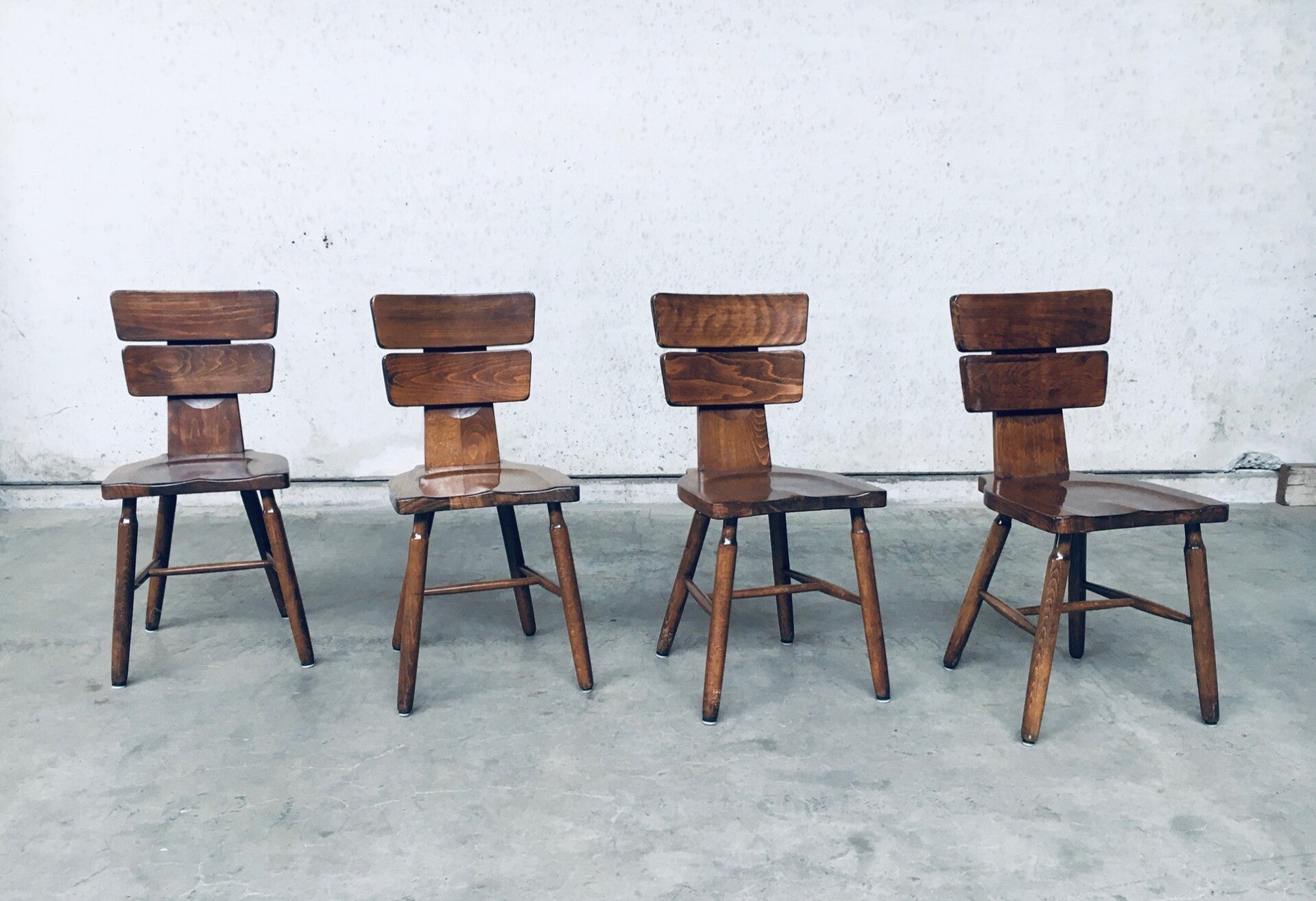 Vintage Brutalist Design Pub Café Dining Chair set of 4, made in Belgium 1960's. Varnished stained birch wood constructed chairs. All are in good condition with nice patina from their age and use which gives them extra character. Each chair measures 40cm x 87cm x 44cm.