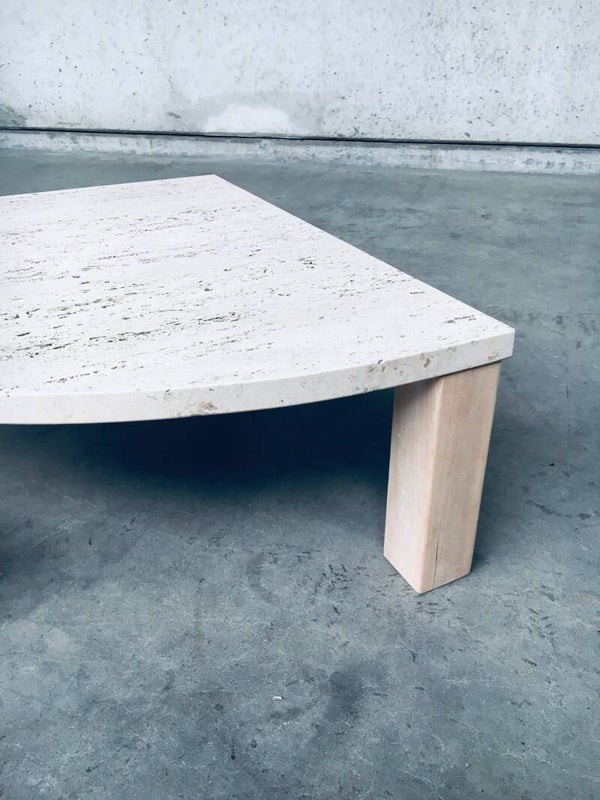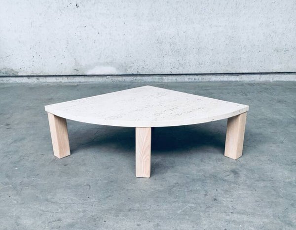 Vintage Midcentury Modern Italian Design Sofa Edge Travertine Quarter Side Table, Italy 1970's. Quarter round thick beautiful travertine table top on beech wooden frame. Can be used as a sofa edge or as a free standing side table. In very good condition. Unfinished Beech wooden frame has been sanded. Measures 80cm x 30cm x 80cm.