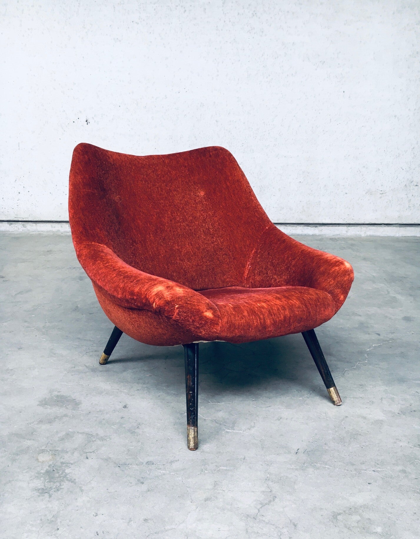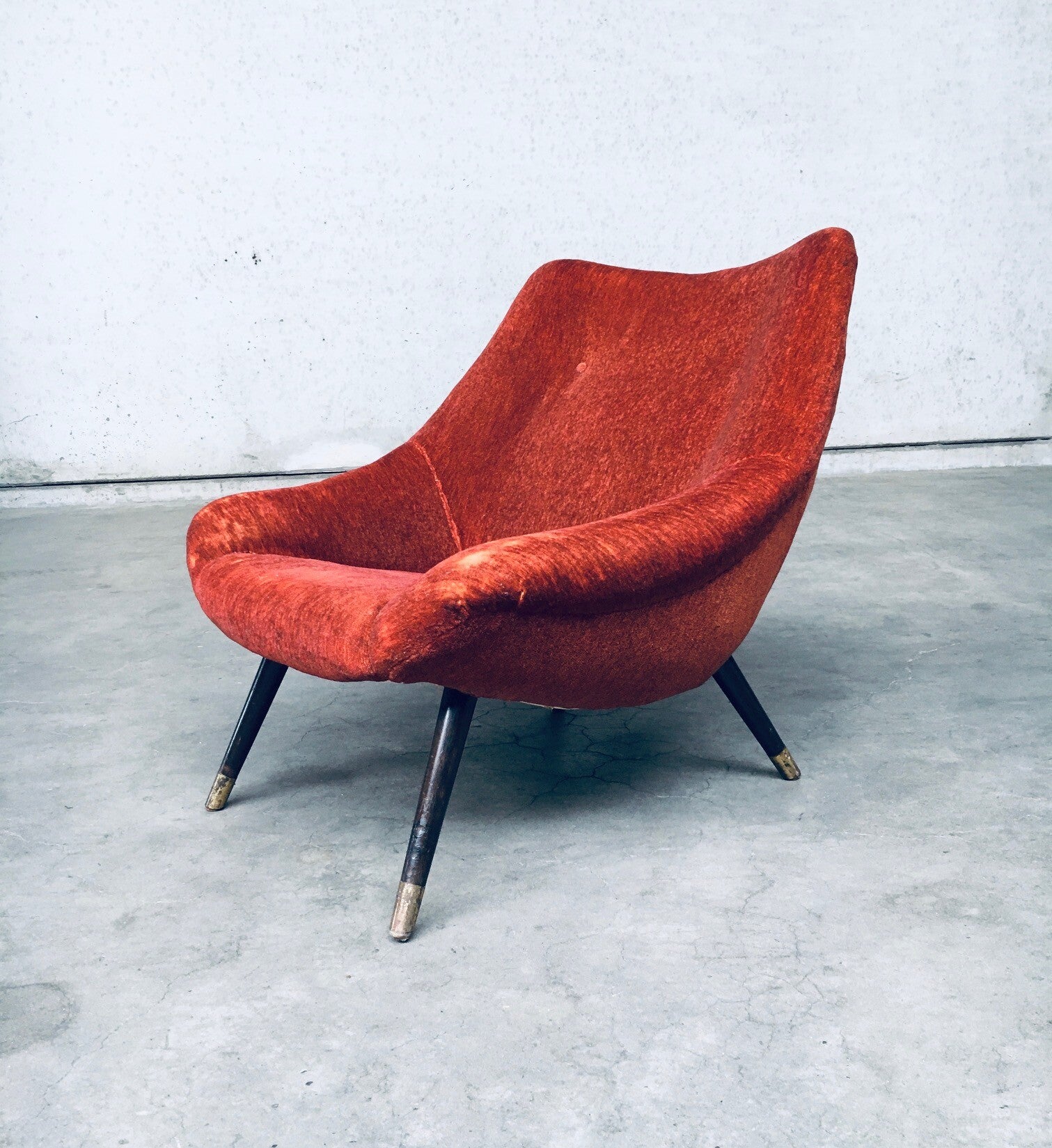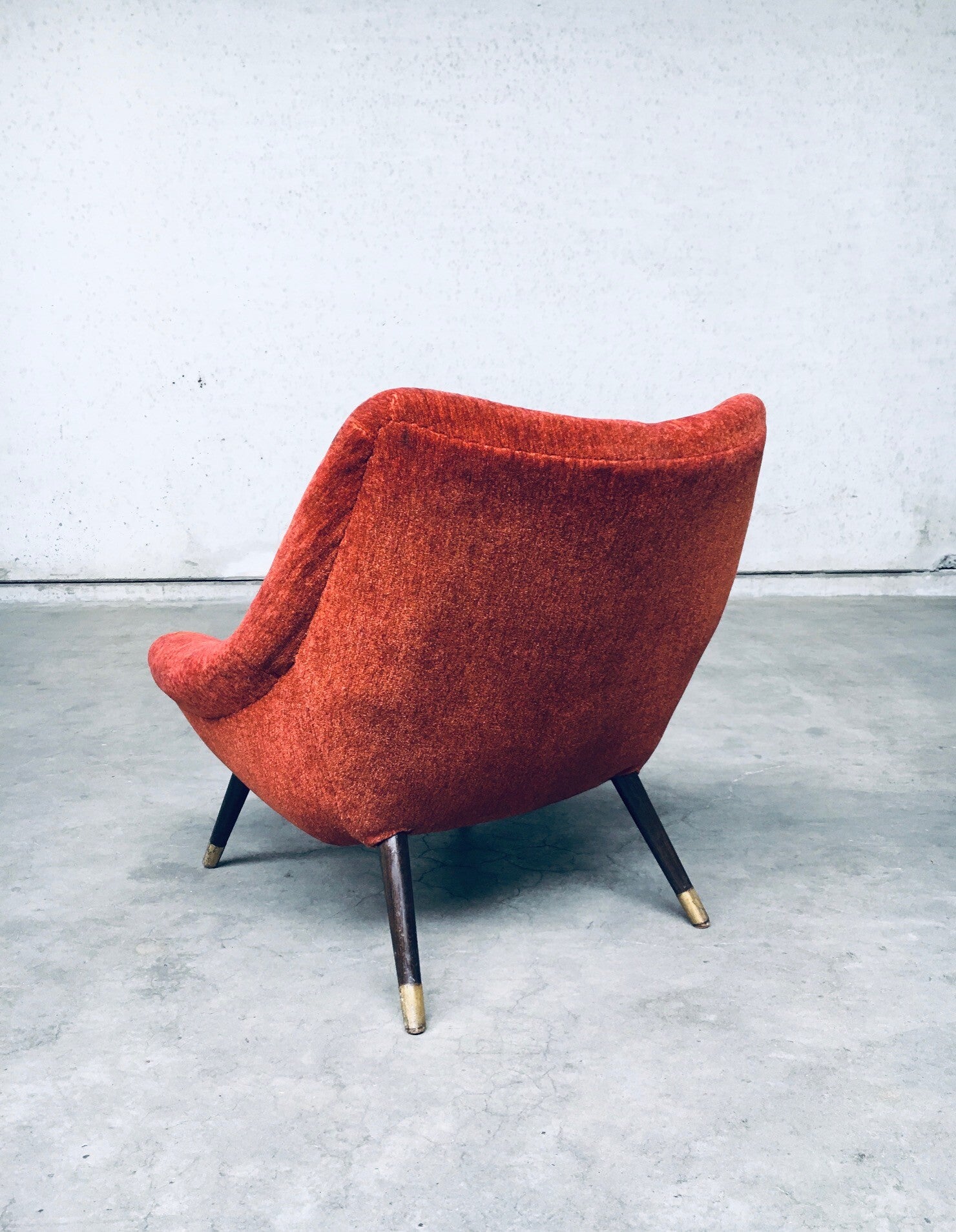Vintage Midcentury Modern Belgian Design Arm Chair, Side Chair, made in Belgium 1950's. All original wonderful side arm chair in an orange velvet like fabric on dark wood stained feet with brass trim. Well used condition with beautiful patina. See pictures for condition. Measures 77cm x 73cm x 80cm.
