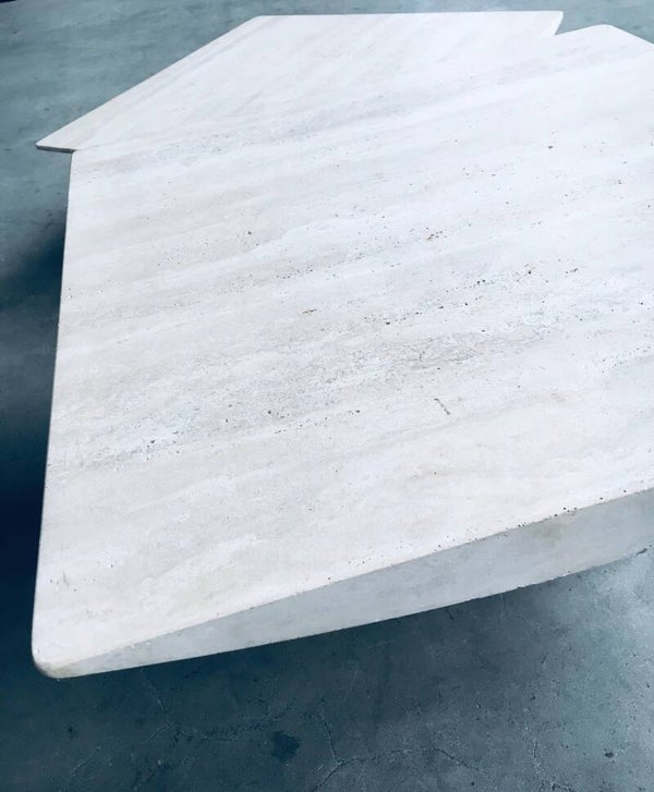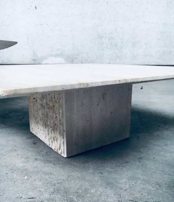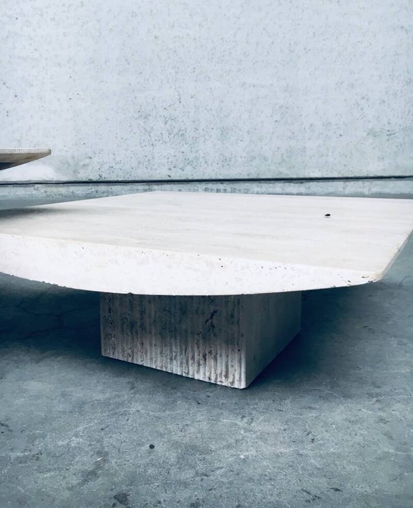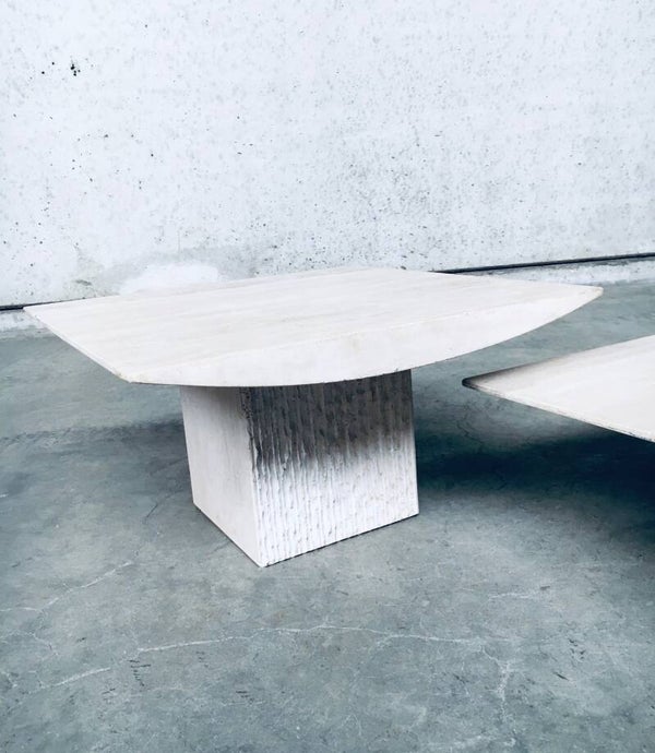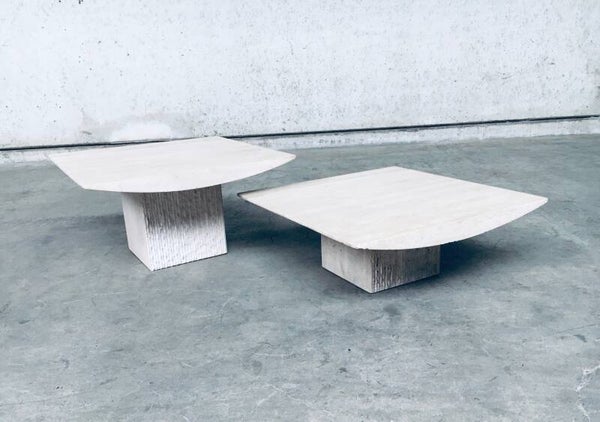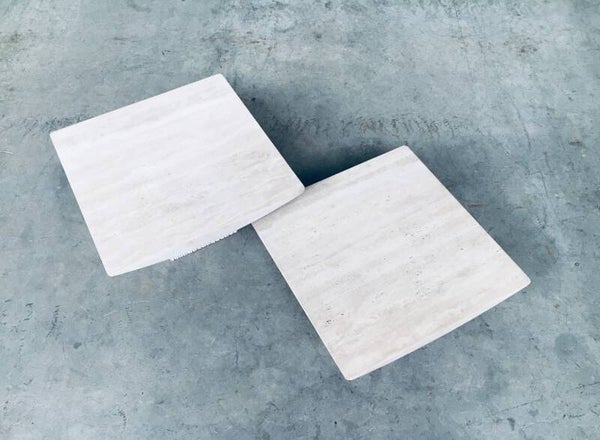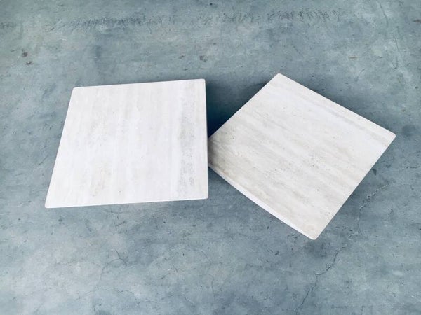 Vintage Italian Design Travertine Side Table Set of 2, Italy 1980's. Square cut travertine marble side tables. 2 heights. Top has two sides flat cut and 2 sides half rounded cut. Base has 2 sides flat finished and 2 sides rough stripe cut finished. Both are in good condition. Some minor edge wear and 1 corner on the lowest model minor damage. Measurements: High model: 60cm x 32cm x 60cm - Low model: 60cm x 22cm x 60cm.