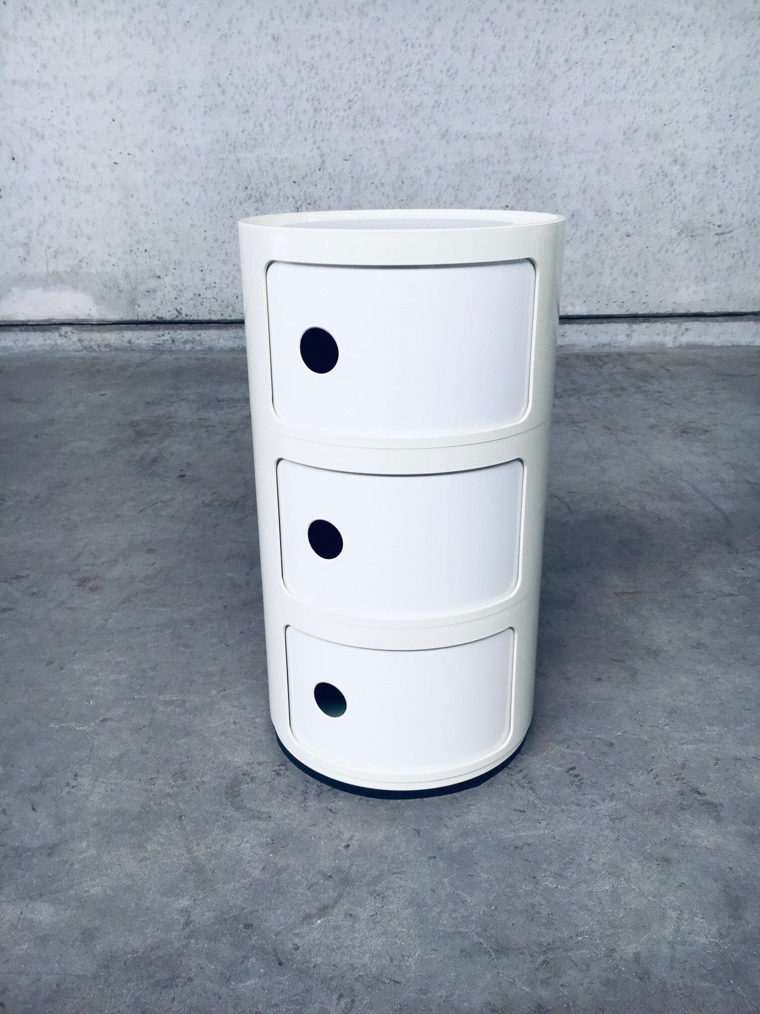 Vintage Midcentury Modern Italian Design Original Componibili 3 tier Storage in white by Anna Castelli for Kartell, Italy 1970's. Designed by Anna Castelli Ferrieri in 1969, the Componibili storage unit from Kartell is a design classic. The storage unit is suitable for various uses and suits all kinds of decors. In very good condition. Ever so slightly discoulored, which is normal for it's age. Measures 58cm x 32cm x 32cm.