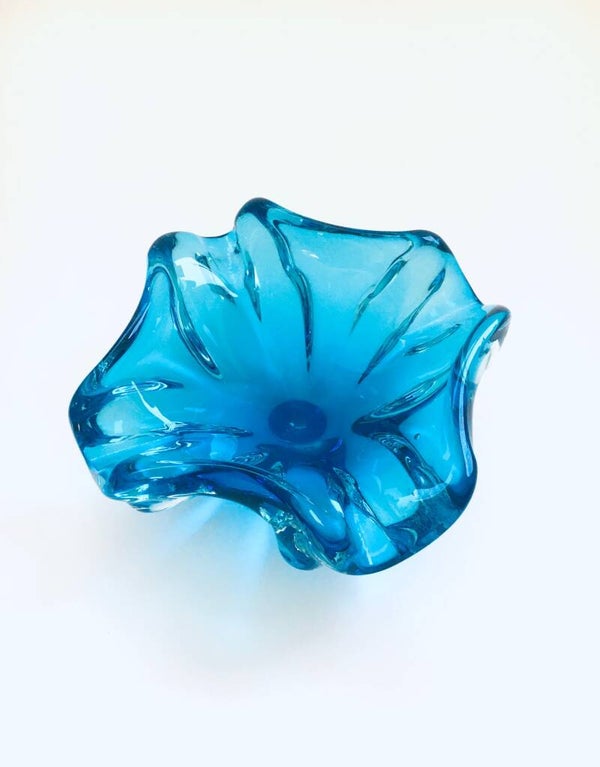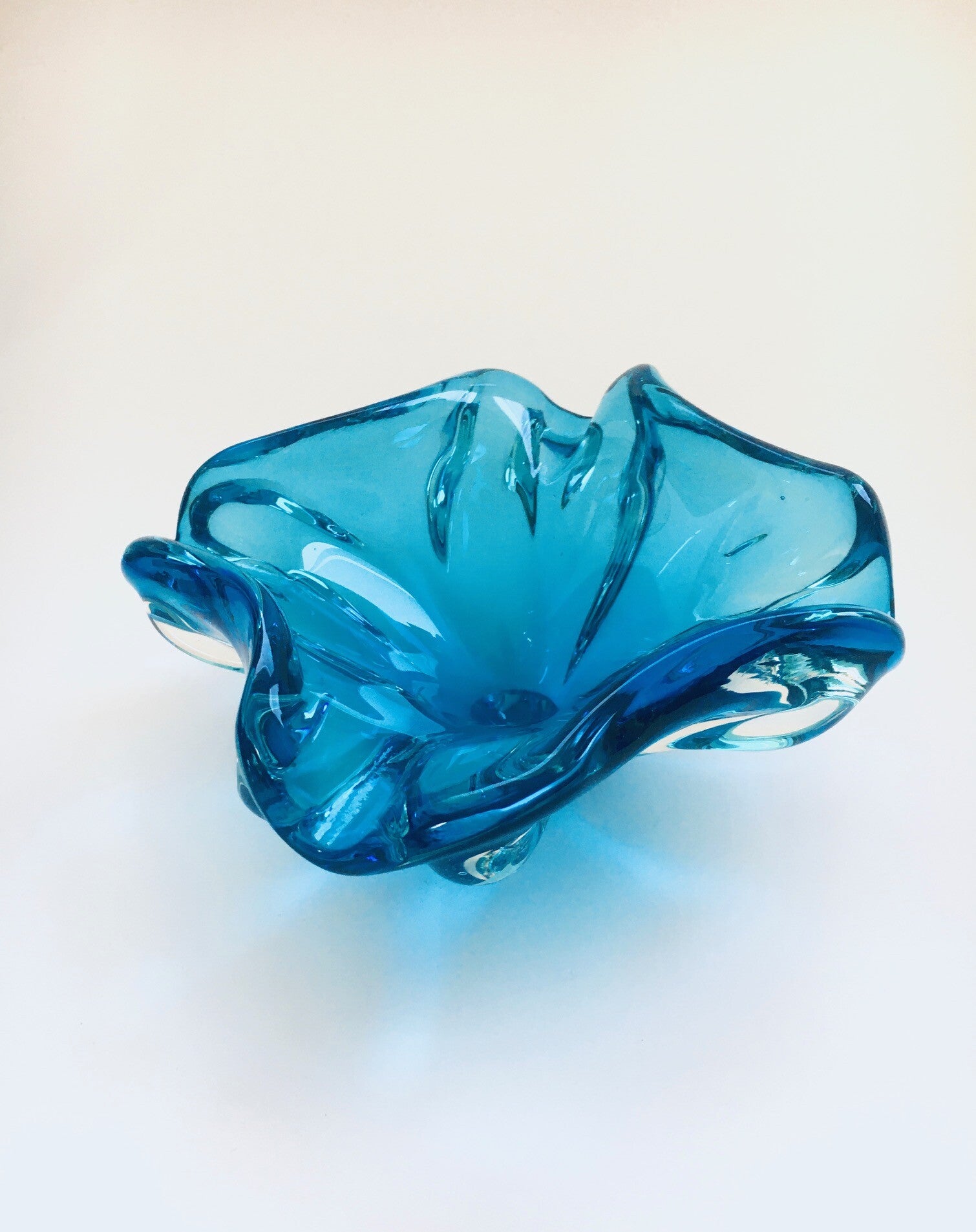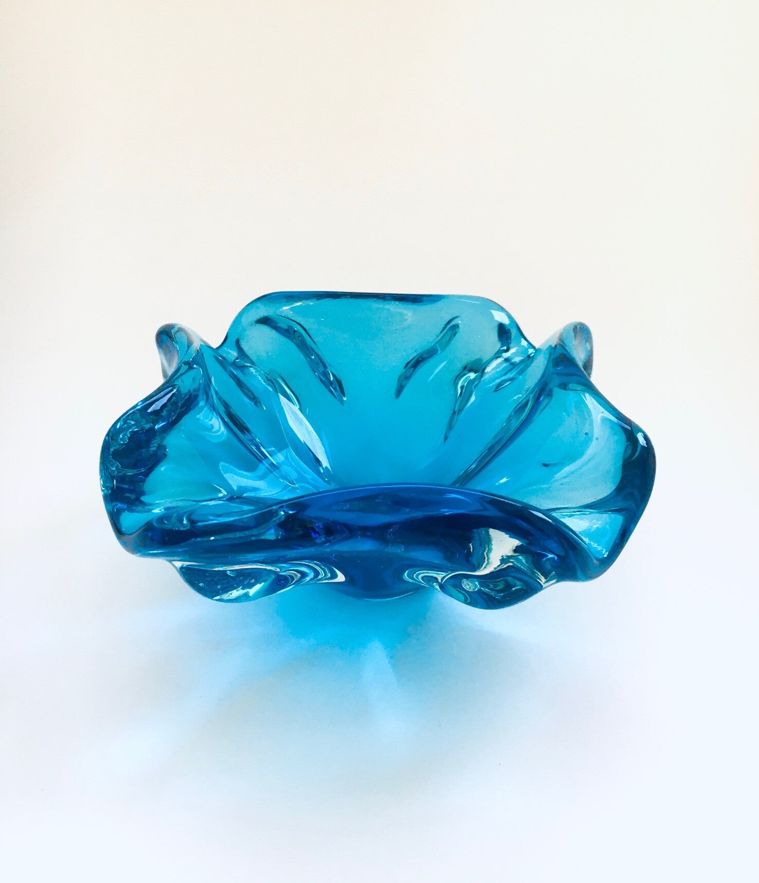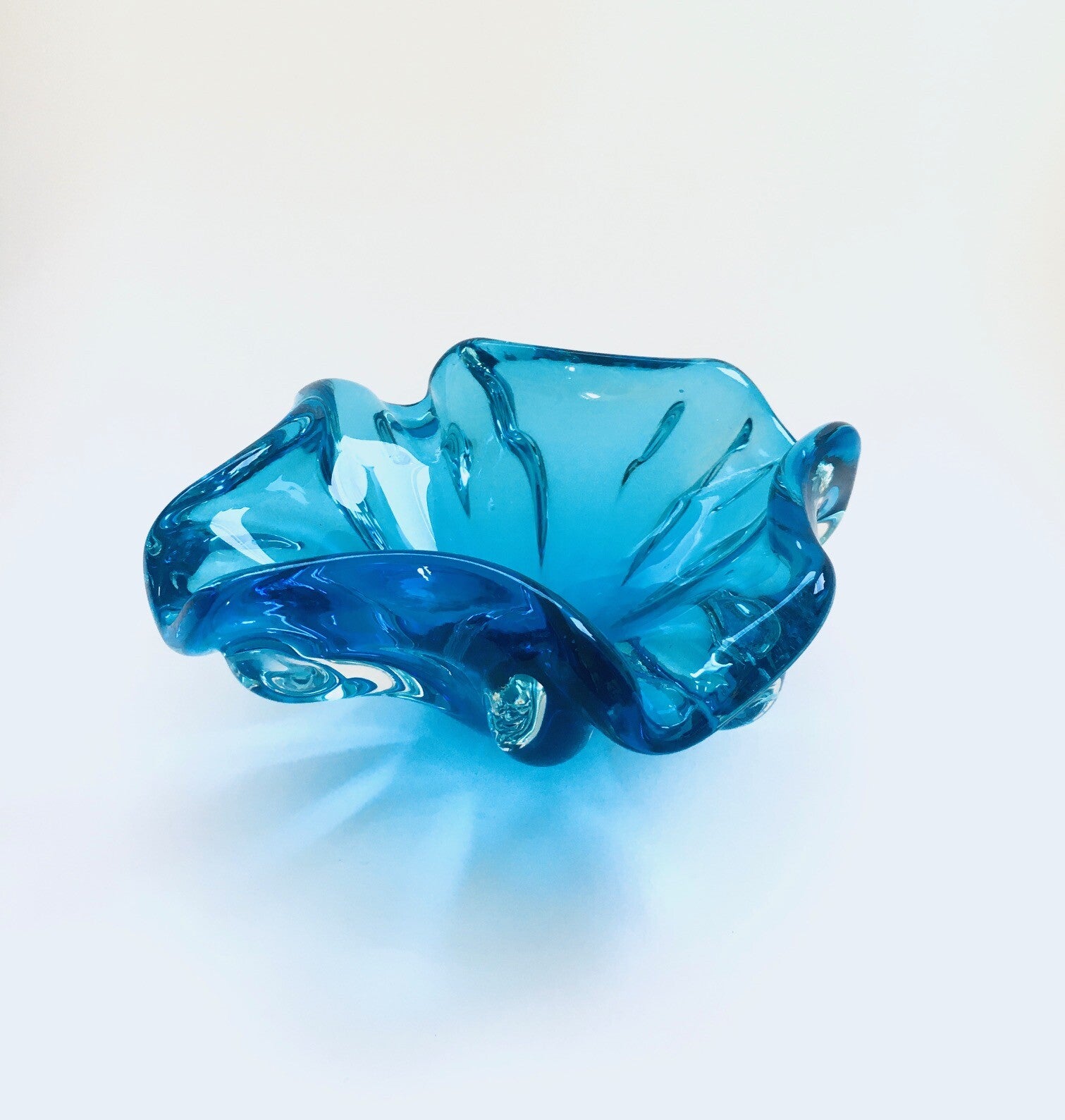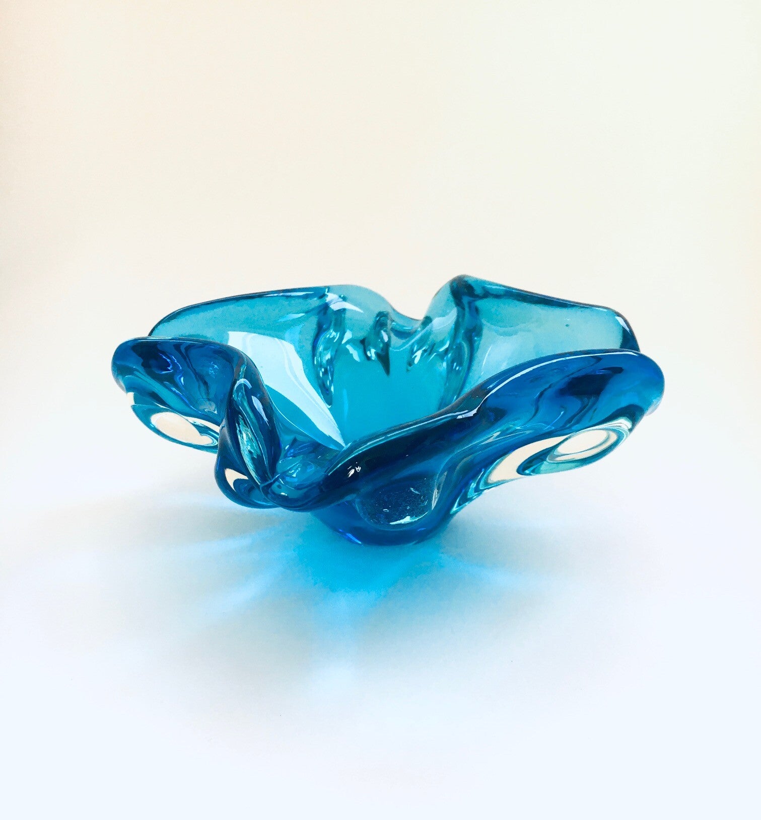 Vintage Bohemia Art Glass cyaan blue bowl, ashtray. Made in Czechoslovakia, 1960's. Free form shaped hand made glass bowl, in very good condition. Measures 17,5cm x 17,5cm x 7cm.